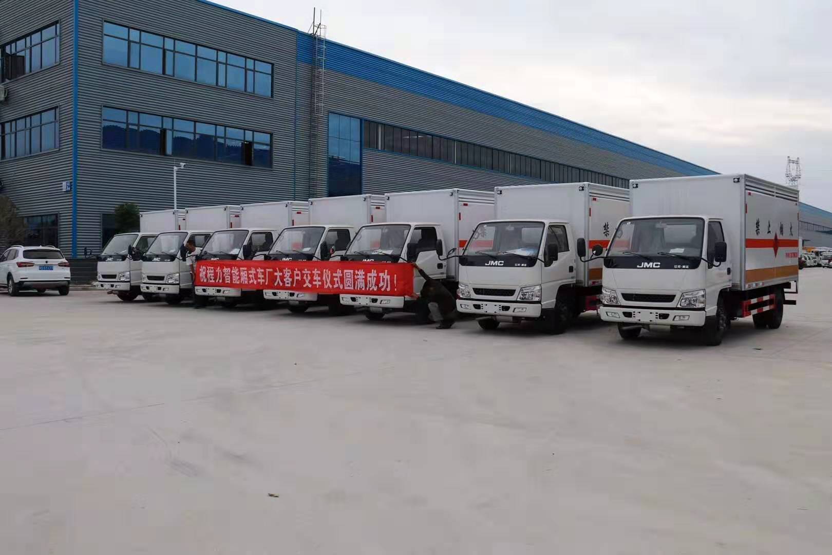 監利吳總訂購的5臺江鈴腐蝕品廂式運輸車發車