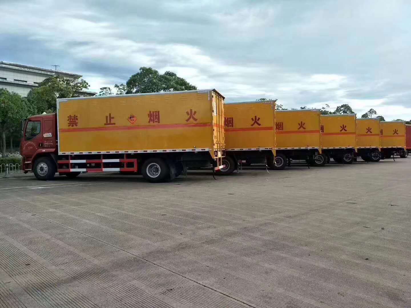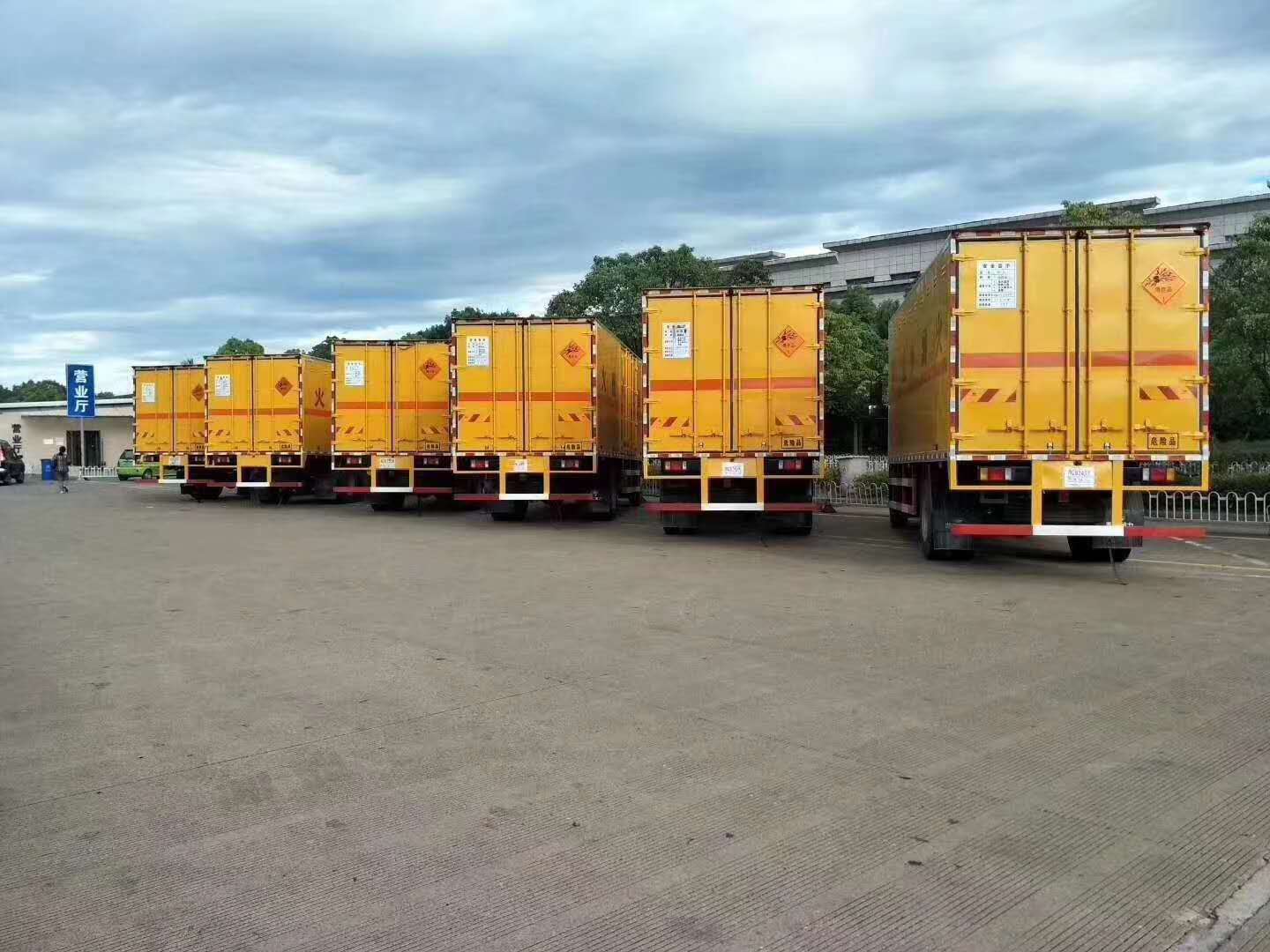 2)上裝配置:貨廂尺寸:6600×2400×2200(mm)。外飾冷軋鋼板,內飾鋁合金板,中間填充隔熱阻燃材料,(選裝側門和隔倉)廂體兩側上方設有防雨功能自然通風窗口,底部鋪有阻燃導靜電膠板,廂體側面裝有固定拉環,與捆綁帶使用捆綁貨物以避免移動。在車廂內頂部安裝感煙報警器,在門器框上方安裝有防盜報警器,廂體外側安裝示廓燈及滅火器支架,配置兩個滅火器,并有“嚴禁煙火”和“爆”等字樣,廂體周邊貼反光標識。后門貼有安全告示,危險品標牌。車輛尾部安裝兩條拖地導靜電膠帶,駕駛室頂部裝有安全三角燈。廂體顏色有:黃、白、灰色等可選;