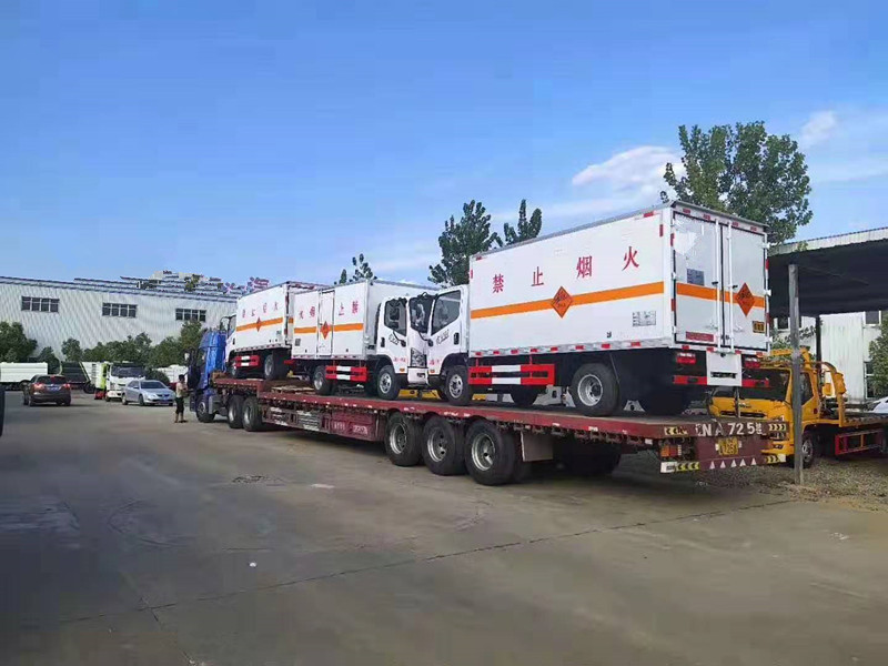 解放一直是北方人民非常青睞的產品,東北孫總因公司業務需求,在我司訂購了三臺解放虎V易燃氣體廂式運輸車,為了讓運輸更省事,孫總選擇了用拖車進行運輸,以下是具體實拍圖片: