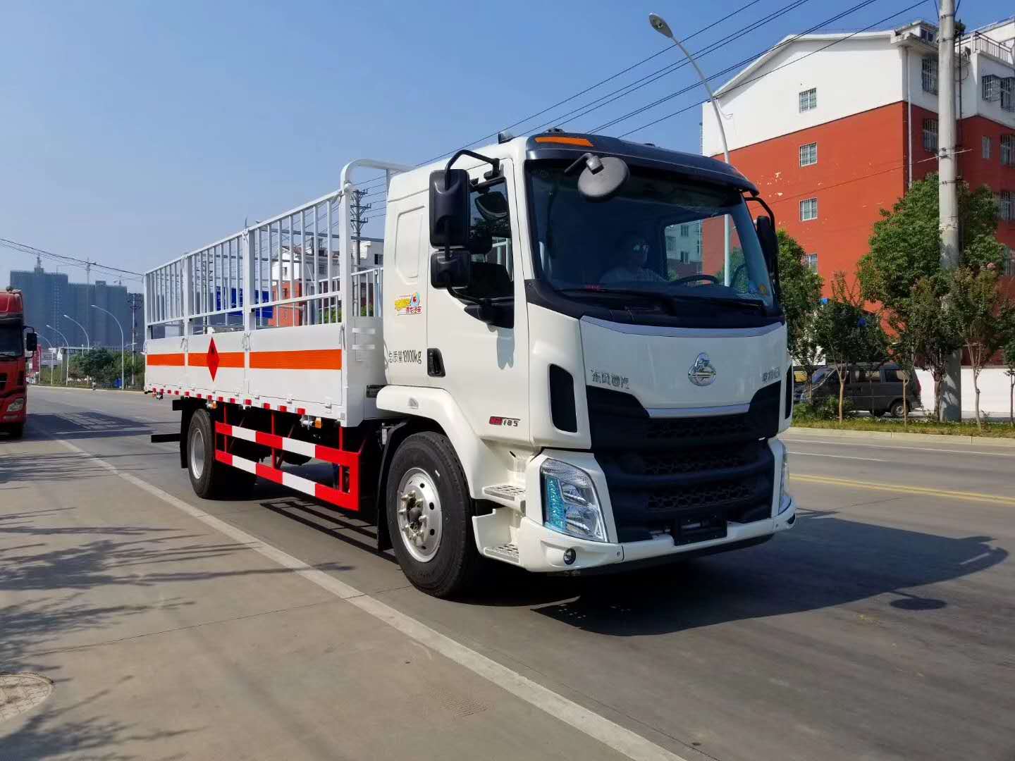 東風柳汽乘龍M3駕駛室,原廠危化底盤,5100MM軸距,法士特8檔變速箱,玉柴185馬力發動機,8噸后橋,10.00R20鋼絲胎,原廠空調,ABS,限速80,前盤制動,排氣管前置,斷氣剎,方向助力,中控鎖,電動門窗,皮質氣囊座椅。整車尺寸:9000×2550×2950;廂體尺寸:6800×2430×600。嚴格按照公告尺寸制作,邊2底5材質,底板上鋪靜電膠皮,側板上帶可卸式高欄,配備滅火器,三角頂燈,靜電拖帶等,嚴格按照國家危險品法規進行“易燃氣體”標識粘貼等。