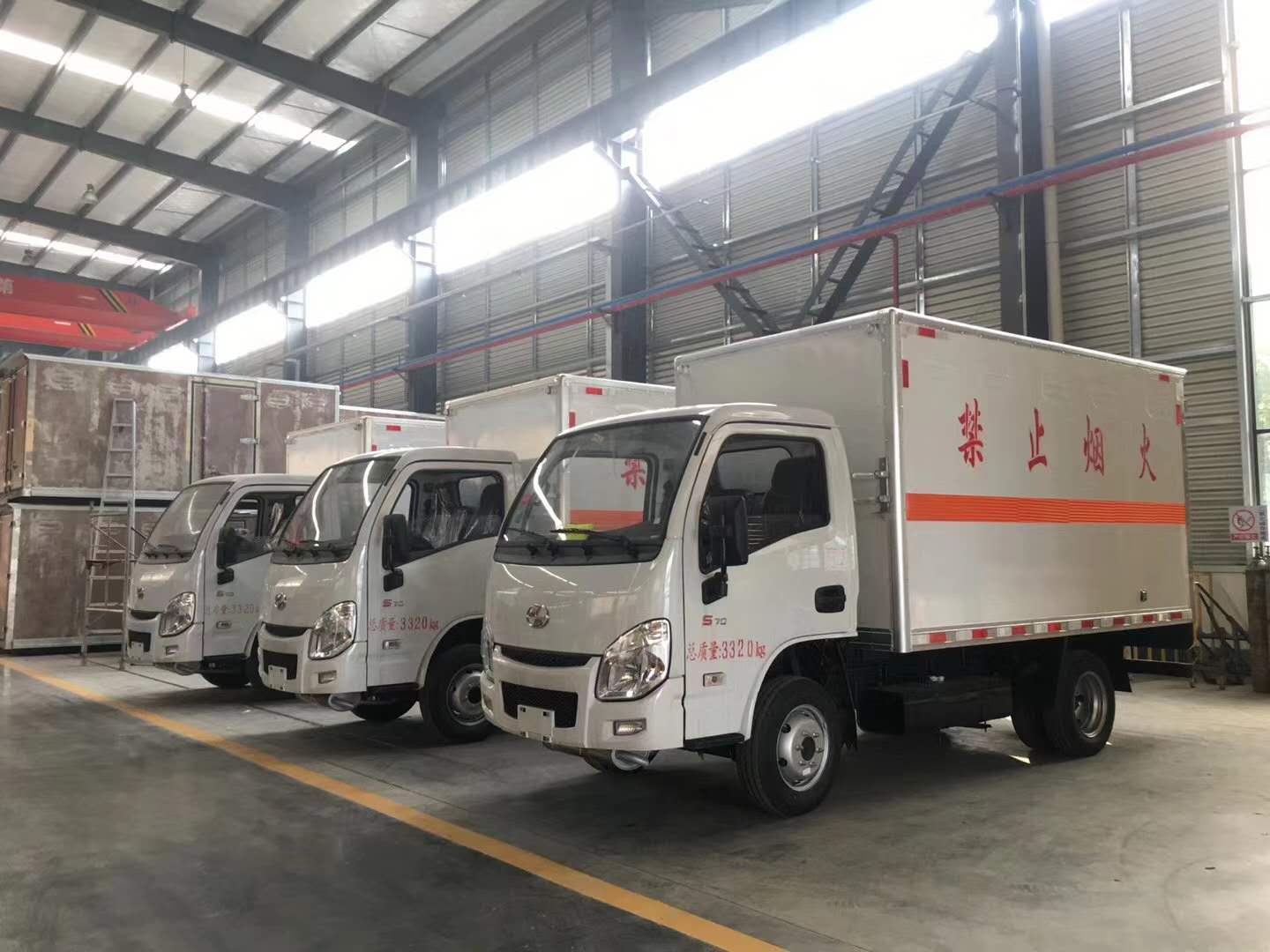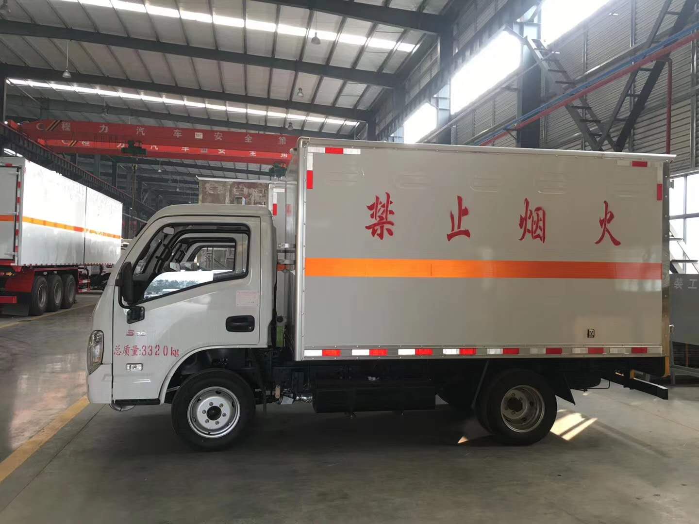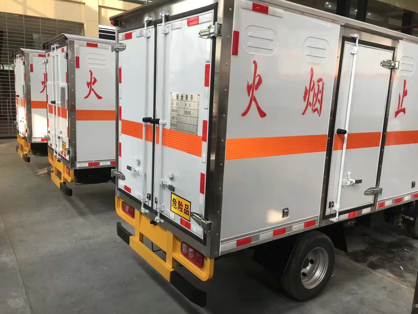 上裝配置:廂體材質為外飾冷軋鋼板、內飾鋁合金板、中間填充隔熱阻燃材料,選裝側門和隔倉,廂體兩側上方設有防雨功能自然通風窗口,底部鋪有阻燃導靜電膠板,廂體側面裝有固定拉環,與捆綁帶使用捆綁貨物以避免移動。在車廂內頂部安裝感煙報警器,在門器框上方安裝有防盜報警器,廂體外側安裝示廓燈及滅火器支架,配置兩個滅火器,并有“嚴禁煙火”和“爆”等字樣,廂體周邊貼反光標識。后門貼有安全告示,危險品標牌。車輛尾部副梁安裝兩條拖地導靜電帶,駕駛室頂部裝有安全三角燈。廂體顏色可定制:黃、白、灰色等。