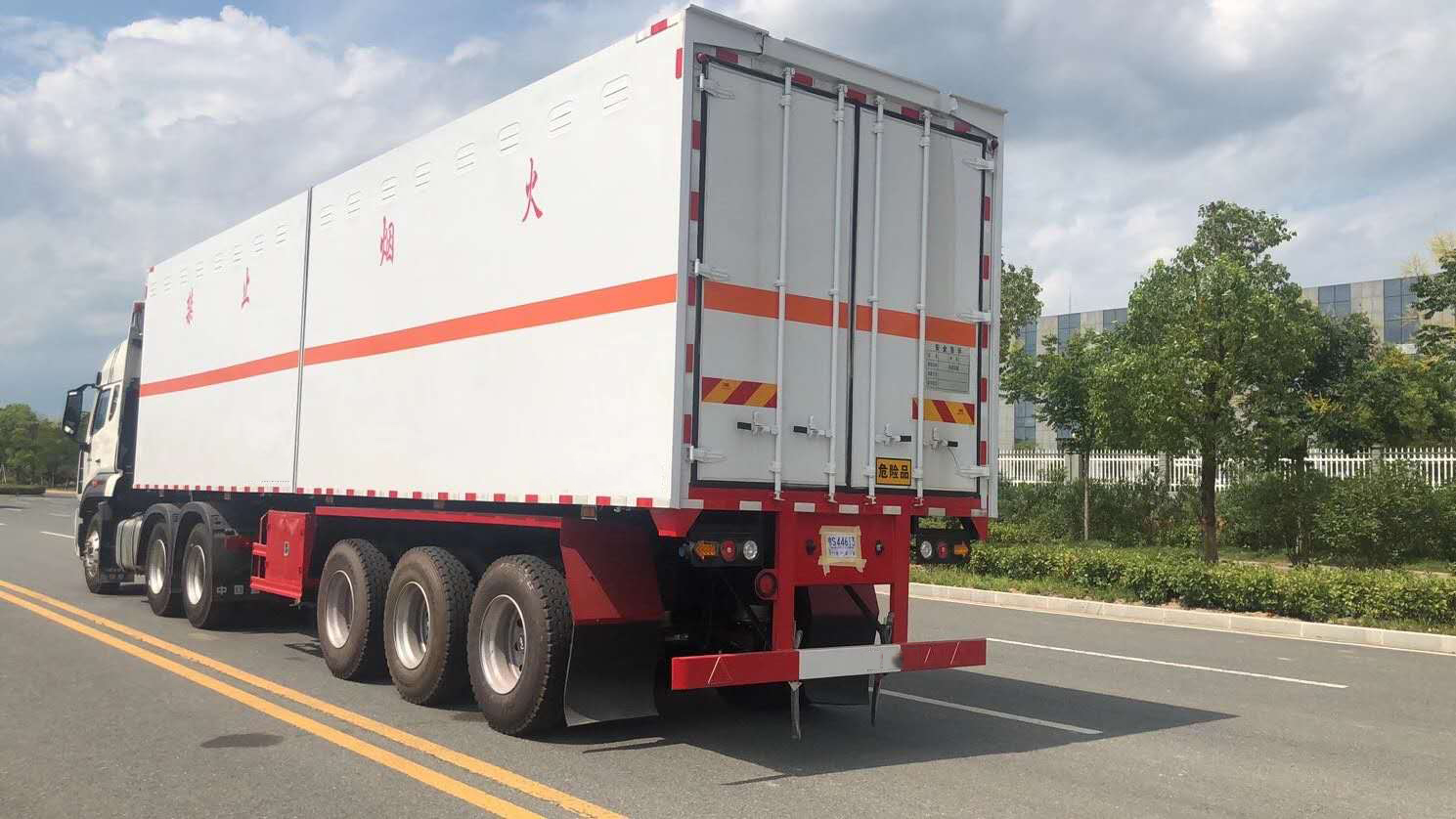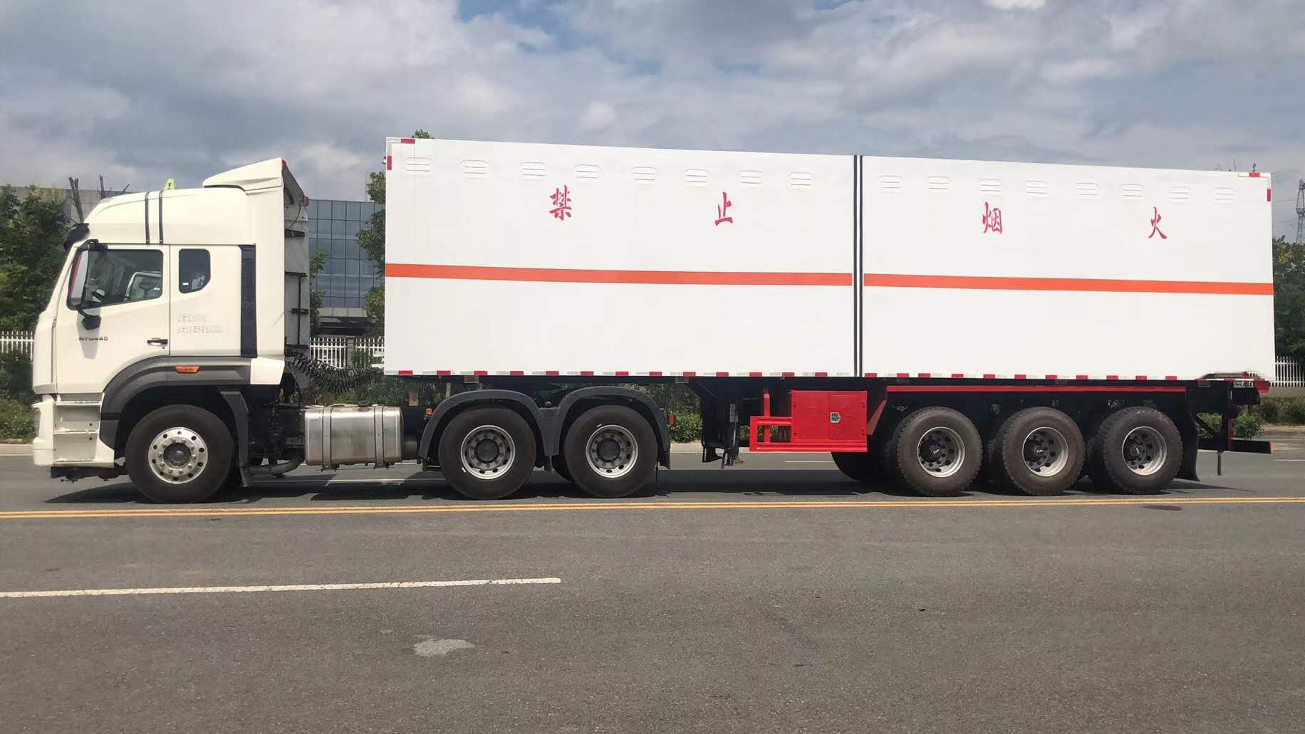 翼展式半掛危險品車是專業(yè)運輸九類危險品,雜項半掛危險品車整車型號:CLW9409XZW,外形尺寸:12600×2550×3990,輪距離:1840/1840/1840,軸 距(mm):5450+1310+1310,總質(zhì)量(kg)40000,整備質(zhì)量(kg)8500,額定質(zhì)量(kg)31500,半掛車鞍座允許總重量(kg)16000。
