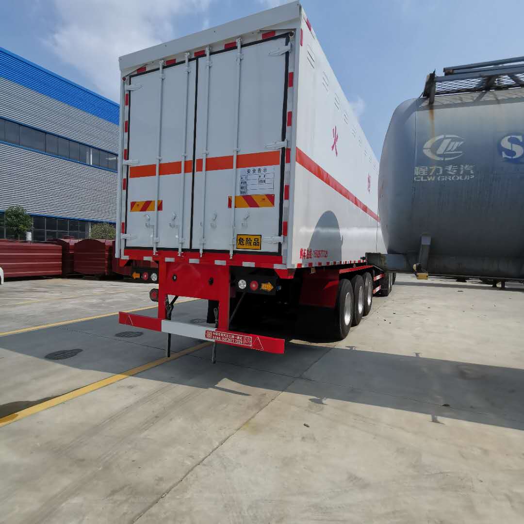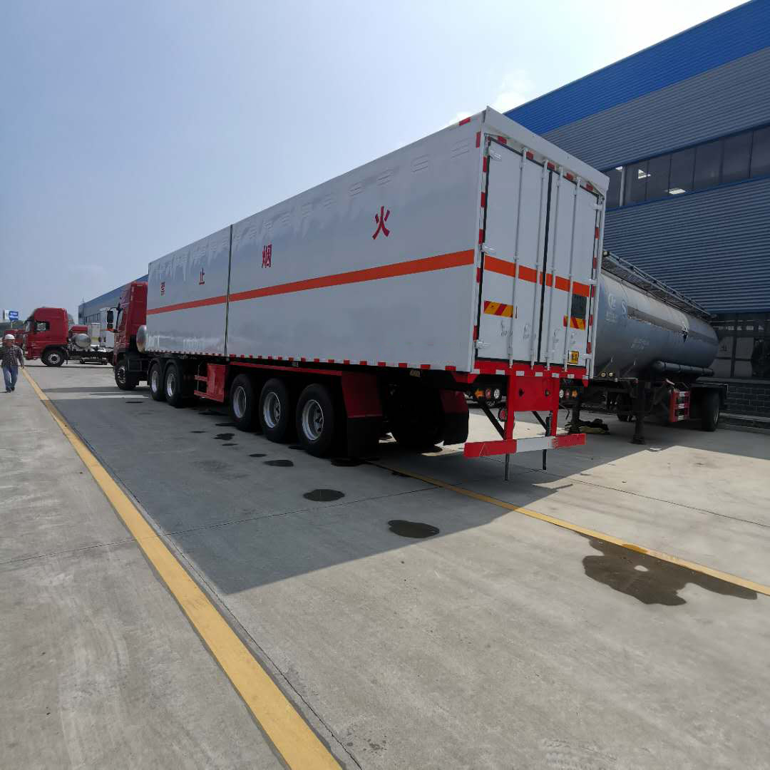 危險品9類雜項廂式半掛運輸車上裝廂體配置:骨架式廂體,廂體左右兩側采用電控液壓鷗翼式開啟結有針對性,尾部為雙鎖桿雙開門,底板為4mm平板外鋪防靜電膠皮,廂體外板為1.2mm厚冷軋鋼板帶一次成型的百葉窗,內板采用導電性良好的1mm,厚鋁板帶透氣孔,中間50mm厚阻燃泡沫,廂體內部側板安裝固定貨物的臥環,頂部安裝煙霧報警器(2個),后門防盜報警器(1個),整車國標放光標,隨車配備靜電帶,滅火器,駕駛室危險警示燈,危險品安全告示,其它均按廠標執行組織生產。