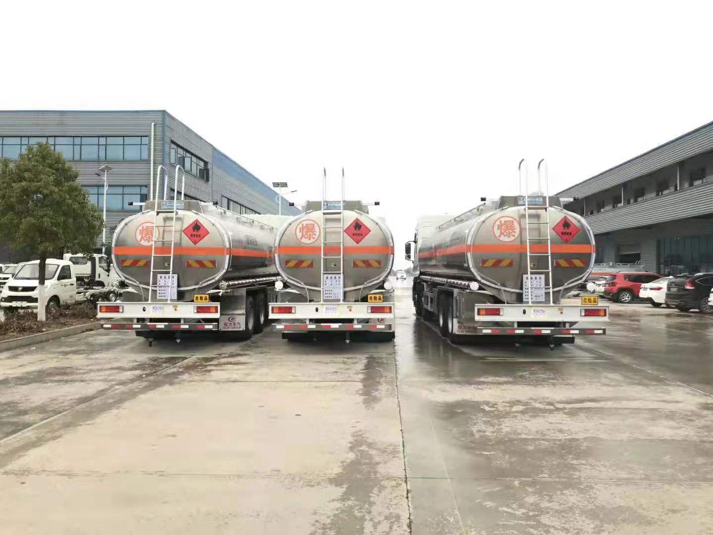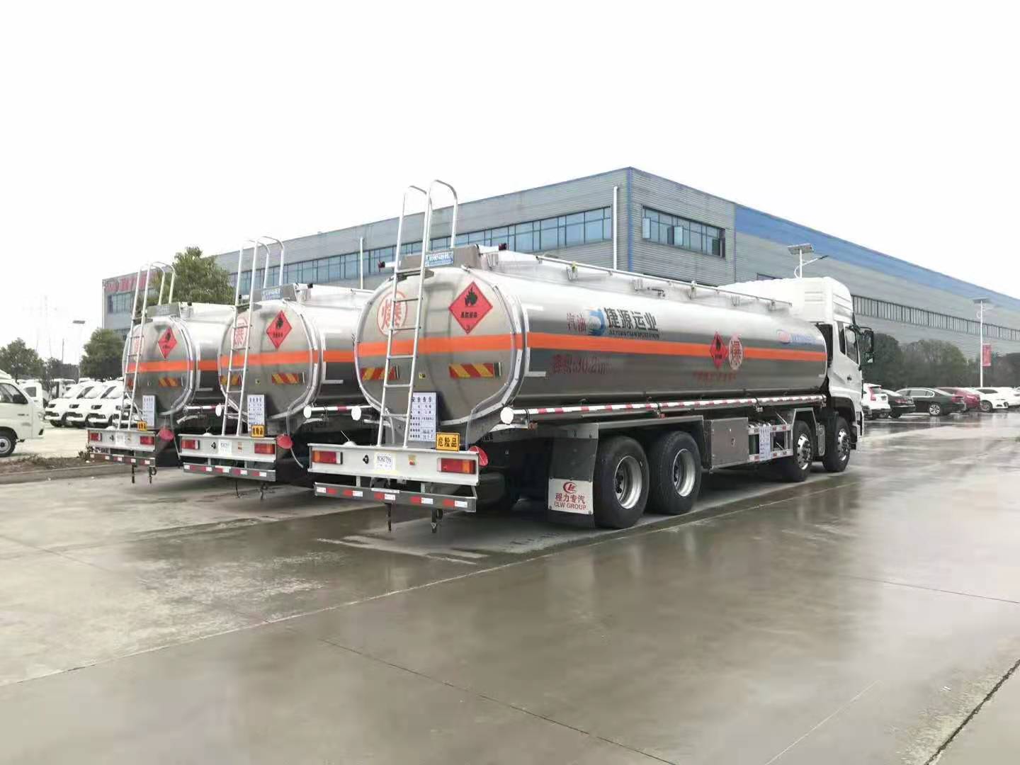 運油車哪一款好?當然要數前四后八油罐車,尤其是輕量化鋁合金油罐車。山東賀總在我司自提三臺東風天龍前四后八鋁合金油罐車,以下是具體發車實拍: