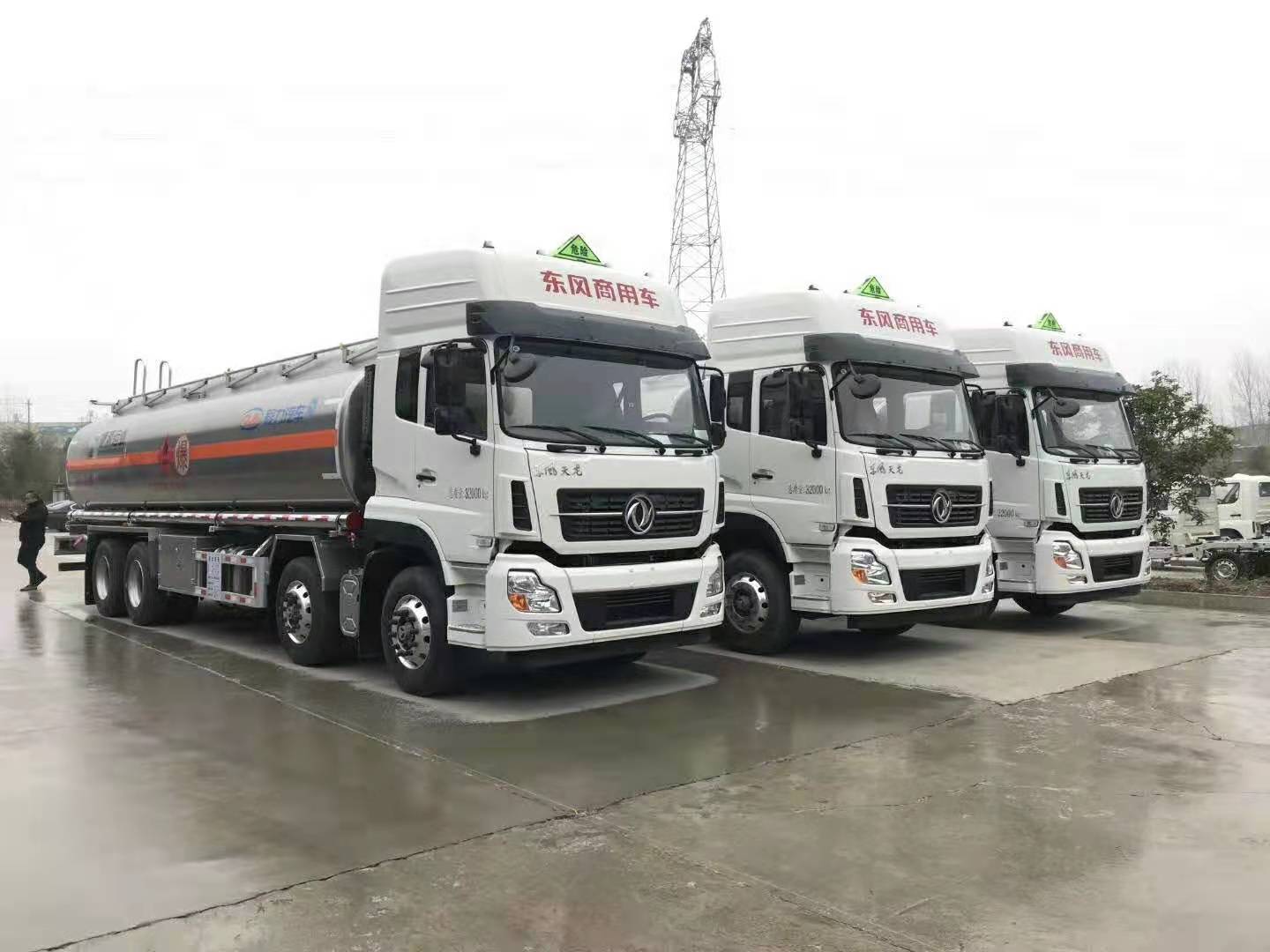 東風天龍前四后八鋁合金油罐車采用東風天龍前四后八國五危貨底盤,東風原廠商用車350馬力發動機,295/80的真空胎,帶氣囊減震座椅,原廠空調,排氣管前置,前盤后鼓,鋁合金油箱。