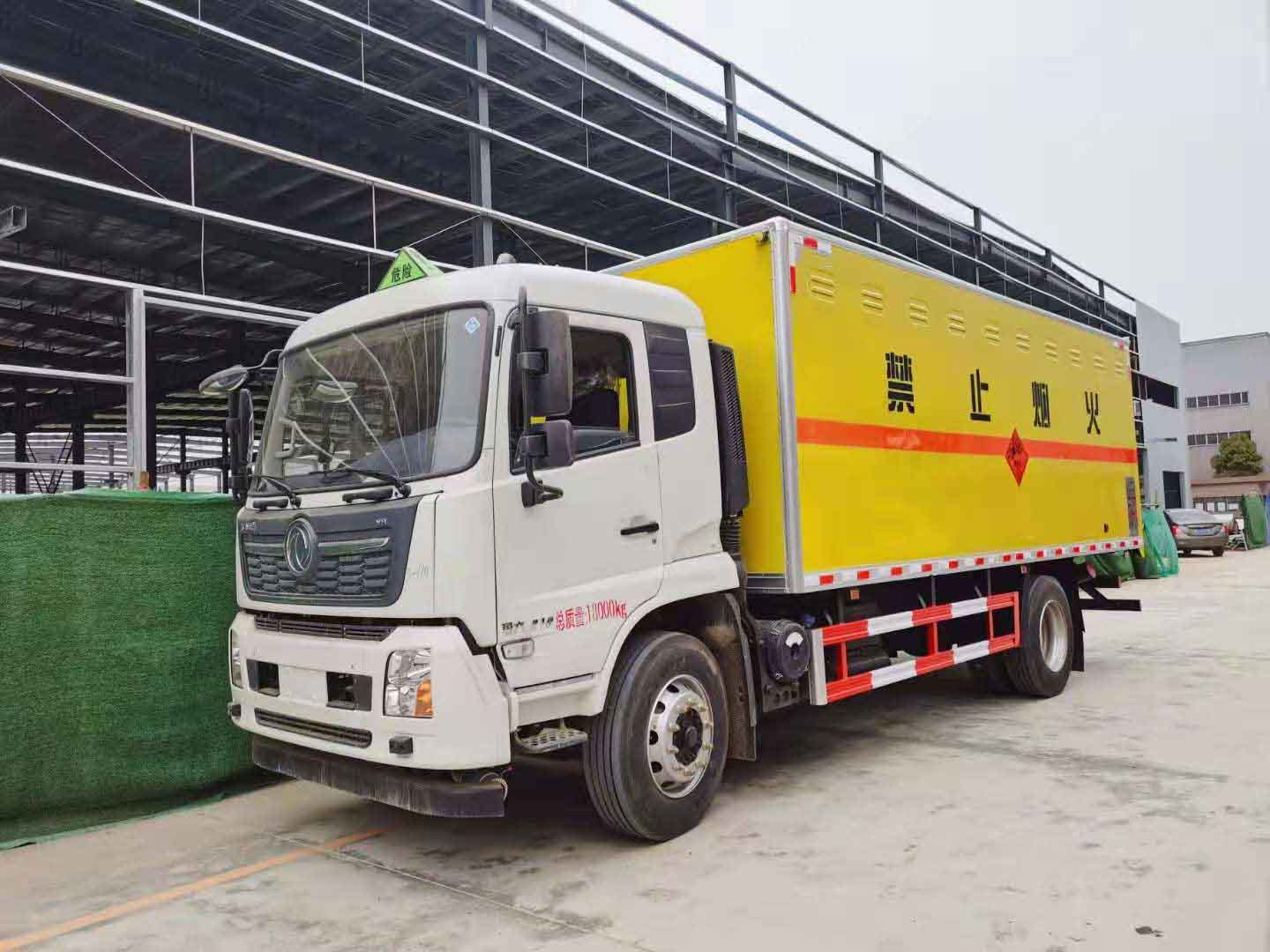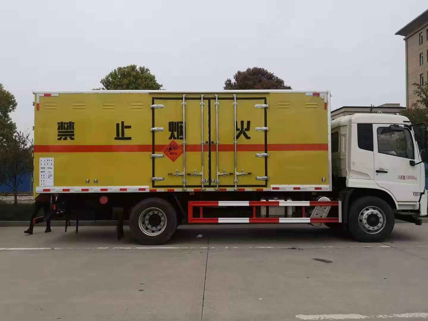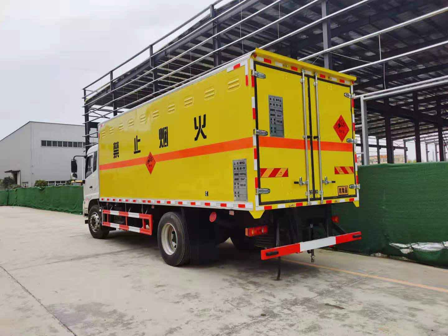 東風(fēng)天錦一類危險品車采用東風(fēng)天錦危險品車底盤,白色車頭,灰色車廂,帶中開側(cè)門,駕駛室?guī)У管囉跋瘢{駛室內(nèi)安裝監(jiān)視器。東風(fēng)天錦4*2底盤,危險品專用底盤,D530排半標(biāo)準(zhǔn)頂,空調(diào),康明斯B6.2NS6B210發(fā)動機,法士特8JS85E-C變速箱,軸距4700mm,4.5T/9T前后橋,板簧前3片后氣囊3/-,鋁160L油箱,速比4.88,275/80R22.5真空胎, 前盤式剎車,限速,ABS,EBS,FCWS/LDWS(前撞/車道偏離預(yù)警),TPMS(前軸單臺胎壓監(jiān)測) 后雙開門,貨廂前、后各兩個示廓燈、貨廂內(nèi)安裝離子感煙火災(zāi)探測器、側(cè)廂及前廂內(nèi)安裝固定臥環(huán)、地板裝置防靜電膠皮、側(cè)廂開通風(fēng)口、安裝滅火器、安裝排氣火花熄滅器、車尾部安裝導(dǎo)靜電橡膠拖地帶、駕駛室安裝危險標(biāo)志燈、門上安裝防盜報警器、車身側(cè)面及后部粘貼橙色反光標(biāo)識、菱形標(biāo)示、車體后部設(shè)置安全告示、后保險杠安裝緩沖加強橡膠塊。