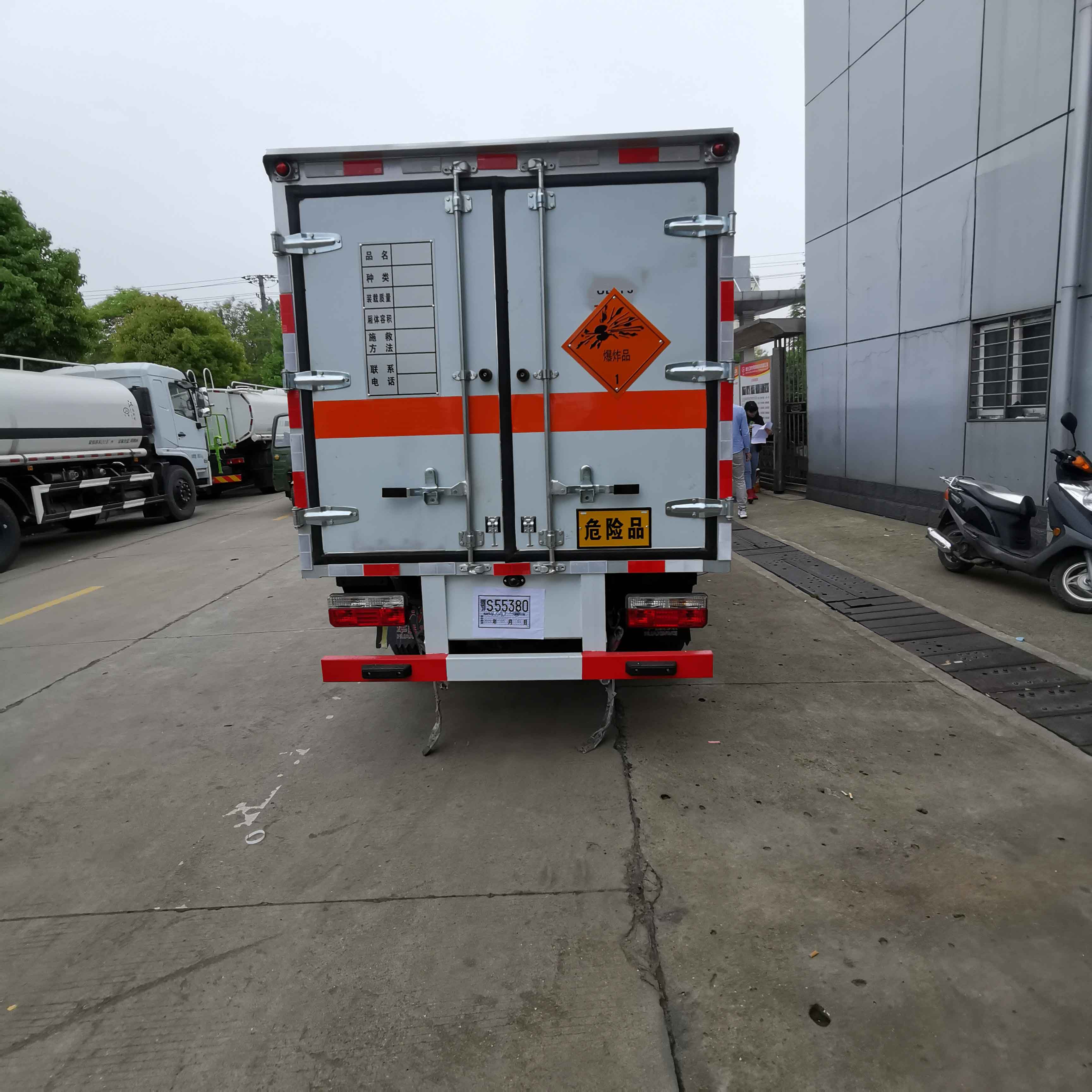 東風途逸國六柴油爆破運輸車帶前開側門,活動隔艙,廂體嚴格按照公告尺寸制作,外板采用1mm厚冷軋板有一次性成型的百葉窗,內飾為導電性能良好的鋁板有透氣孔,內襯為矩形管骨架牢靠穩定,內部填充為透氣防潮阻燃的擠塑板,四種材料經現代工藝復合而成,廂體外部上下鋁合金型材包邊,底板和車廂前下部鋪橡膠皮,后門雙開,右側中部單開門,內部有固定貨物的臥環,車輛外部有靜電帶、滅火器、防火罩,車廂內安裝煙霧報警器和門防盜報警器,嚴格按照國家危險品相關法規張貼。
