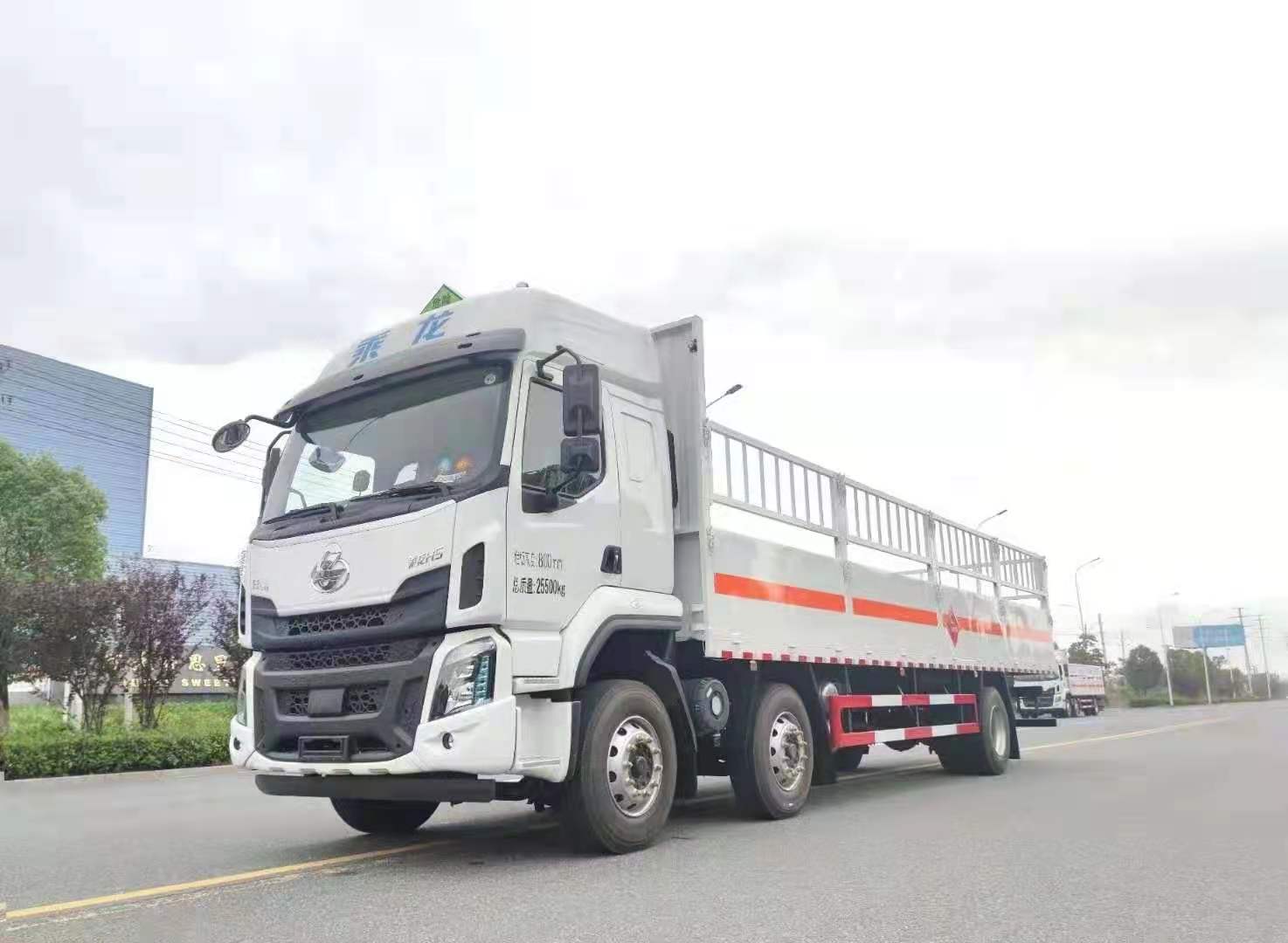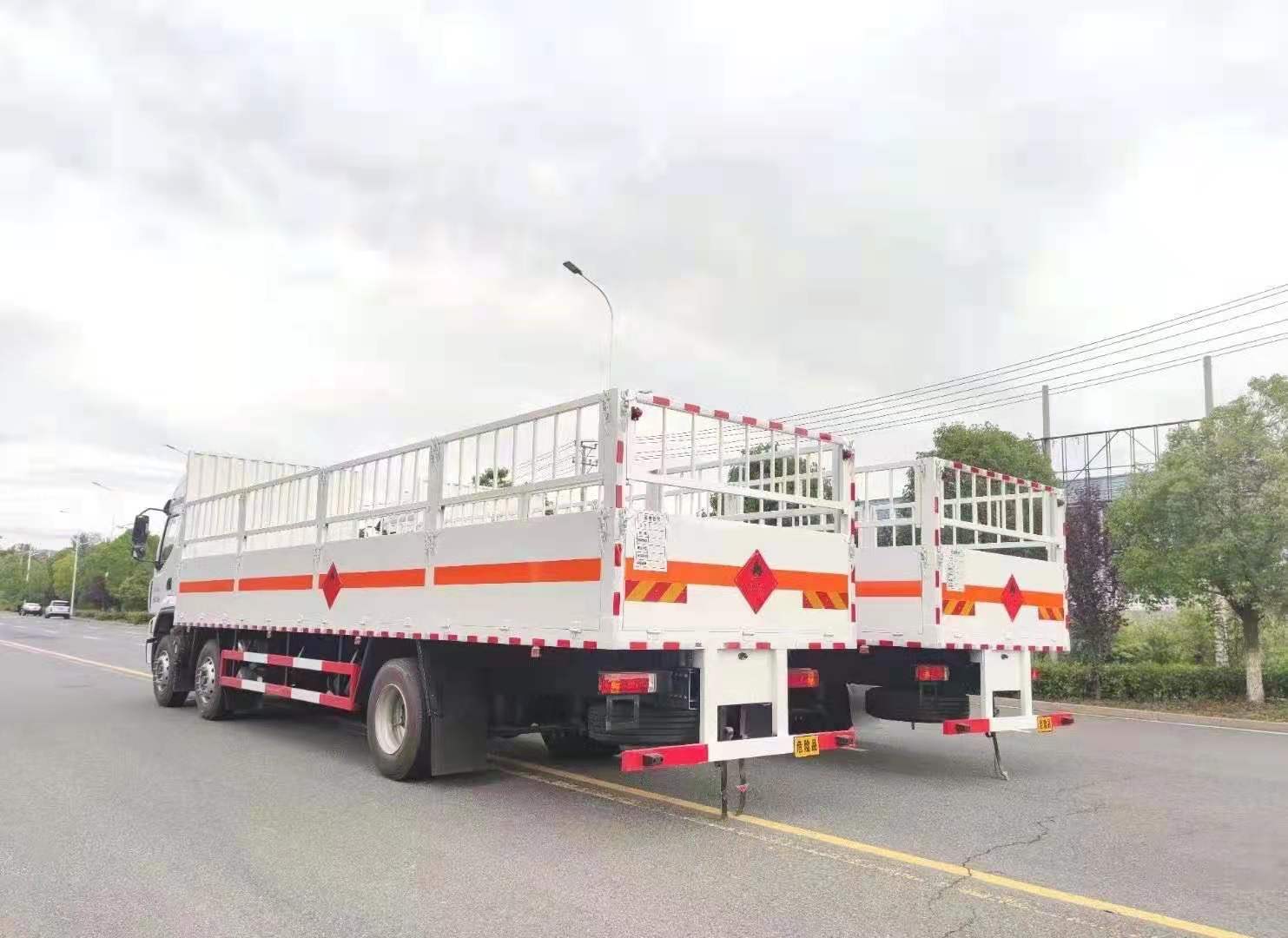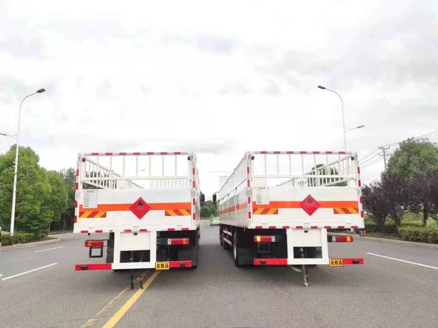 東風柳汽國六三軸9米6氣瓶車采用廂式欄板車結構,外厚度為1.1毫米厚度武鋼冷軋鋼板,內加強“幾”字型加強梁,車體底板加強處理并做防靜電處理。車體的左側、右側,和后欄板栓鉤結構,可向下打開,方便上下貨物,車體為空曠式車型,大大減少了運輸物品因為狹窄空和強烈碰撞產生氣瓶爆炸的危險性,箱體外觀涂裝白色油漆,在欄板的中間位置粘貼橙色的危化車標帶,并在車體的左、右、后部粘貼“易燃氣體”或“不燃氣體”標識。駕駛室內部配備兩只滅火器,后杠處安裝防追尾事故的緩沖固定塊。此款車輛屬于國家規定的危險品二類危險品運輸車。