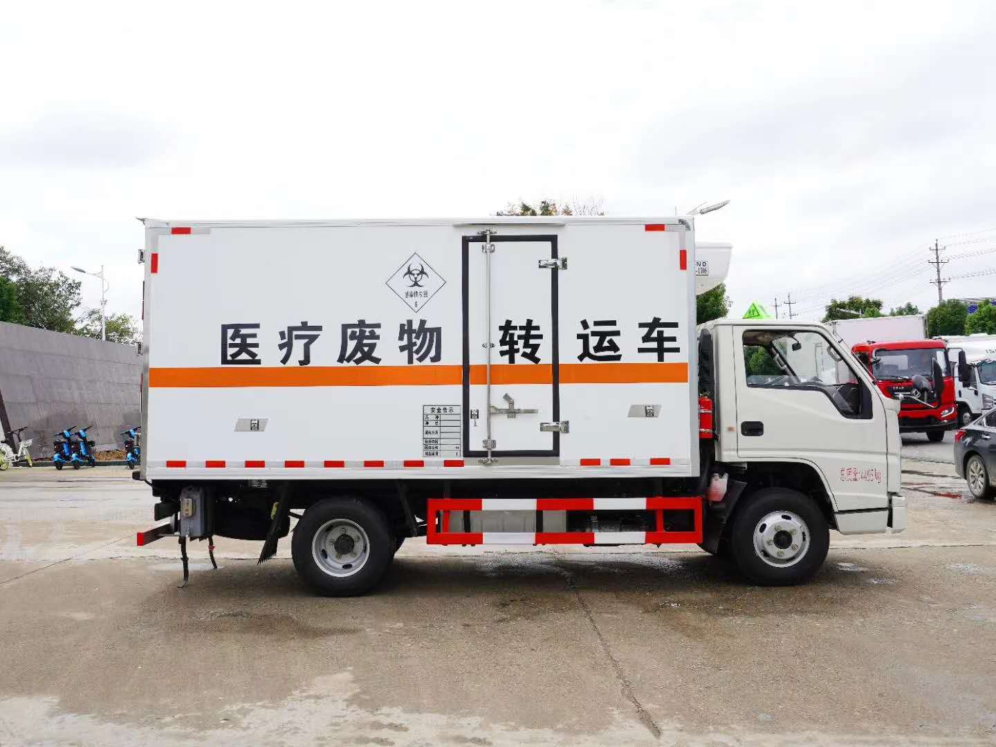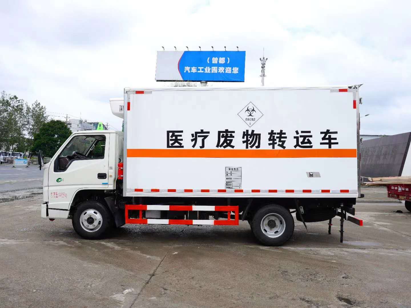 江鈴國六醫療廢物轉運車采用江鈴順達原廠新規危險品車專用底盤,帶排氣管前置、前輪盤式制動、帶ABS、電子限速器、安全帶未系提醒、剎車襯片磨損提醒、防爆胎裝置,軸距3360mm,江鈴115馬力發動機,5檔變速箱,4噸后橋,7.00R16鋼絲胎。
