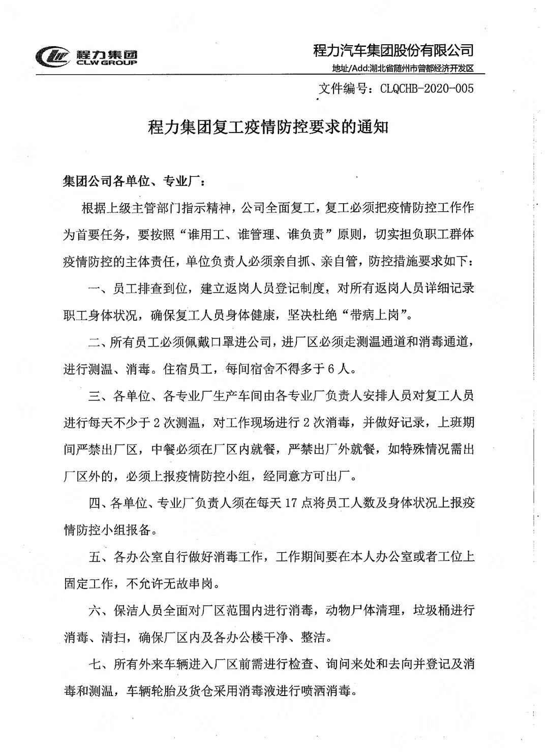 根據上級主管部門精神,公司可全面復工,現程力專汽向外宣布正式復工,具體事項如下: