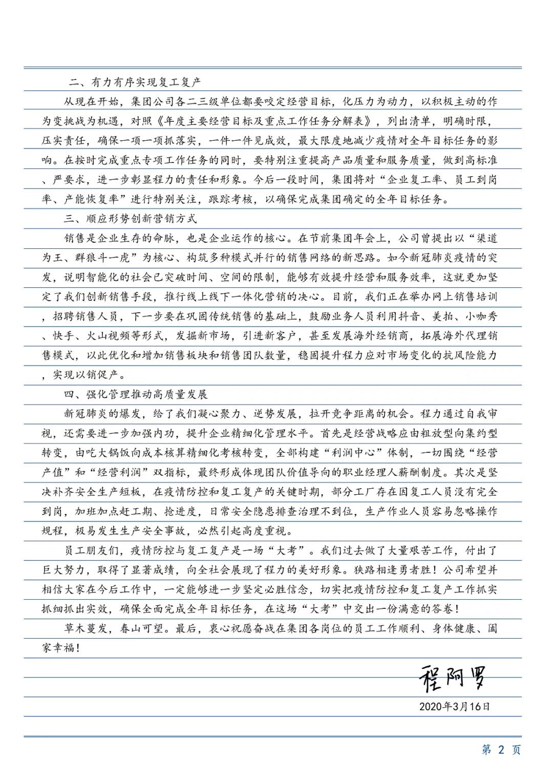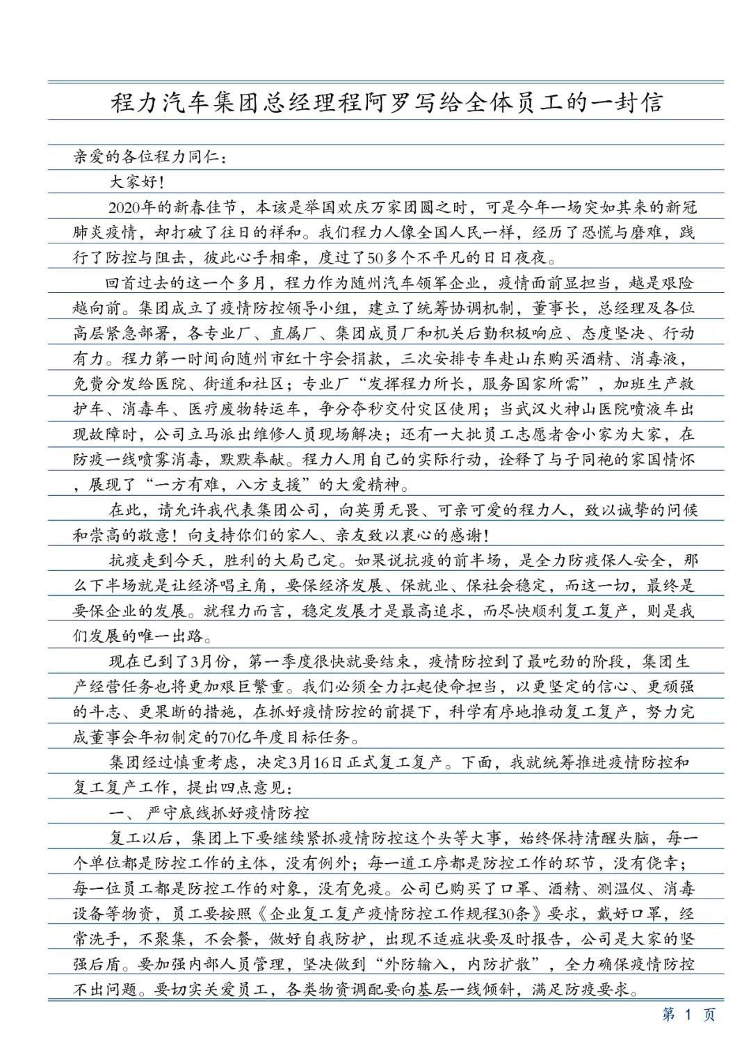從防控以來,程力專汽經歷了眾多不一樣的事,時光抹去的兩個月歲月,程力專汽于2020年3月16日正式開工。復工的場景一片欣欣向榮,為了更好地有序生產,程力汽車集團總經理程阿羅寫給全體員工的一封信,具體如下: