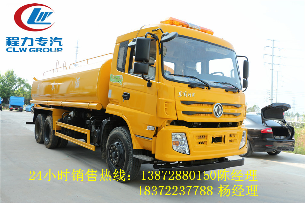 溫州的高總從事園林綠化工作,為了便于澆灌苗木2017年在湖北程力集團(tuán)購(gòu)買了一輛10方東風(fēng)大多利卡灑水車,質(zhì)量和功能都還不錯(cuò),由于工程量擴(kuò)大,還需要一輛大噸位水車,由于是老客戶了,高總直接聯(lián)系到之前訂車的程力專用汽車股份有限公司官方銷售陳經(jīng)理,在陳經(jīng)理的介紹下,高總了解到一款22噸東風(fēng)后雙橋?yàn)⑺嚕撥嚥捎每得魉?10馬力發(fā)動(dòng)機(jī),總質(zhì)量25000KG,外形尺寸(MM):10050×2500×3450;排放標(biāo)準(zhǔn):國(guó)Ⅴ;軸距(MM):4350+1300; 前沖(噴)后灑、帶側(cè)噴、帶后工作平臺(tái)、平臺(tái)上安裝綠化灑水高壓炮(炮噴射形狀可調(diào):直沖狀、大雨、中雨、毛毛雨,可連續(xù)調(diào)節(jié),最大射程可達(dá)28米),配備全國(guó)質(zhì)量評(píng)比第一名的程力威(日本技術(shù))大功率專用灑水泵,帶消防接頭,帶自流閥,帶自吸功能,帶濾網(wǎng)。