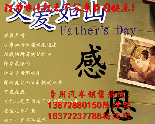 有一些愛,沉默無言卻又沉穩(wěn)可靠;有一種人,童心未泯卻又爸氣十足!他們陪你笑鬧,我們陪他過節(jié)。父親節(jié)到來之際,程力專汽送上一句對(duì)父親們一聲的祝福:愿天下父親們身體健康,長壽年年!所有的在外游子們能常回家看看,陪陪父母,讓他們不再孤單!為了答謝新老客戶的厚愛,但凡今天所有訂車的客戶均可享受千元優(yōu)惠,更有油卡享受,歡迎您撥打程力專用汽車股份有限公司廠家直銷熱線,電話:13872880150陳經(jīng)理/18372237788楊經(jīng)理(手機(jī)號(hào)即為微信號(hào),添加有驚喜喲!)。