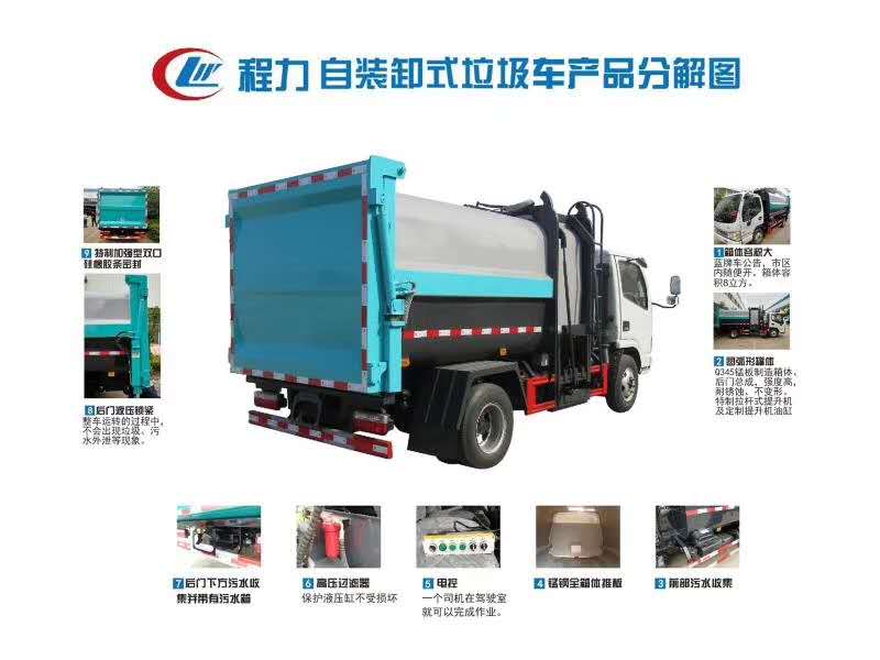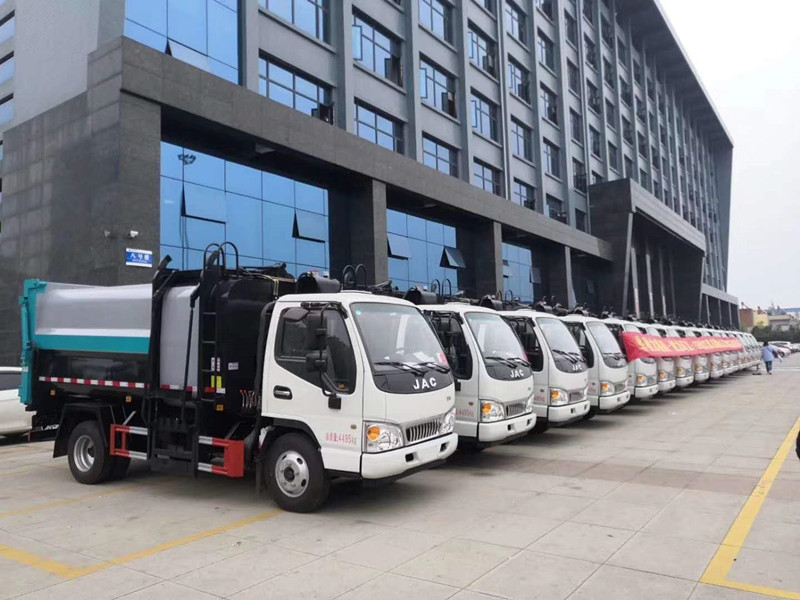 上裝配置:弧形箱體容積7.5立方;采用Q345高強度錳鋼4mm;長源油泵;江蘇多路閥;國產液壓油缸,推鏟卸料。液壓后蓋,后蓋帶密封條;后門液壓鎖緊。鏈條式提升機;可掛240L標準塑料垃圾桶;駕駛室內集中電控(提升機外部手動控制);后門鎖緊與后蓋開關的操作具有防誤操作,車身高位示廓燈/邊燈/作業照明燈。