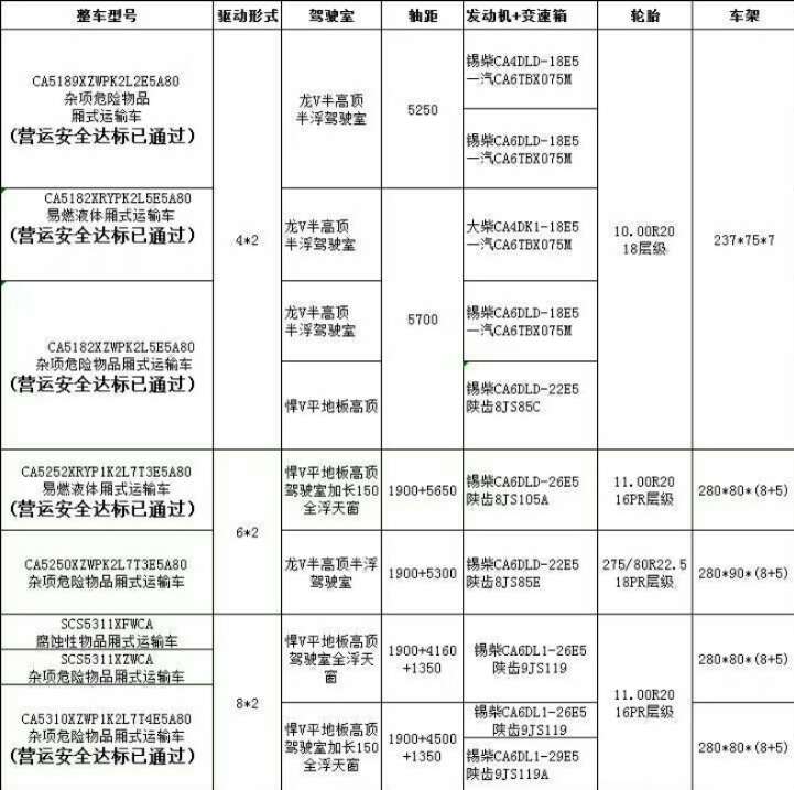 在之前我們為大家公示了江鈴、東風、躍進等品牌危險品車,今天為大家公示解放系列安全達標車型: