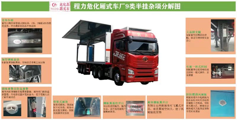 危險(xiǎn)品車作為專用特種專用車,運(yùn)輸裝卸相比普通貨物更麻煩,為了讓客戶卸貨更方便,今天為您推薦的是九類雜項(xiàng)半掛翼展危險(xiǎn)品車,具體明細(xì)如下: