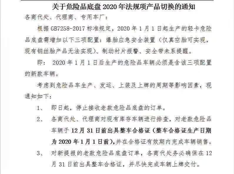 3、對于新提報的老款危險品車底盤訂單,必須確保在12月31日出具整車合格證,并盡快完成車輛上牌交付!