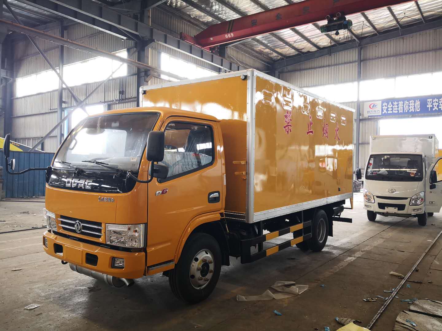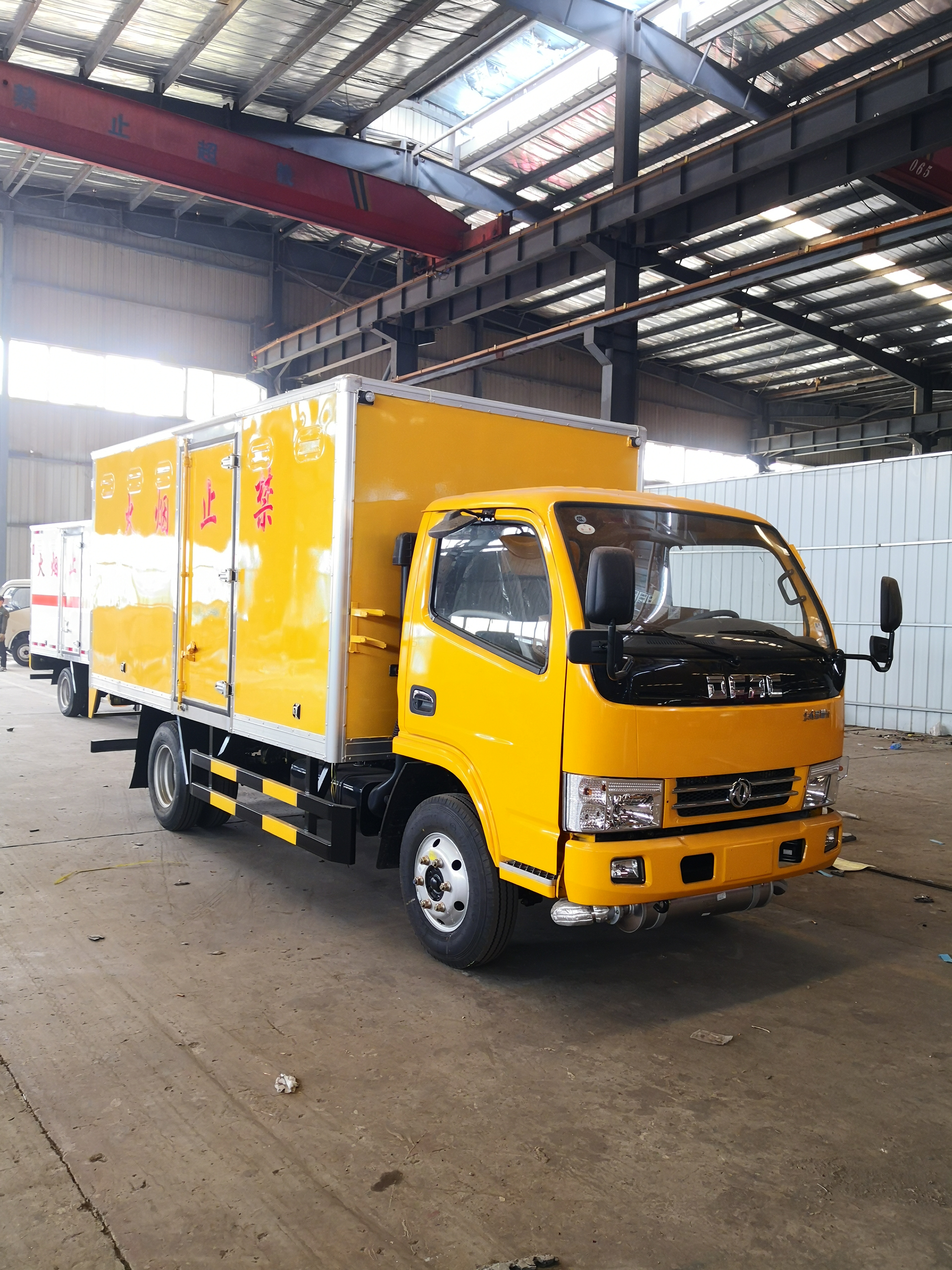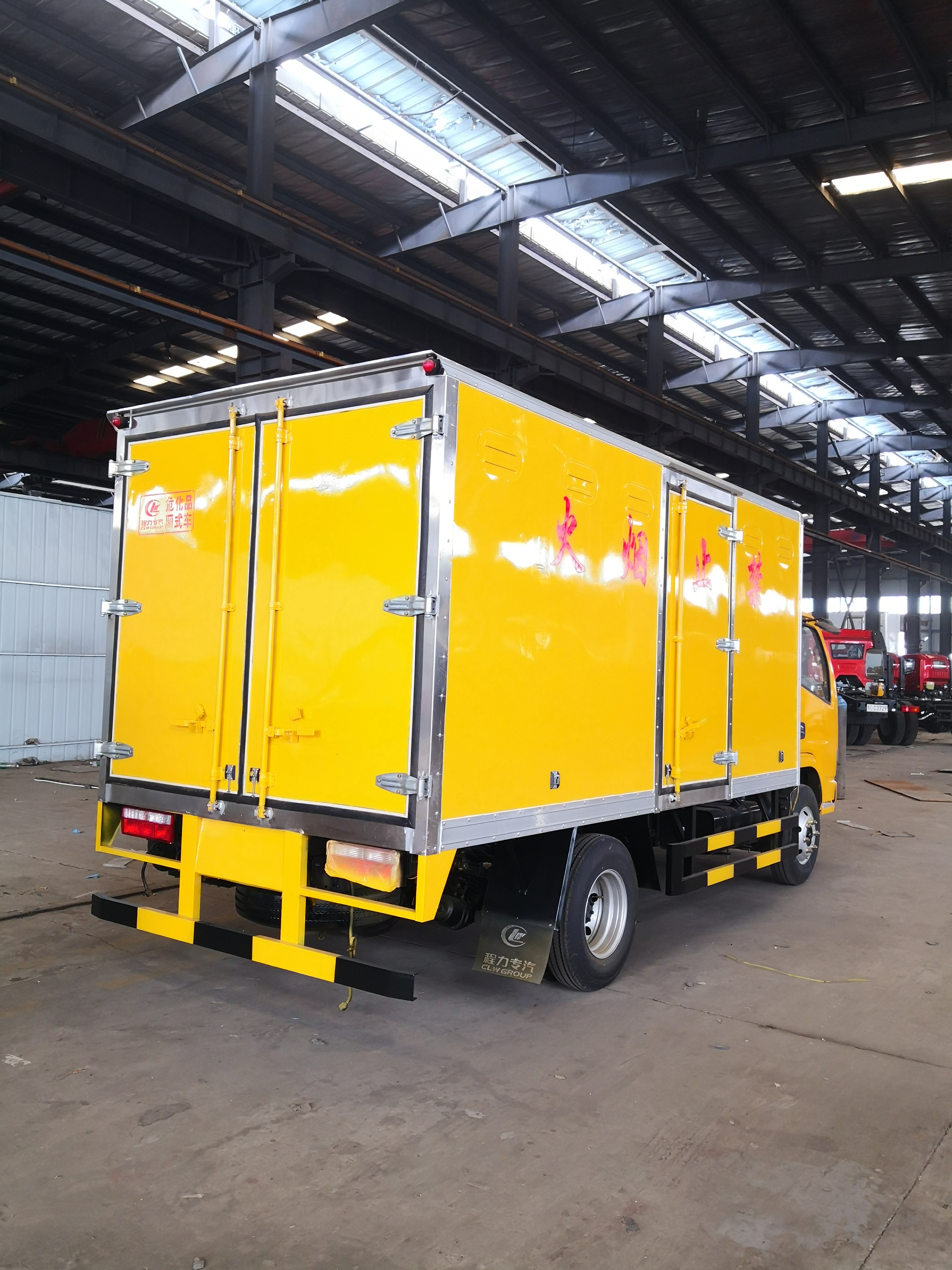 東風多利卡4.2米黃牌危險品車 采用東風危險品車底盤, 外形尺寸:5995×2150×2800(mm),廂體內尺寸:4120×2000×1780(mm),朝柴102馬力國五柴油發動機,3308mm軸距,7.00R16輪胎,帶方向助力、帶空調、帶前盤制動、排氣管前置、限速器、大燈調節裝置、符合2020年新法規政策。貨廂采用雙層金屬骨架,外冷軋鋼板,內鋁板,中間夾有國標防阻燃材料,廂體底部花紋板鋪防靜電膠皮,廂體內配煙霧報警器、車廂門配備防盜報警器,帶防火帽,滅火器,危險品標識(八類腐蝕品國標標識),整車帶有反光貼。整車顏色:黃色,隨車帶合格證,隨車工具,上戶發票,整車不超重。