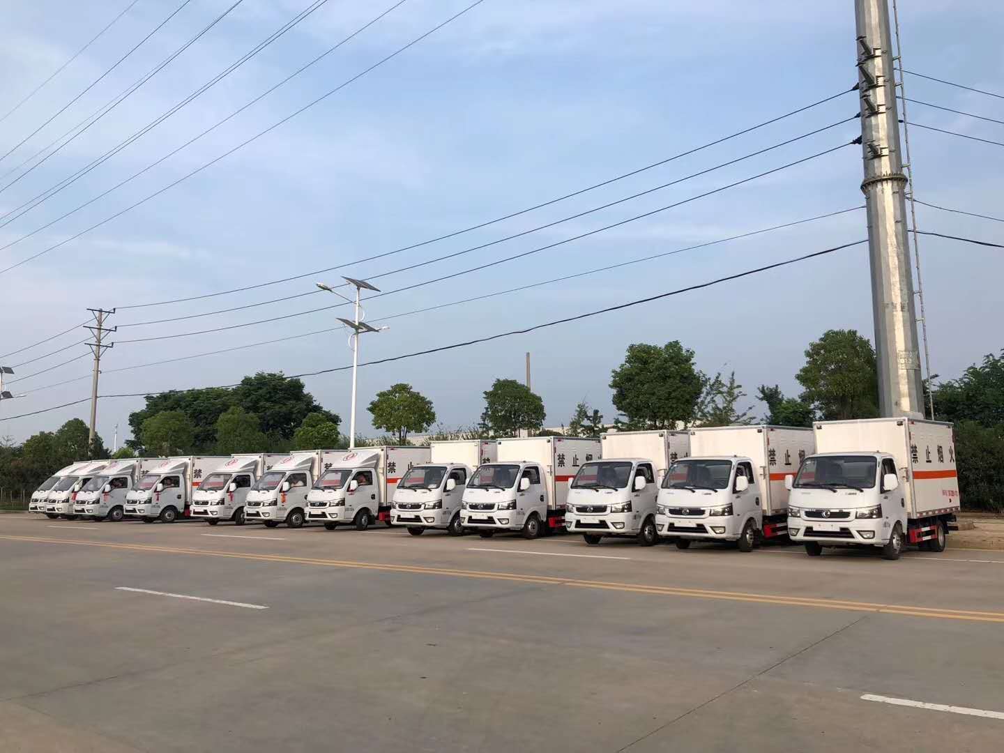 2.廂體配置:整車尺寸(長寬高:)5100X1830X2650(MM),廂體尺寸(長寬高):3000X1680X1720(MM),核載質量:0.74噸。廂體配置:嚴格按照公告尺寸制作,外板采用1mm厚冷軋板有一次性成型的百葉窗,內飾為導電性能良好的鋁板有透氣孔,內襯為矩形管骨架牢靠穩定,內部填充為透氣防潮阻燃的擠塑板,四種材料經現代工藝復合而成,廂體外部上下鋁合金型材包邊,底板和車廂前下部鋪橡膠皮,后門雙開,右側中部單開門,內部有固定貨物的臥環,車輛外部有靜電帶、滅火器、防火罩,車廂內安裝煙霧報警器和門防盜報警器,嚴格按照國家危險品相關法規張貼。