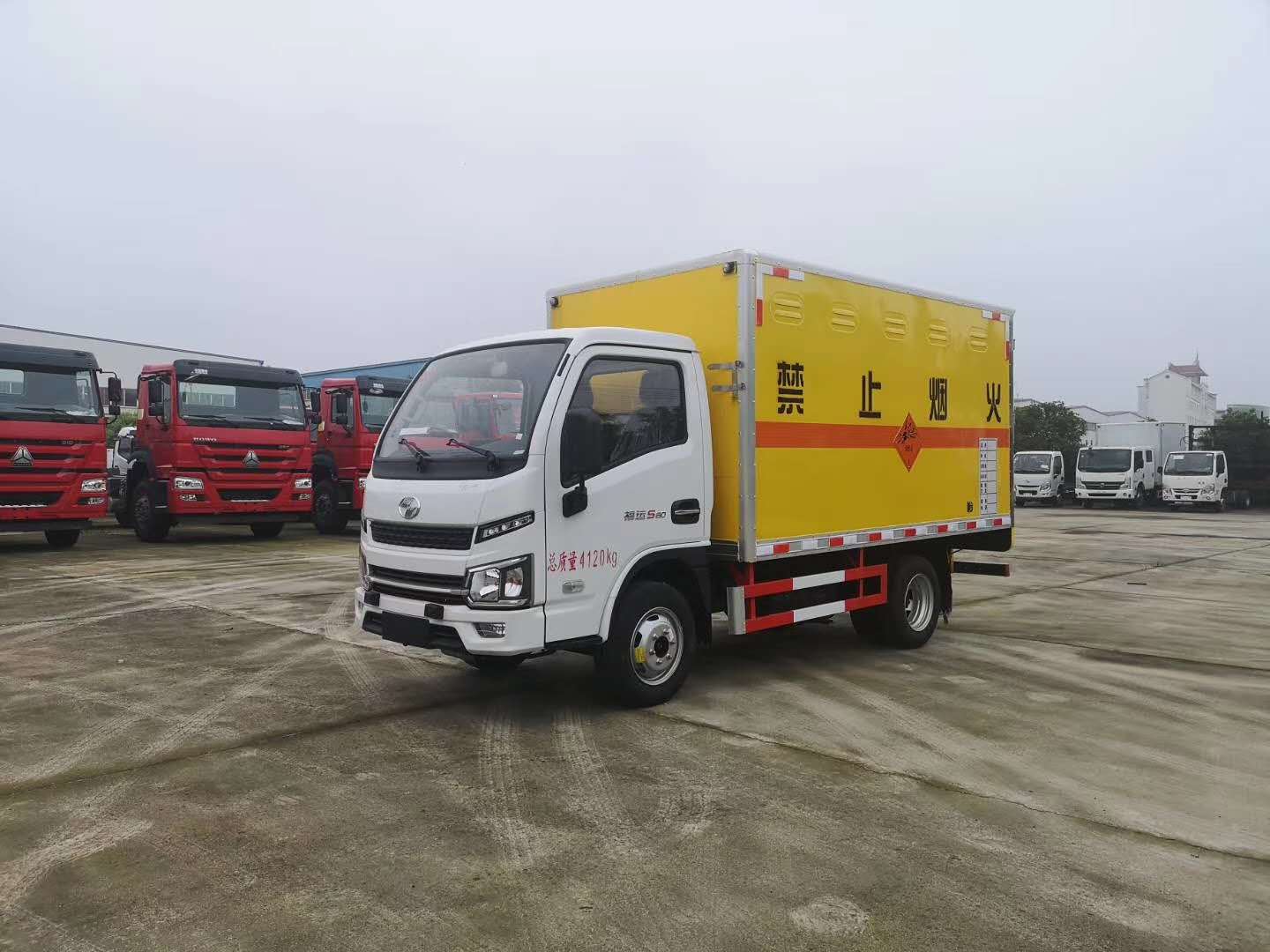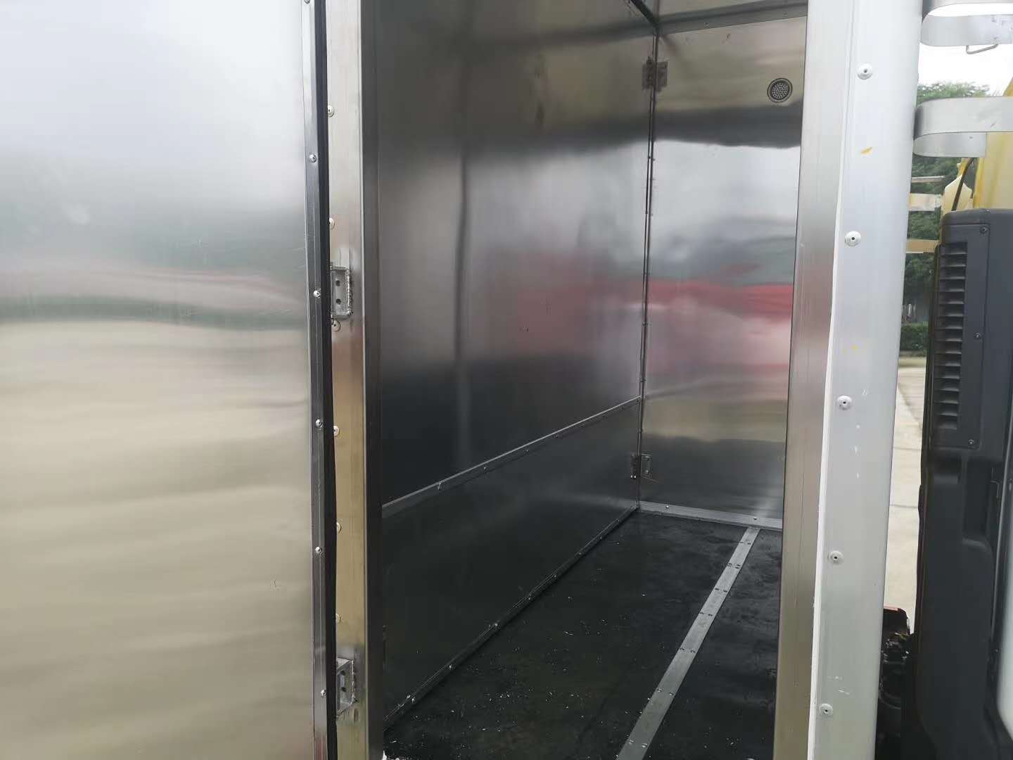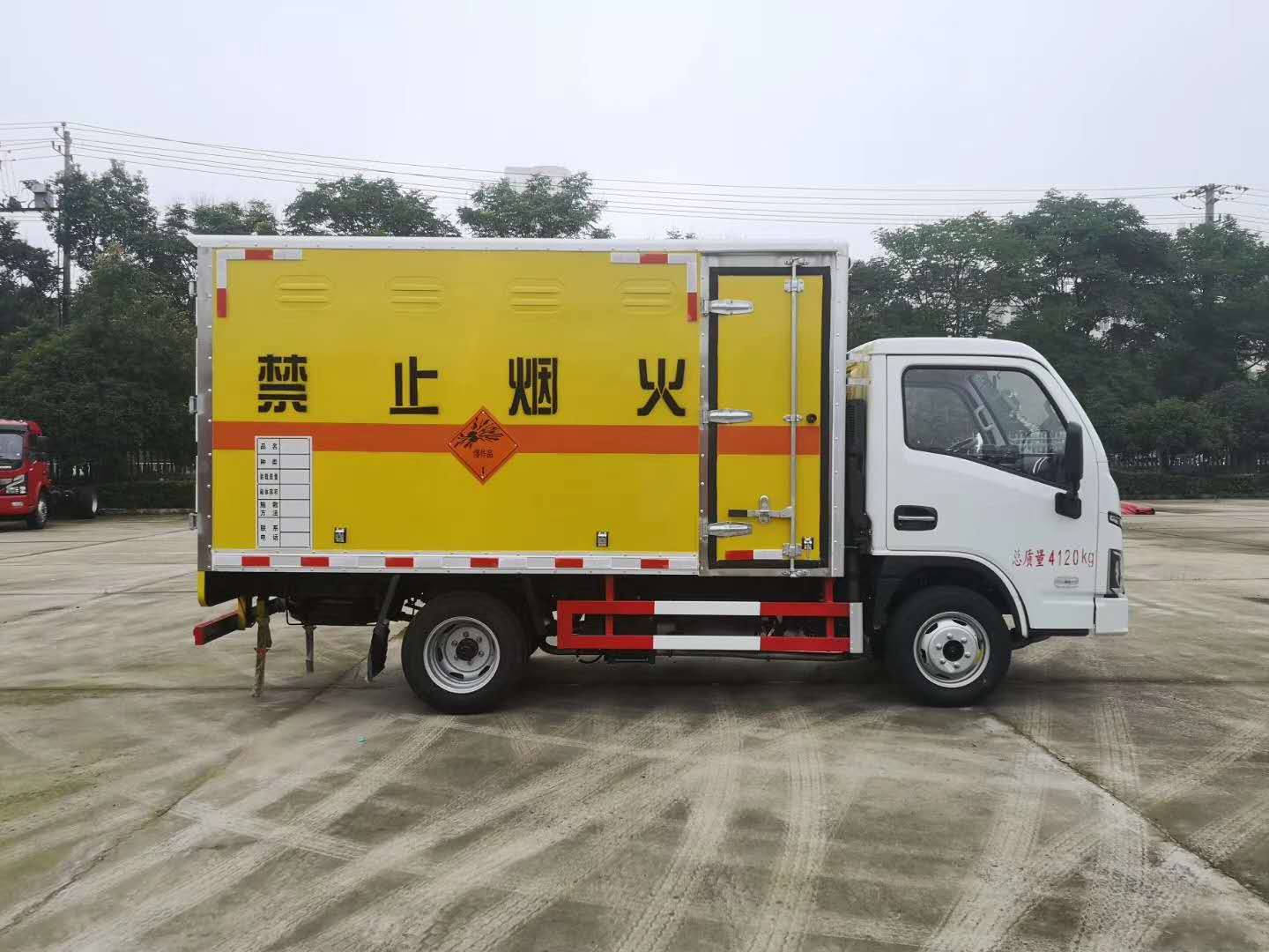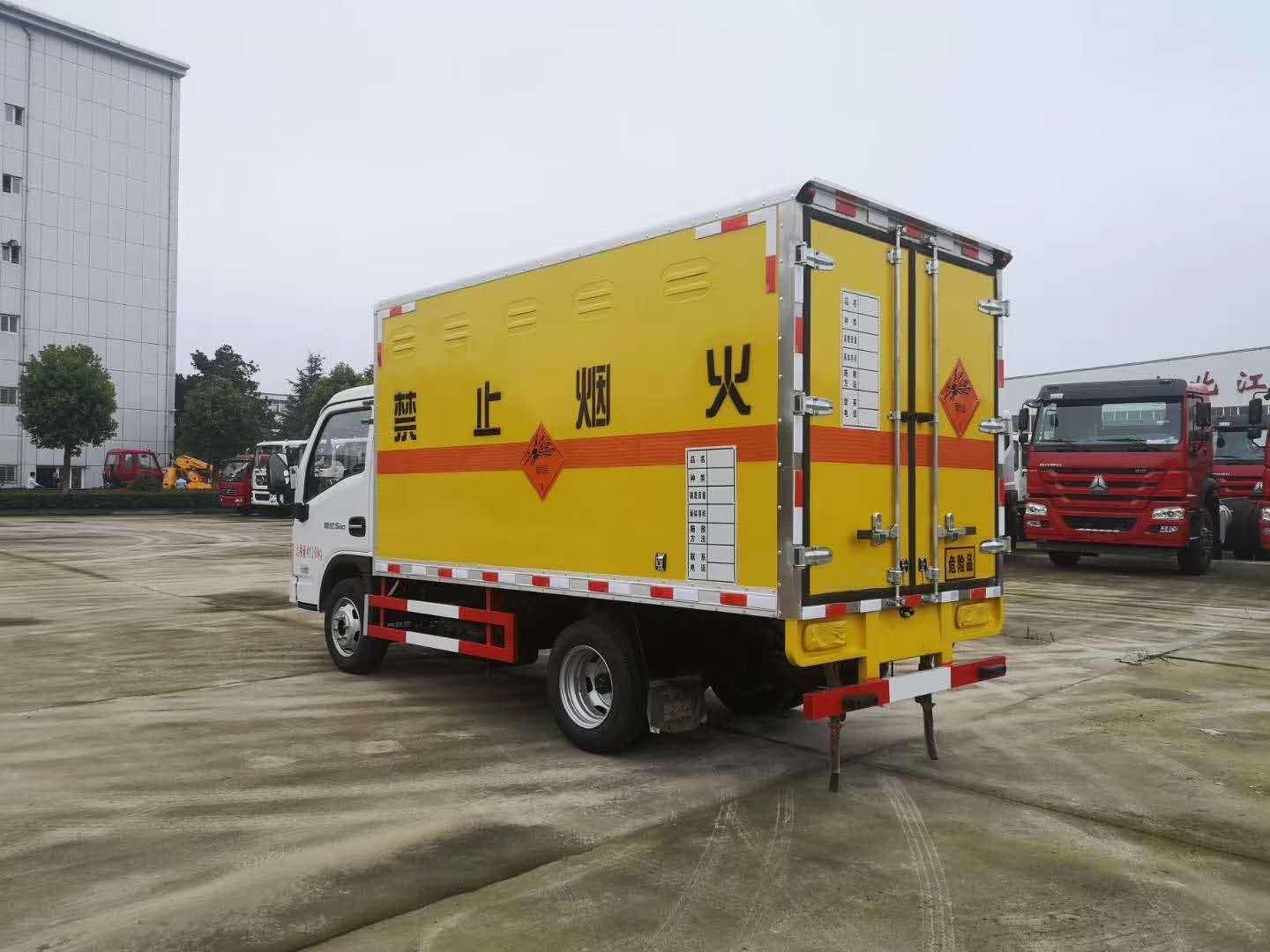 2)上裝配置:外飾冷軋鋼板,內(nèi)飾鋁合金板,中間填充隔熱阻燃材料,(選裝側(cè)門(mén)和隔倉(cāng))廂體兩側(cè)上方設(shè)有防雨功能自然通風(fēng)窗口,底部鋪有阻燃導(dǎo)靜電膠板,廂體側(cè)面裝有固定拉環(huán),與捆綁帶使用捆綁貨物以避免移動(dòng)。在車廂內(nèi)頂部安裝感煙報(bào)警器,在門(mén)器框上方安裝有防盜報(bào)警器,廂體外側(cè)安裝示廓燈及滅火器支架,配置兩個(gè)滅火器,并有“嚴(yán)禁煙火”和“爆”等字樣,廂體周邊貼反光標(biāo)識(shí)。后門(mén)貼有安全告示,危險(xiǎn)品標(biāo)牌。車輛尾部安裝兩條拖地導(dǎo)靜電膠帶,駕駛室頂部裝有安全三角燈。廂體顏色有:黃、白、灰色等可選。