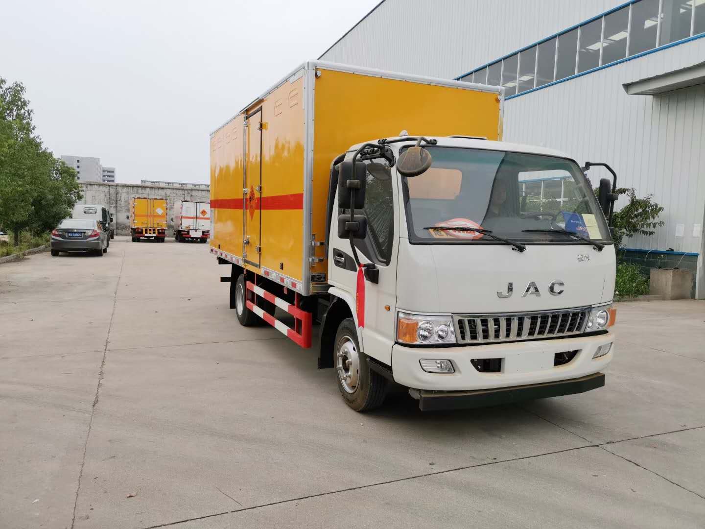 江淮5噸爆破器材運輸車采用江淮駿鈴E6單排前翻駕駛室,,駕駛室寬度2071mm,采用濰柴130馬力發動機,星銳6檔變速箱,斷氣剎,7噸后橋,215/75R17.5輪胎,190*6雙層大梁,原裝空調,帶方向助力,帶前盤制動,限速80km/h,帶ABS防抱死裝置,帶行車記錄儀,原廠危化專用底盤,帶前盤制動,防爆胎裝置,剎車襯片預警提示。廂體內部尺寸:5150×2150×2000mm,總質量:9.3噸,額定載質量:4.975噸。整備質量:4.13噸,駕駛室準乘:3人。運輸介質:黑火藥,壓縮黑火藥,電引爆雷管,爆破炸藥,類項號:1.1D,1.1D,1.1B,1.1D。