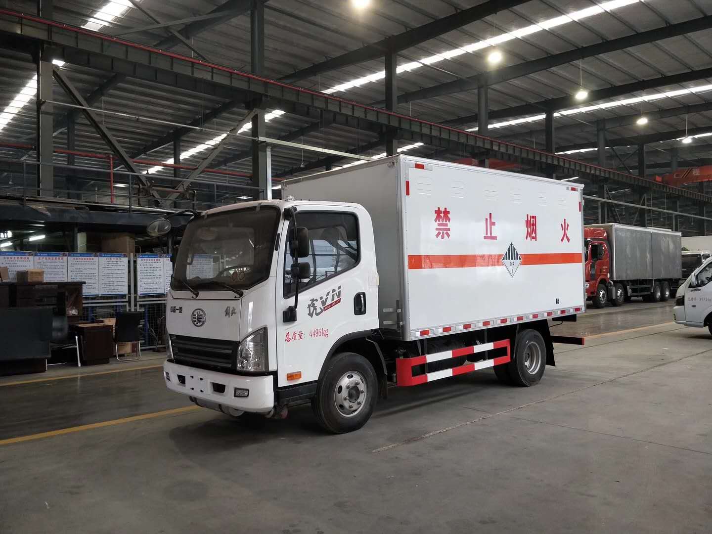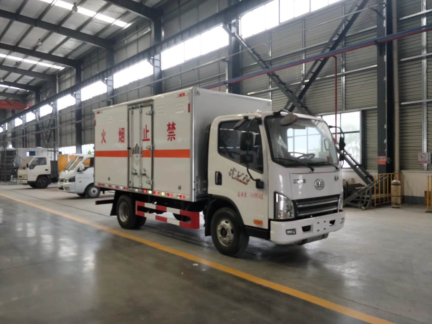 解放虎V危險品車采用解放危險品車底盤,外形尺寸:5995*2130*2800mm,廂體內尺寸:4050*2000*1800mm,濰柴110馬力國五柴油發動機,3300mm軸距,7.00R16輪胎,帶方向助力、帶空調、帶前盤制動,排氣管前置,帶限速器及大燈可調節裝置,廂體采用雙層金屬骨架,外冷軋板、內鋁板,中間夾有國標防阻燃材料,廂體底部鋪防靜電膠片,廂體內配煙霧報警器,車輛內配防盜報警器,帶防火帽、滅火器,粘貼危險品標識、反光貼,隨車帶合格證、上戶發票、隨車工具。