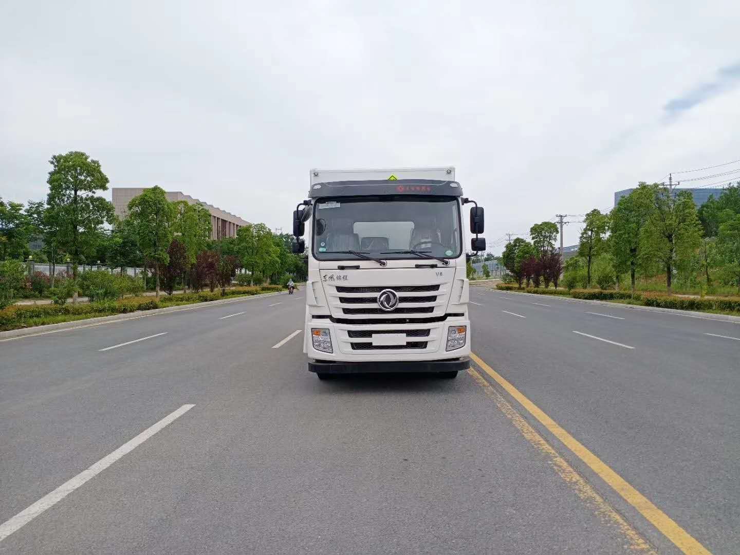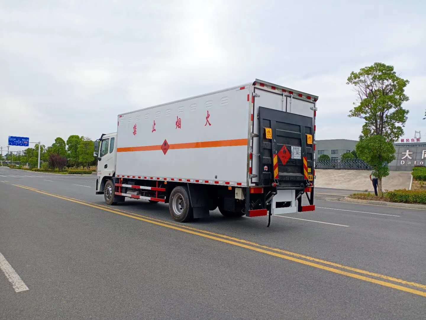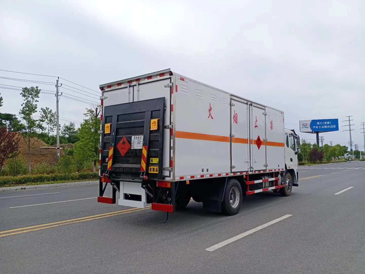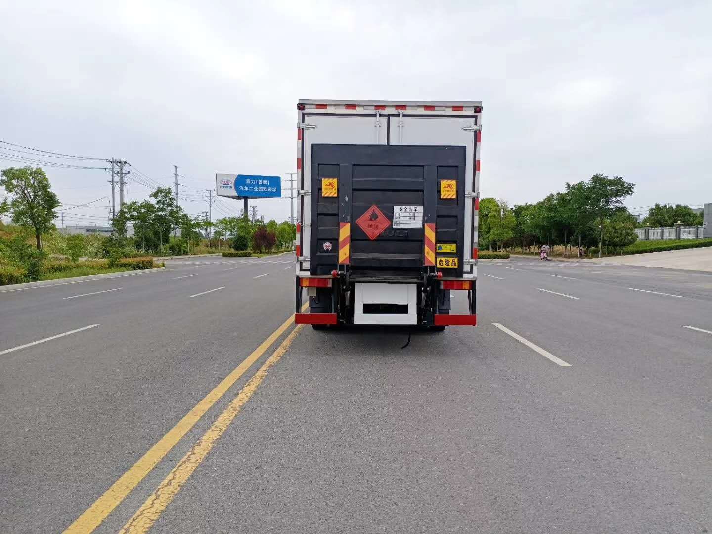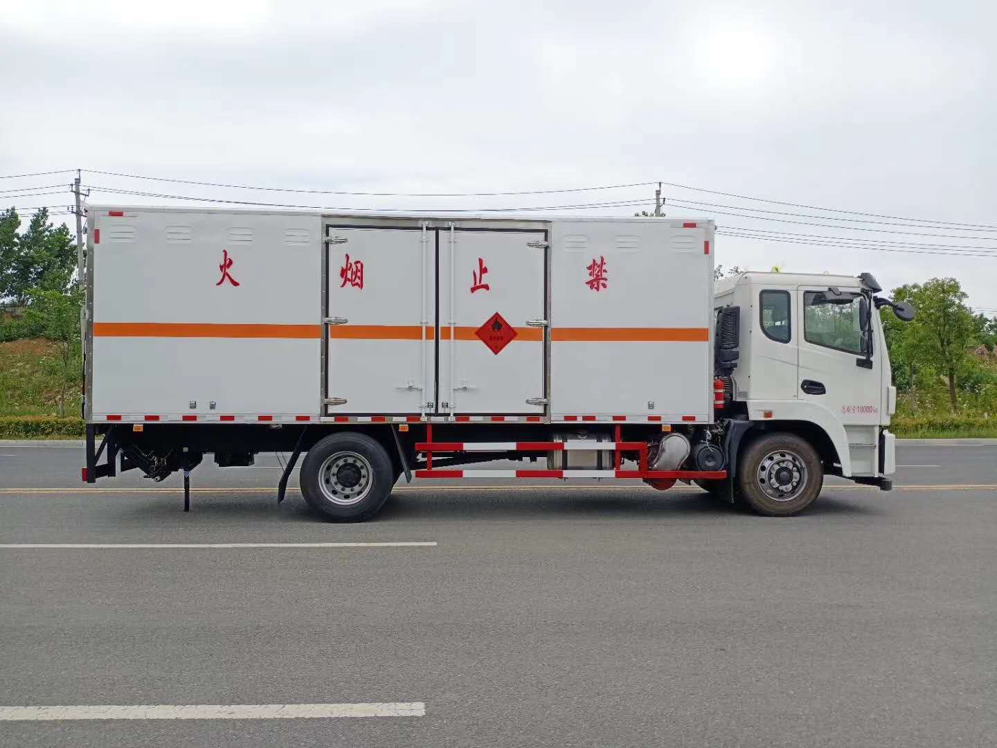 廂體配置:廂體材質(zhì)為外飾冷軋鋼板、內(nèi)飾鋁合金板、中間填充隔熱阻燃材料,選裝側(cè)門和隔倉,廂體兩側(cè)上方設(shè)有防雨功能自然通風(fēng)窗口,底部鋪有阻燃導(dǎo)靜電膠板,廂體側(cè)面裝有固定拉環(huán),與捆綁帶使用捆綁貨物以避免移動。在車廂內(nèi)頂部安裝感煙報(bào)警器,在門器框上方安裝有防盜報(bào)警器,廂體外側(cè)安裝示廓燈及滅火器支架,配置兩個滅火器,并有“嚴(yán)禁煙火”和“易燃液體”等字樣,廂體周邊貼反光標(biāo)識。后門貼有安全告示,危險(xiǎn)品標(biāo)牌。車輛尾部副梁安裝兩條拖地導(dǎo)靜電帶,駕駛室頂部裝有安全三角燈。廂體顏色可定制:黃、白、灰色等。