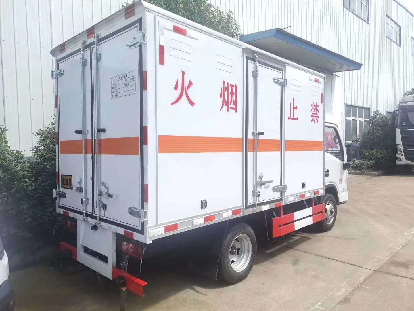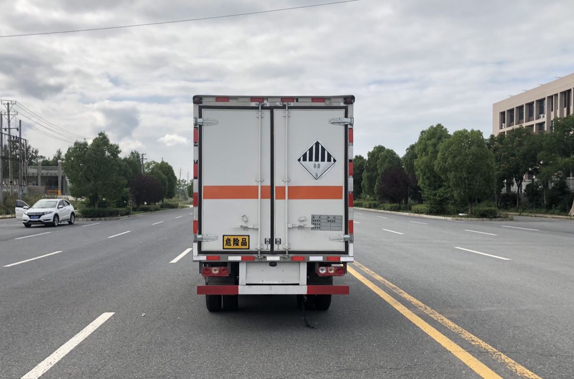 躍進S80國六雜項危險品車廂體材質為外飾冷軋鋼板、內飾鋁合金板、中間填充隔熱阻燃材料,選裝側門和隔倉,廂體兩側上方設有防雨功能自然通風窗口,底部鋪有阻燃導靜電膠板,廂體側面裝有固定拉環(huán),與捆綁帶使用捆綁貨物以避免移動。在車廂內頂部安裝感煙報警器,在門器框上方安裝有防盜報警器,廂體外側安裝示廓燈及滅火器支架,配置兩個滅火器,并有“嚴禁煙火”和“爆”等字樣,廂體周邊貼反光標識。后門貼有安全告示,危險品標牌。車輛尾部副梁安裝兩條拖地導靜電帶,駕駛室頂部裝有安全三角燈。廂體顏色可定制:黃、白、灰色等。