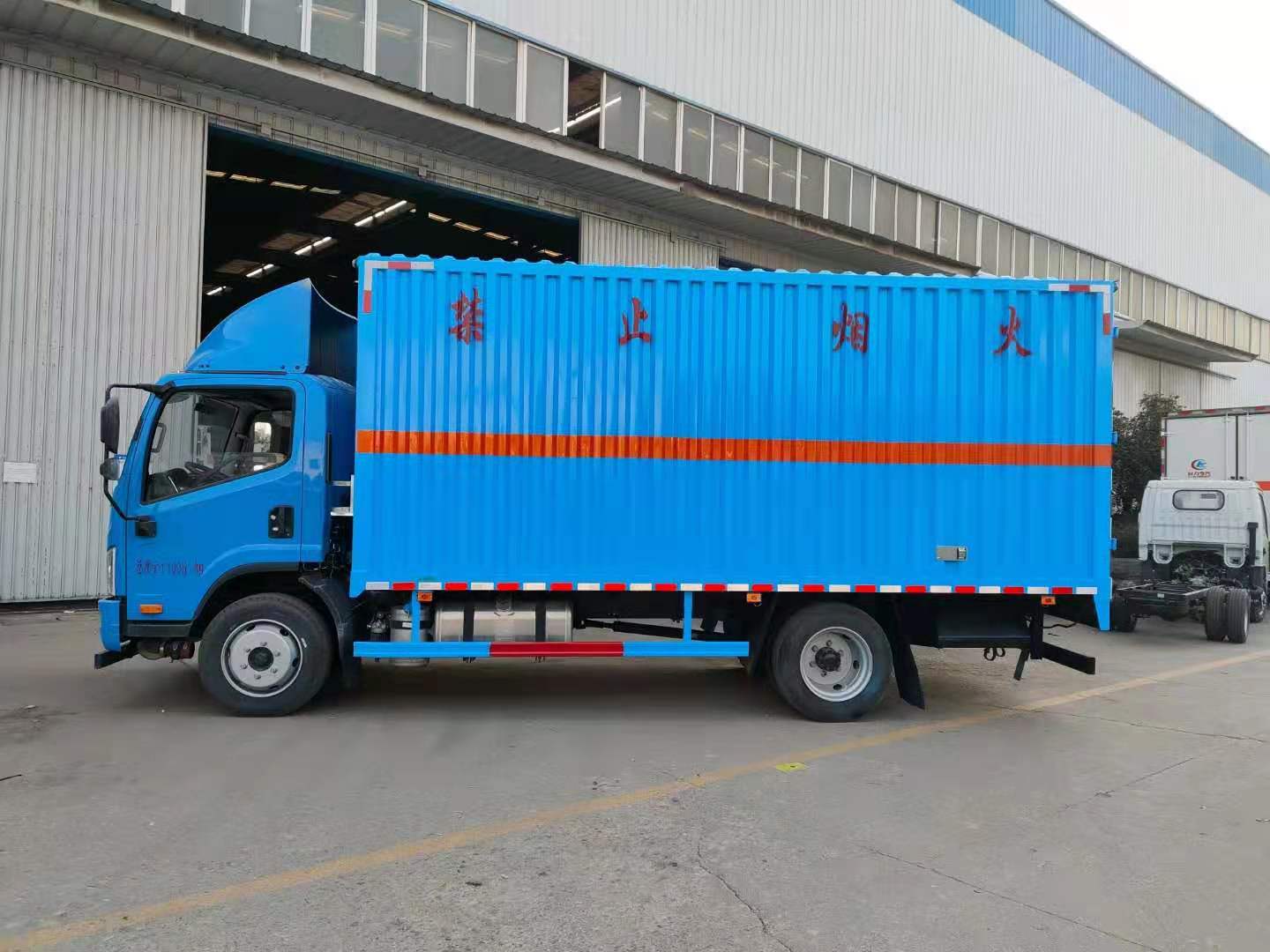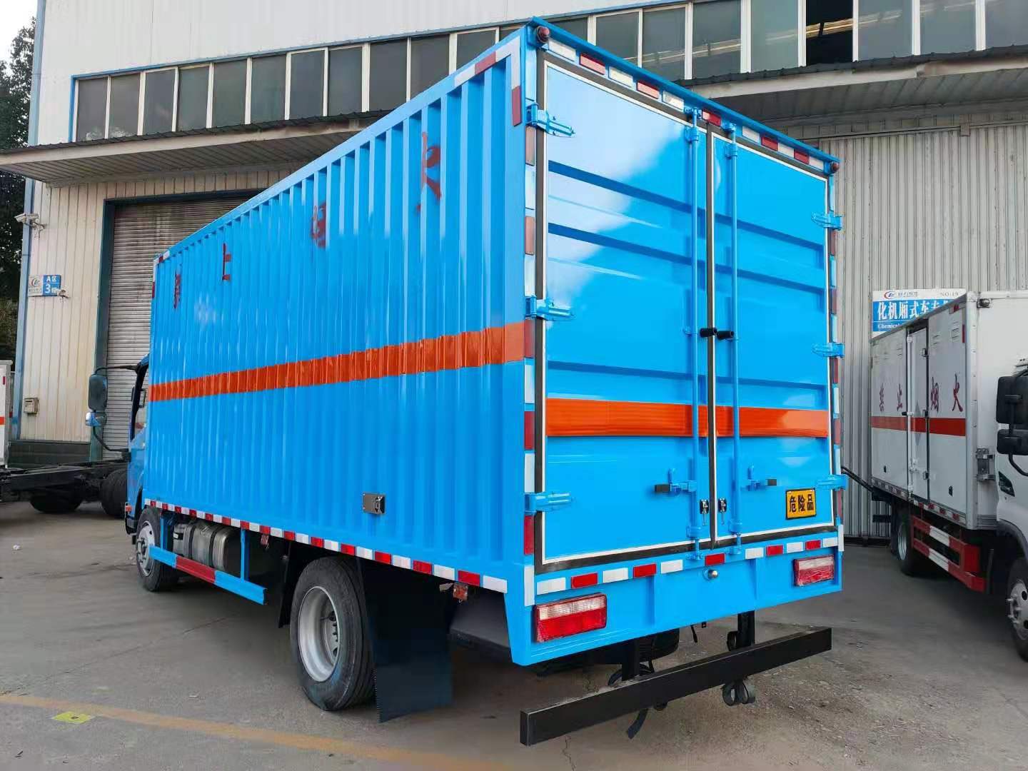 解放J6F藍色黃牌易燃氣體廂式運輸車整車型號:CA5129XRQP40K2L2E5A84型解放J6F(國五)黃牌易燃氣體廂式運輸車,貨廂尺寸(可選):5150×2170、2300×2100、2300(mm);整車尺寸(可選):6998×2300、2420×3180、3380 (mm)。總質(zhì)量:11995?kg,整備質(zhì)量:4400?kg,額定載質(zhì)量:7400?kg。廂體生產(chǎn)工藝:廂體為瓦楞板結(jié)構(gòu);底板上鋪防靜電膠皮;廂體內(nèi)加裝安全防盜報警器、煙火探測報警器;其他按標配配備:靜電帶、安全告示牌、危險品銘牌、反光標示及警告標志、滅火器、危險品頂燈、防火罩;嚴格按照國家公告尺寸、圖片等要求生產(chǎn)。采用CA1129P40K2L2BE5A84型危險品運輸專用底盤,軸距3900(mm),155馬力大柴發(fā)動機:CA4DD1-15E5,排氣管前置,前軸裝盤式制動器,裝限速裝置, 裝防抱制動(ABS);方向助力、原廠空調(diào)。