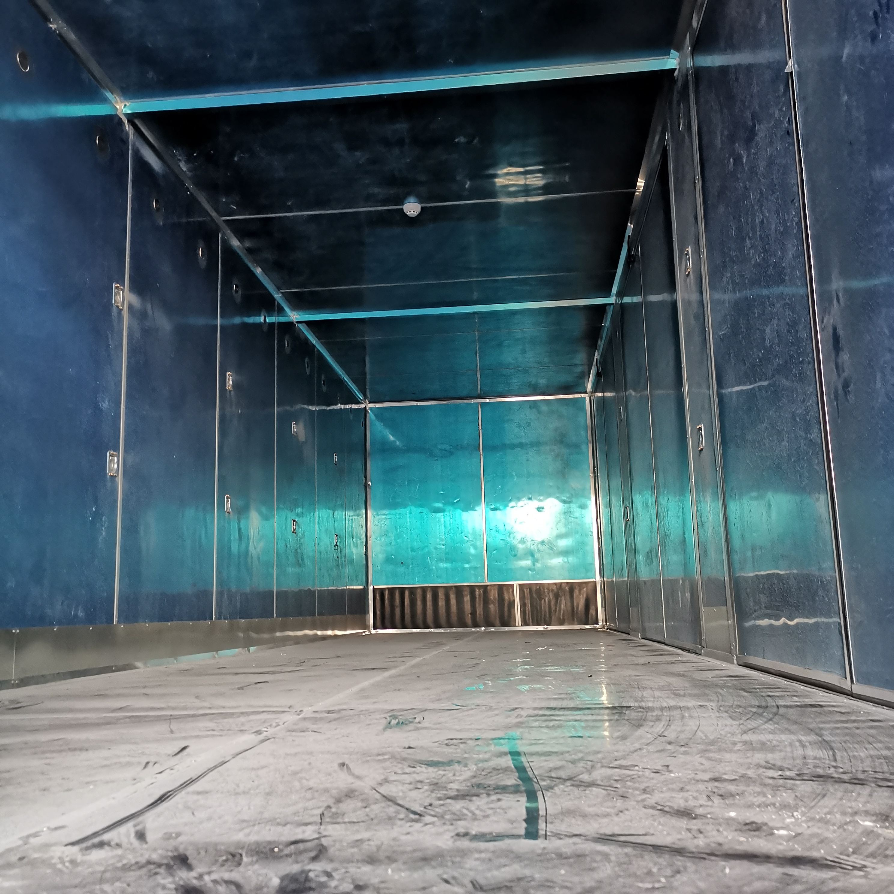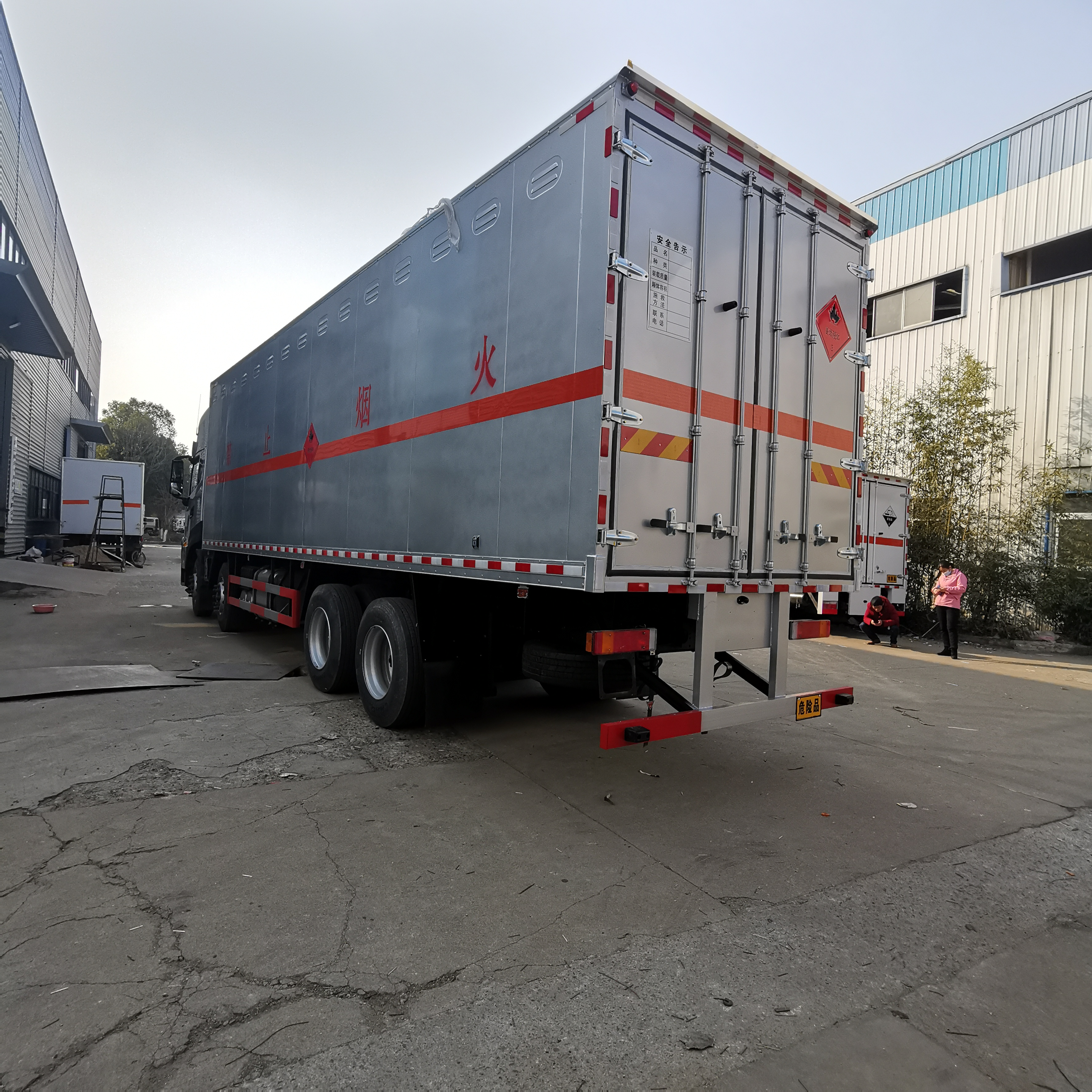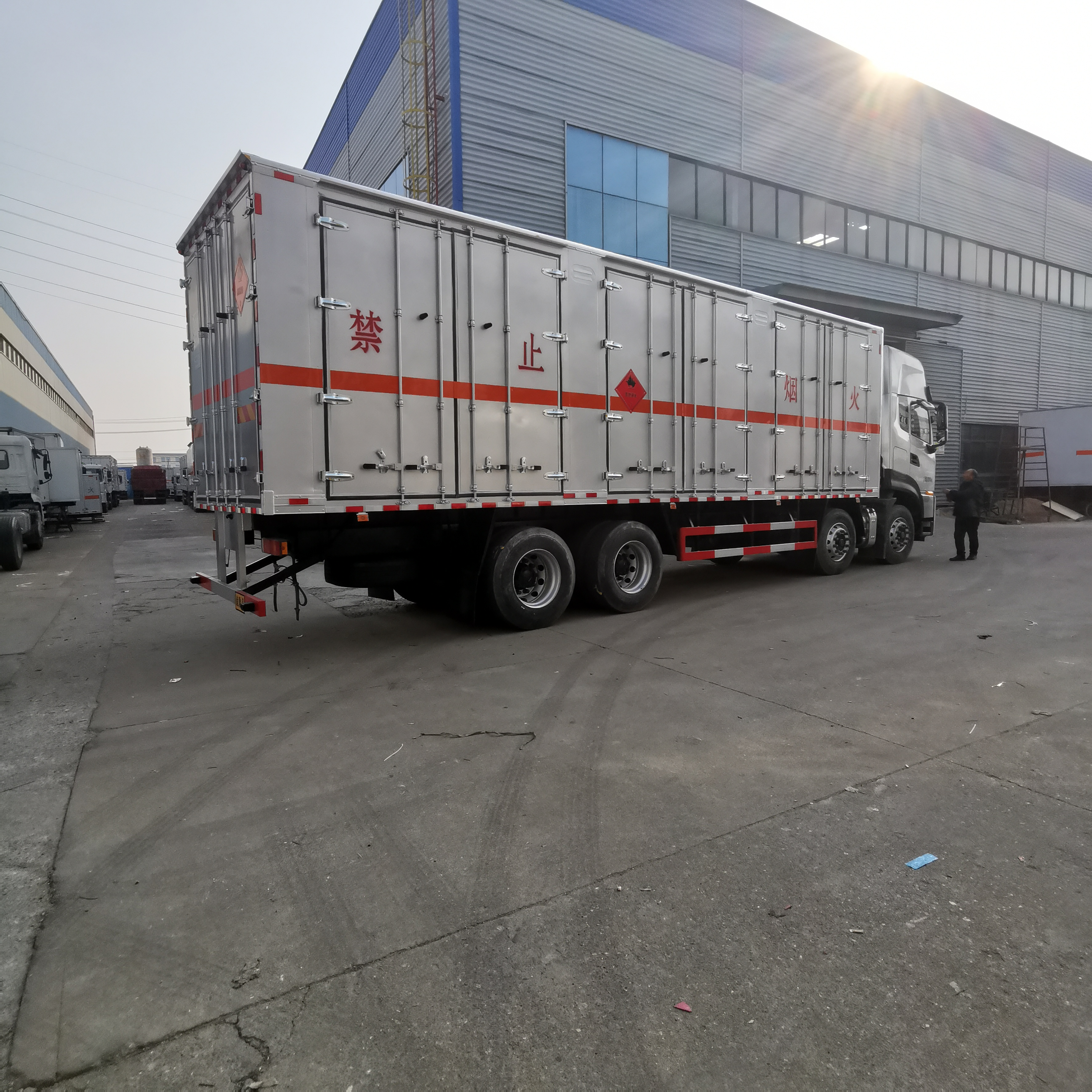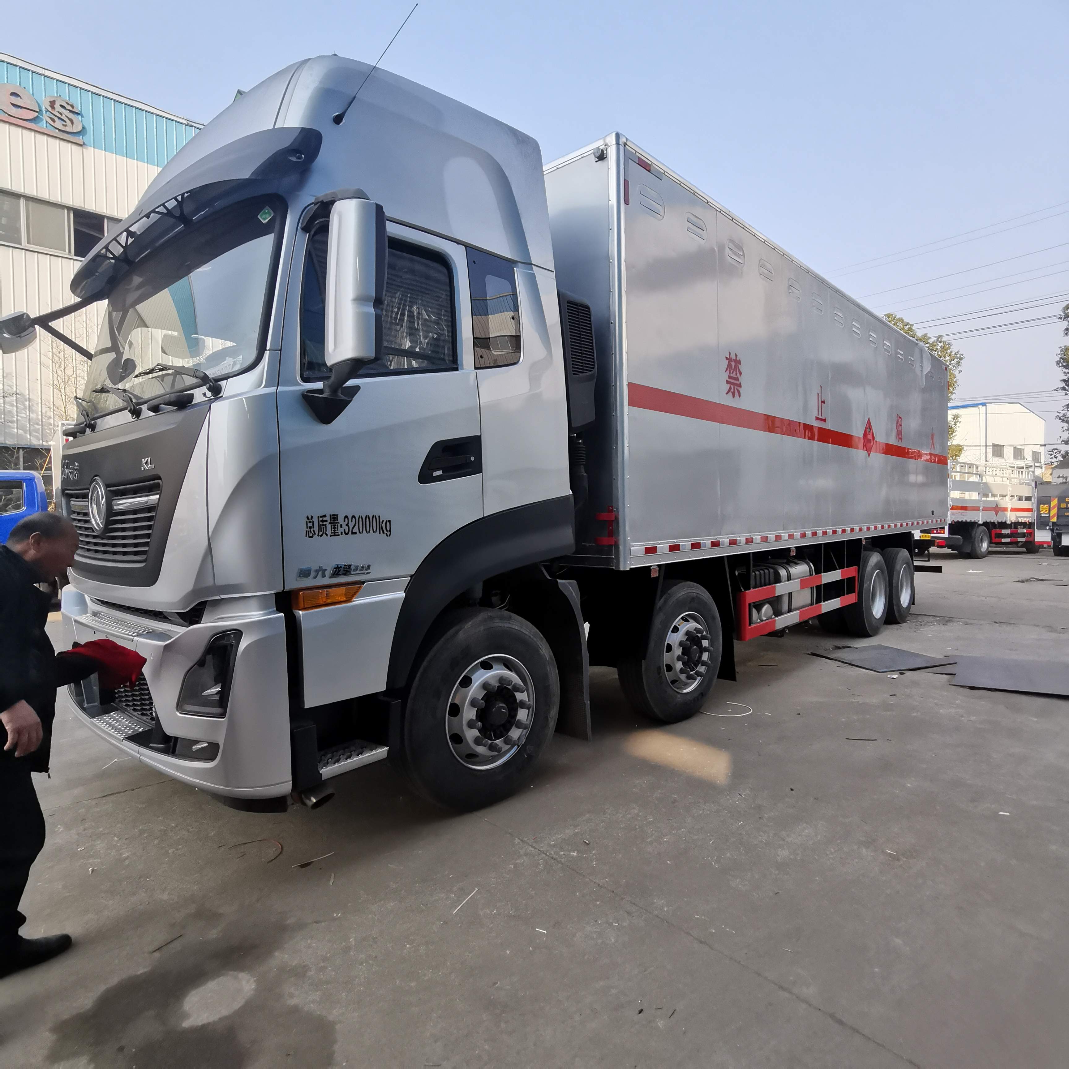東風天龍前四后八銀色國六危險品車采用欄板車結構,外厚度為1.1毫米厚度武鋼冷軋鋼板(或沖壓成瓦楞板,以公告為準),內加強“幾”字型加強梁,車體底板加強處理并做防靜電處理。車體的左側、右側,和后欄板栓鉤結構,可向下打開,方便上下貨物,車體為密封廂式車型,大大減少了運輸物品因為狹窄空和強烈碰撞產生氣瓶爆炸的危險性,箱體外觀涂裝白色油漆,在欄板的中間位置粘貼橙色的危化車標帶,并在車體的左、右、后部粘貼“爆”字標識。駕駛室內部配備兩只滅火器,后保險杠處安裝防追尾事故的緩沖固定塊。此款車輛屬于國家規定的危險品二類危險品運輸車。