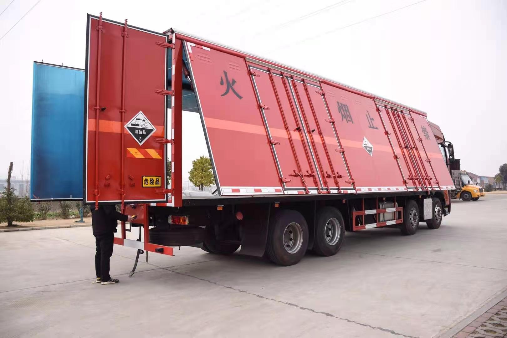 柳汽乘龍前四后八翼展危險品車嚴格按照公告尺寸制作,外板采用1mm厚冷軋板有一次性成型的百葉窗,內飾為導電性能良好的鋁板有透氣孔,內襯為矩形管骨架牢靠穩定,內部填充為透氣防潮阻燃的擠塑板,四種材料經現代工藝復合而成,廂體外部上下鋁合金型材包邊,底板和車廂前下部鋪橡膠皮,后門雙開,右側中部單開門,霧報警器和門防盜報警器,嚴格按照國家危險品相關法規張貼。
