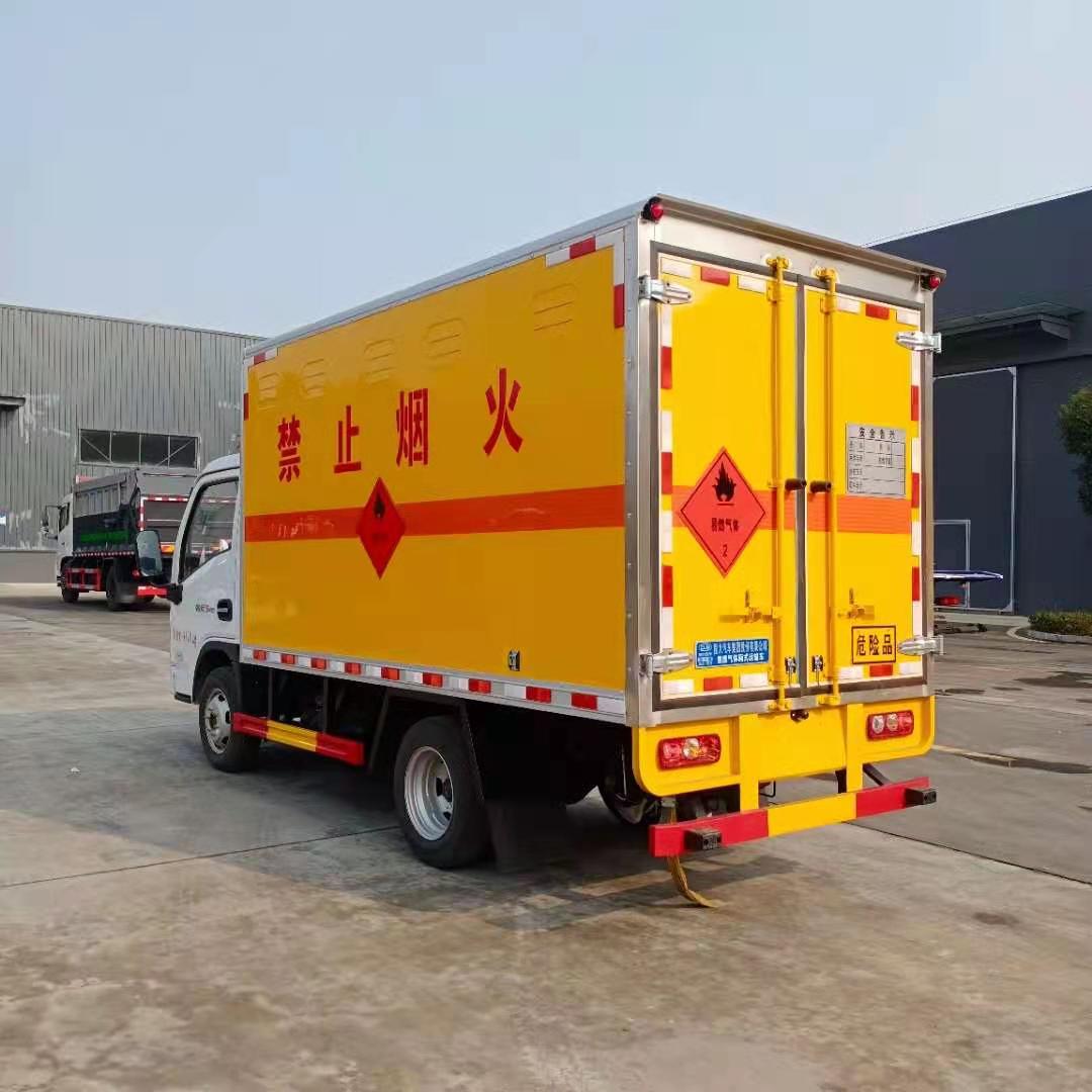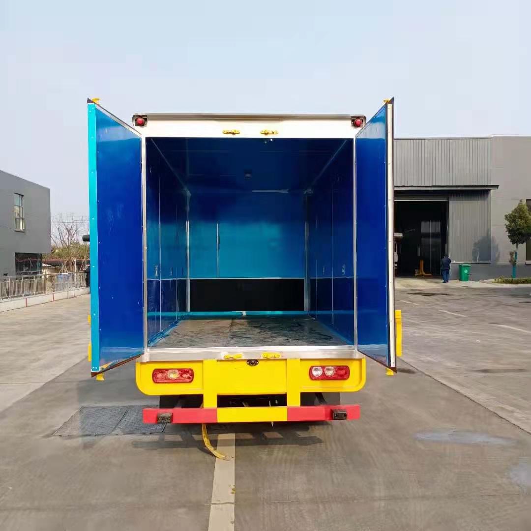 國六躍進柴油版易燃氣體廂式運輸車廂體采用外飾冷軋鋼板,內飾鋁合金板,中間填充隔熱阻燃材料,(選裝側門和隔倉)廂體兩側上方設有防雨功能自然通風窗口,底部鋪有阻燃導靜電膠板,廂體側面裝有固定拉環(huán),與捆綁帶使用捆綁貨物以避免移動。在車廂內頂部安裝感煙報警器,在門器框上方安裝有防盜報警器,廂體外側安裝示廓燈及滅火器支架,配置兩個滅火器,并有“嚴禁煙火”和“爆”等字樣,廂體周邊貼反光標識。后門貼有安全告示,危險品標牌。車輛尾部安裝兩條拖地導靜電膠帶,駕駛室頂部裝有安全三角燈。廂體顏色有:黃、白、灰色等可選。