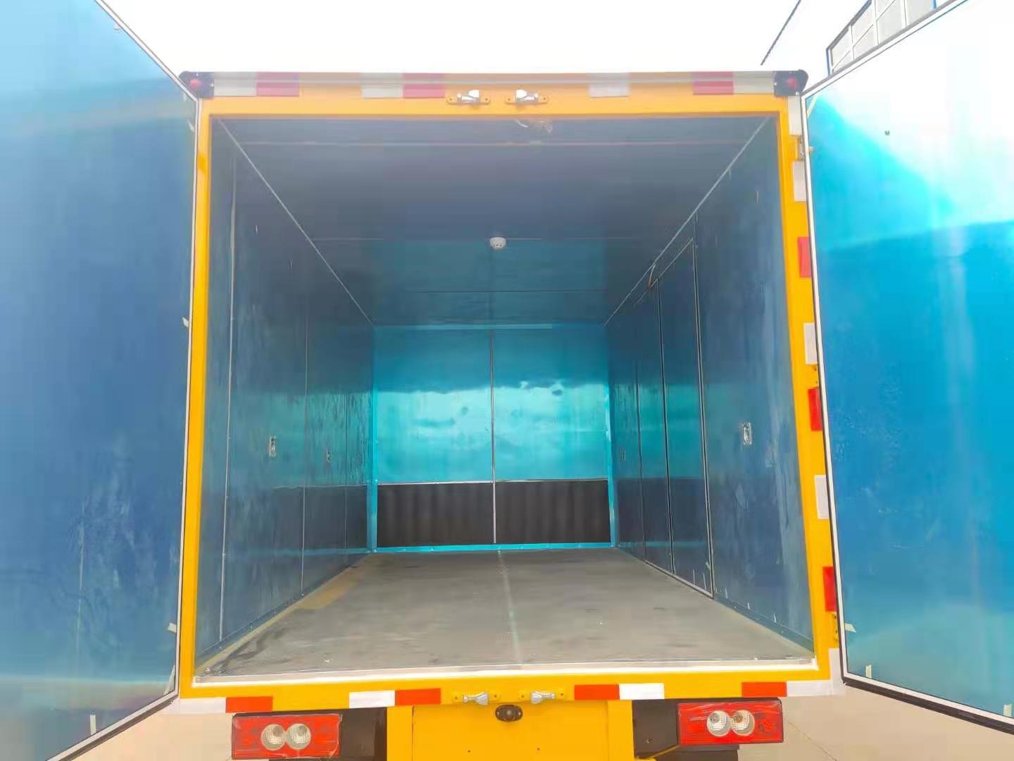 福田時代藍牌寬體危險品車嚴格按照公告尺寸制作,外板采用1mm厚冷軋板有一次性成型的百葉窗,內飾為導電性能良好的鋁板有透氣孔,內襯為矩形管骨架牢靠穩定,內部填充為透氣防潮阻燃的擠塑板,四種材料經現代工藝復合而成,廂體外部上下鋁合金型材包邊,底板和車廂前下部鋪橡膠皮,后門雙開,右側中部單開門,內部有固定貨物的臥環,車輛外部有靜電帶、滅火器、防火罩,車廂內安裝煙霧報警器和門防盜報警器,嚴格按照國家危險品相關法規張貼。