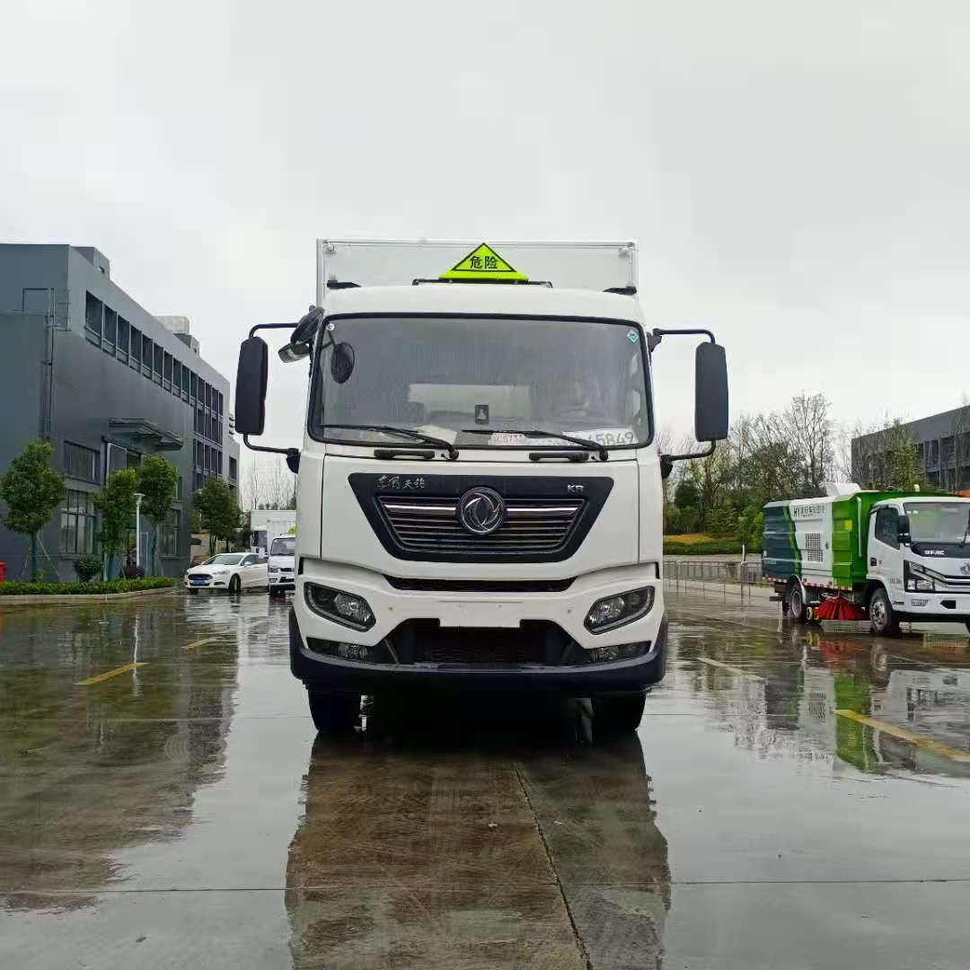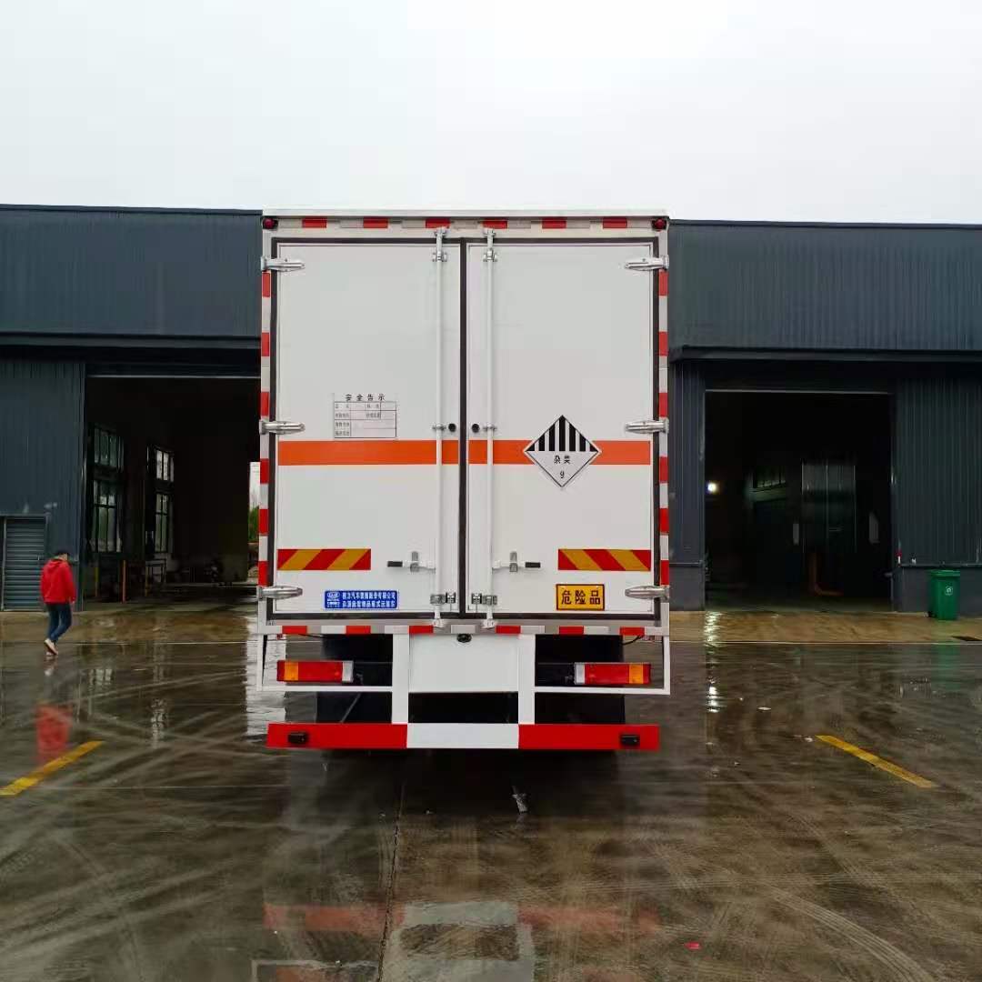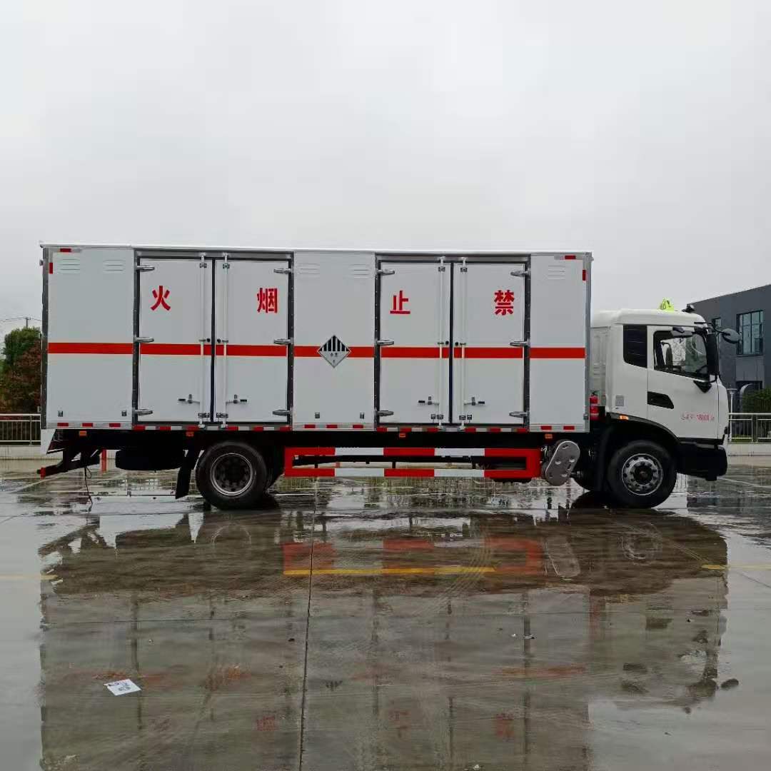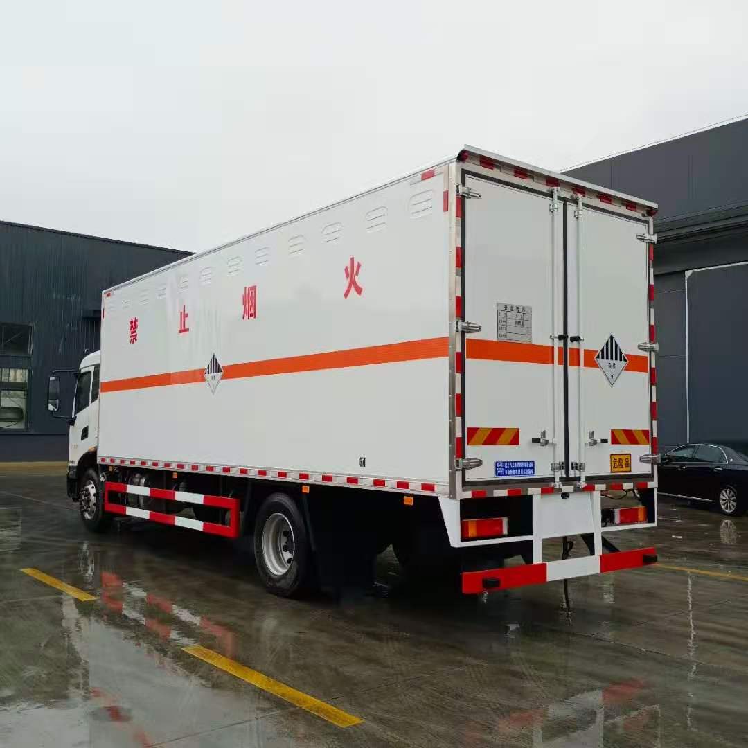 東風天錦KR國六危險品車嚴格按照公告尺寸制作,外板采用1mm厚冷軋板有一次性成型的百葉窗,內飾為導電性能良好的鋁板有透氣孔,內襯為矩形管骨架牢靠穩定,內部填充為透氣防潮阻燃的擠塑板,四種材料經現代工藝復合而成,廂體外部上下鋁合金型材包邊,底板和車廂前下部鋪橡膠皮,后門雙開,右側中部兩個雙開門,內部有固定貨物的臥環,車輛外部有靜電帶、滅火器、防火罩,車廂內安裝煙霧報警器和門防盜報警器,嚴格按照國家危險品相關法規張貼。
