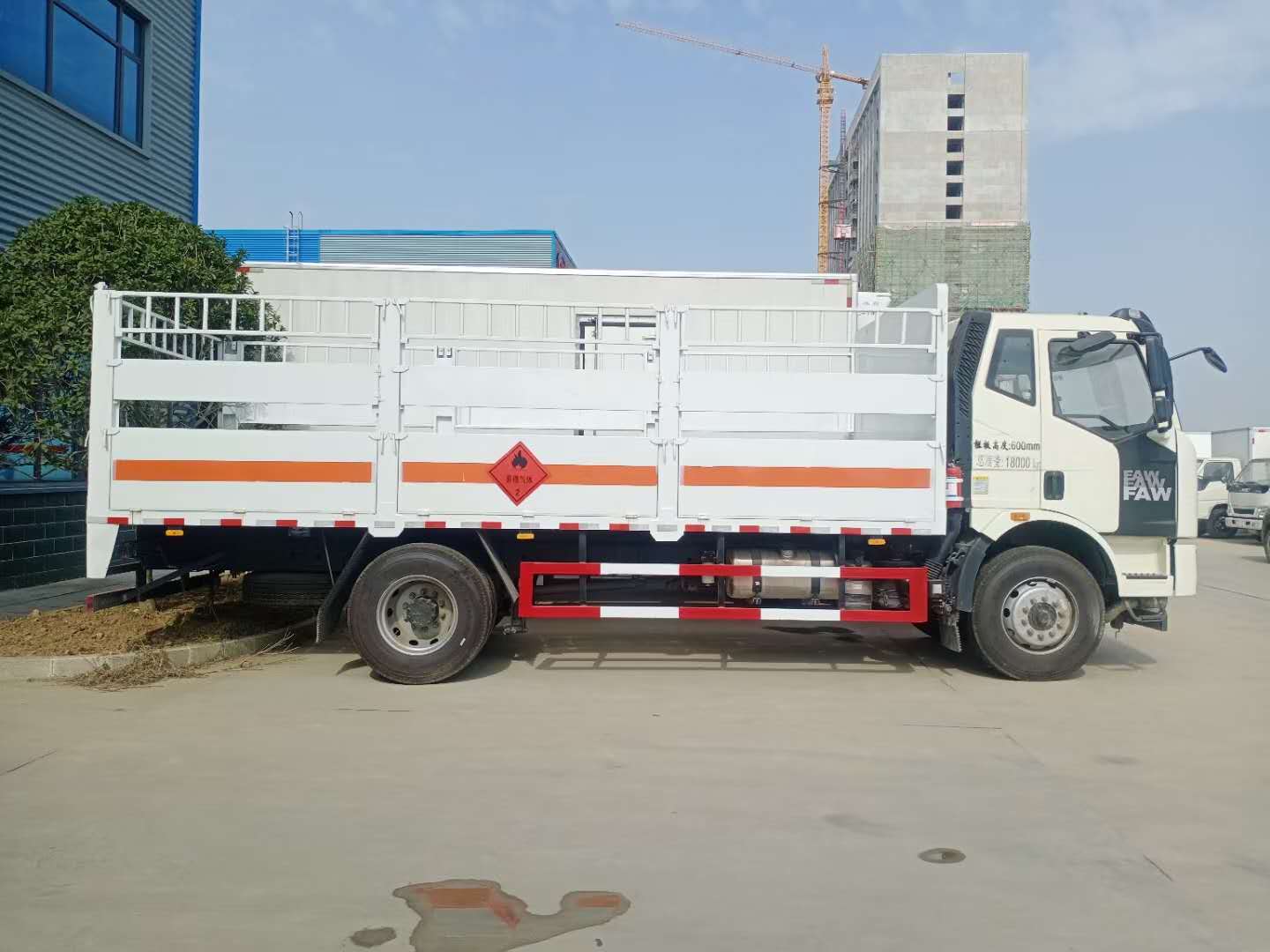 解放J6氣瓶運輸車欄板高度為600mm,可選擇低欄板或高欄,底板鋪設防靜電膠皮,底板為花紋板,橫梁和副梁為槽鋼,箱體一周粘貼橙色放光帶,箱體左右后面粘貼 易燃氣體菱形告示牌,箱體后面粘貼危險品牌和安全告示。箱體左右安裝1個滅火器,箱體后尾部安裝2根拖地靜電拖帶!該車根據(jù)客戶要求可選擇低欄板和高欄板,以下是具體實拍圖片