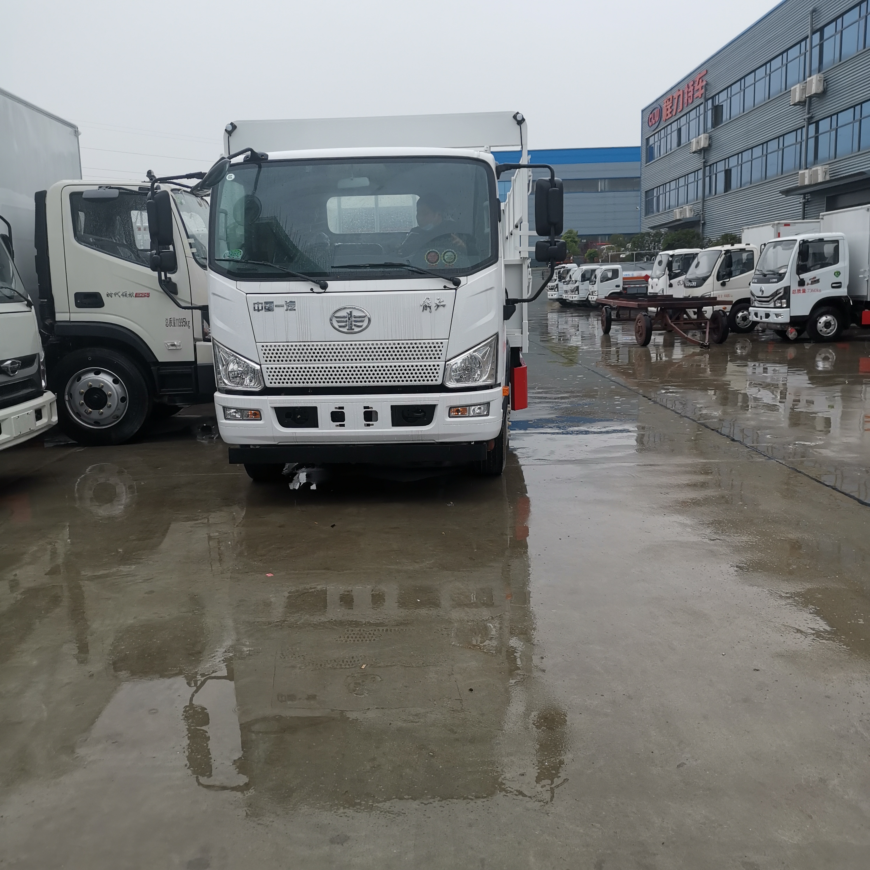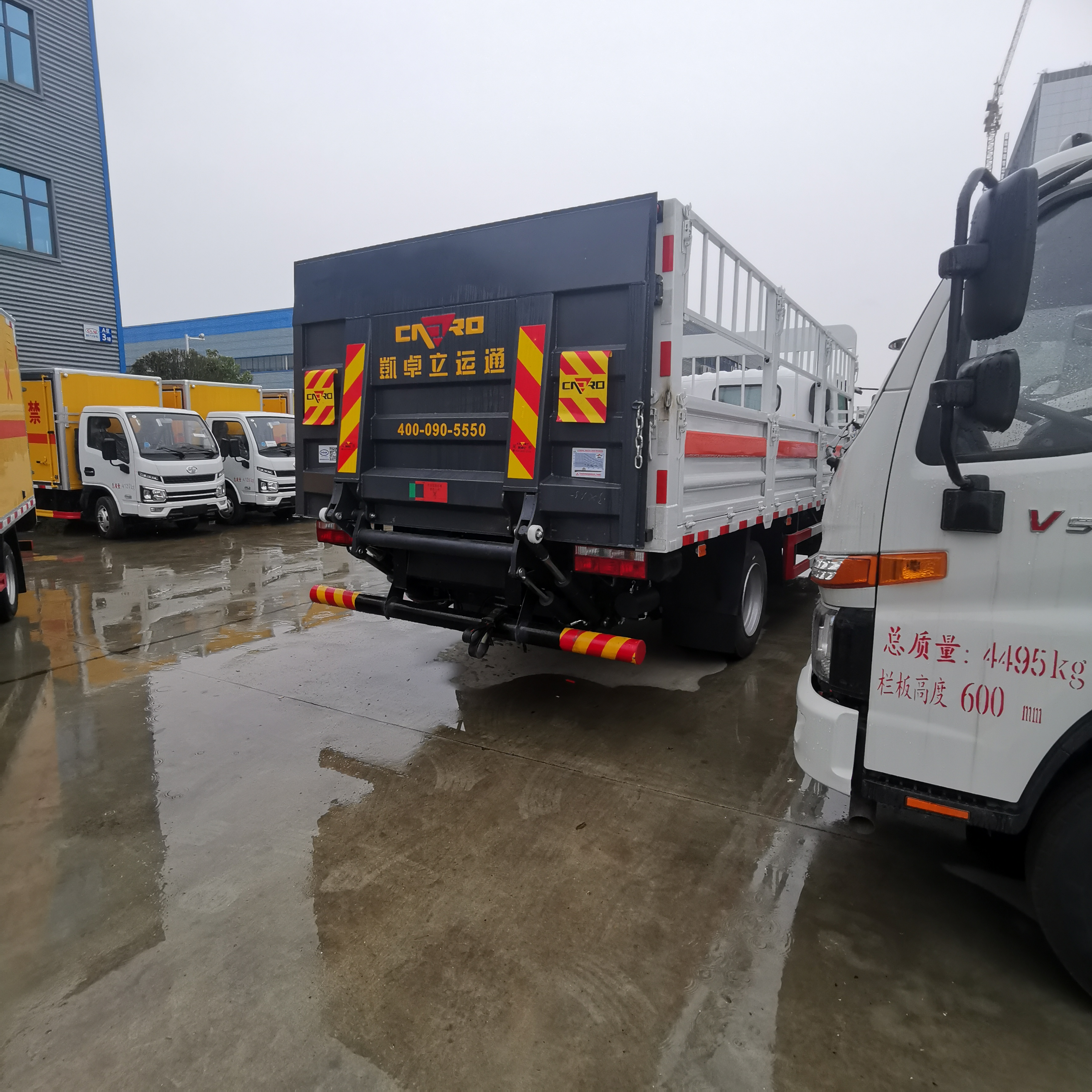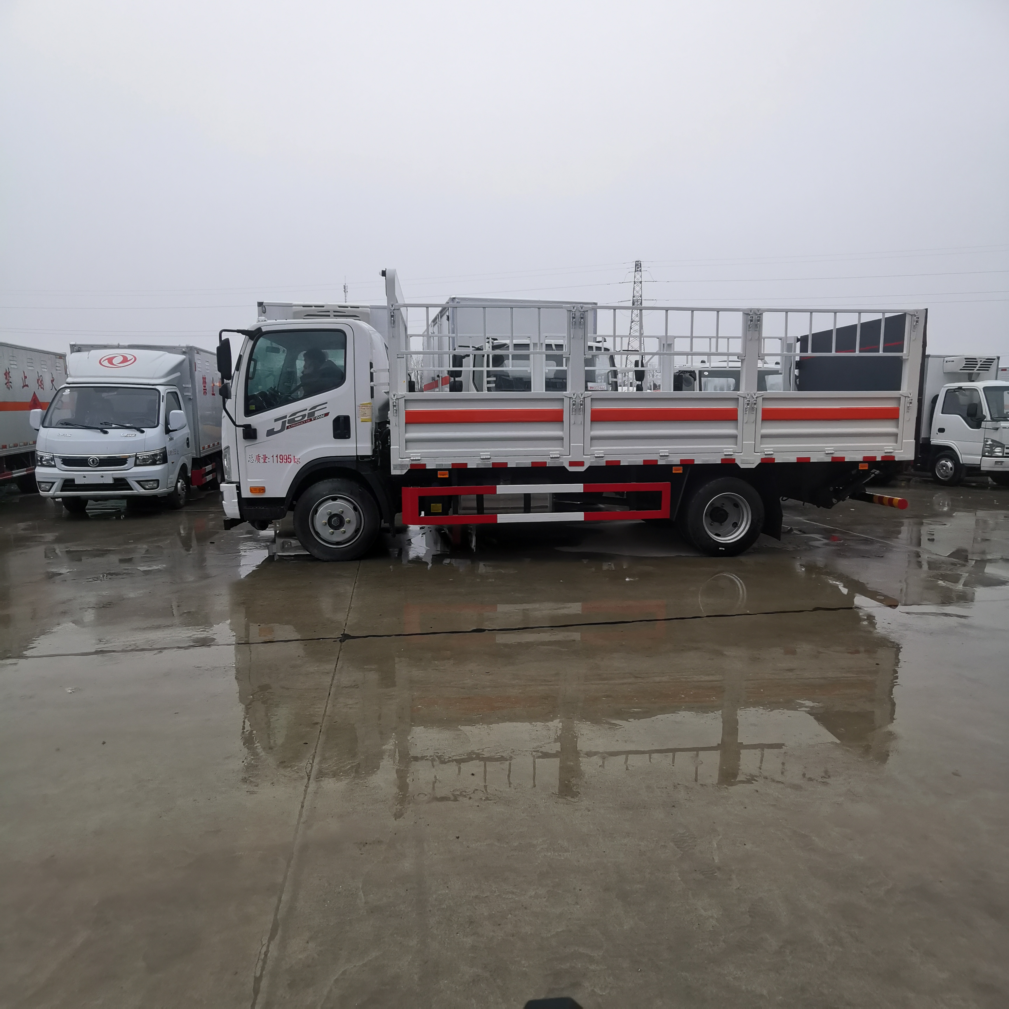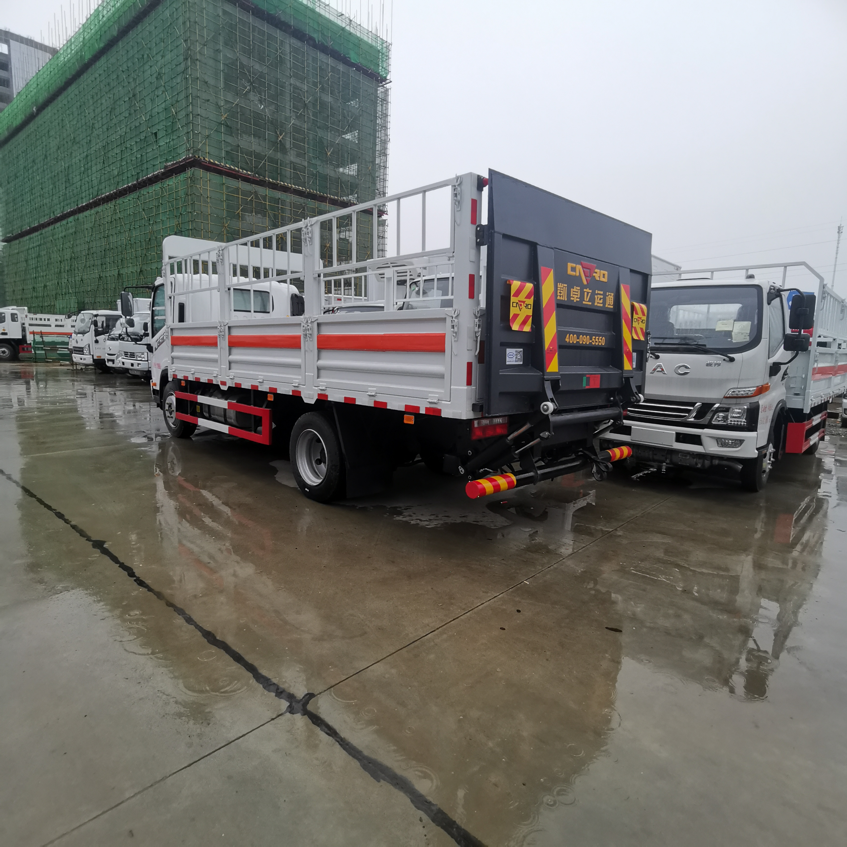 解放5米1帶液壓尾板氣瓶運輸車廂體嚴格按照公告尺寸制作,箱體采用廂式欄板車結構,外厚度為1.1毫米厚度武鋼冷軋鋼板(或沖壓成瓦楞板,以公告為準),內加強“幾”字型加強梁,車體底板加強處理并做防靜電處理。車體的左側、右側,和后欄板栓鉤結構,可向下打開,方便上下貨物,車體為空曠式車型,大大減少了運輸物品因為狹窄空和強烈碰撞產生氣瓶爆炸的危險性,箱體外觀涂裝白色油漆,在欄板的中間位置粘貼橙色的危化車標帶,并在車體的左、右、后部粘貼“易燃氣體”或“不燃氣體”標識。駕駛室內部配備兩只滅火器,后保險杠處安裝防追尾事故的緩沖固定塊。此款車輛屬于國家規定的危險品二類倉欄式運輸車。廂體內部有固定貨物的臥環,車輛外部有靜電帶、滅火器、防火罩,車廂內安裝煙霧報警器和門防盜報警器,嚴格按照國家危險品相關法規張貼。