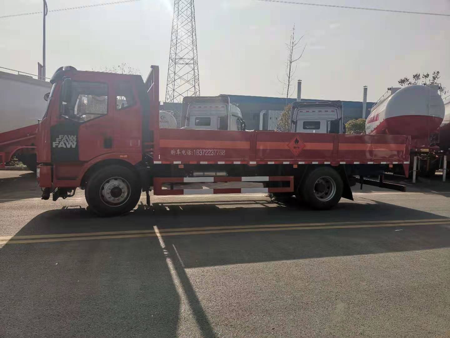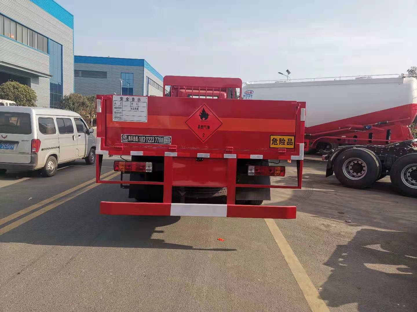 解放J6整車紅色氣瓶運輸車發車按照公告尺寸制作,底板采用5MM花紋板制作,底板上鋪靜電膠皮,低欄瓦楞式,配備滅火器,三角頂燈,靜電拖帶等,嚴格按照國家危險品法規進行“易燃氣體”標識粘貼