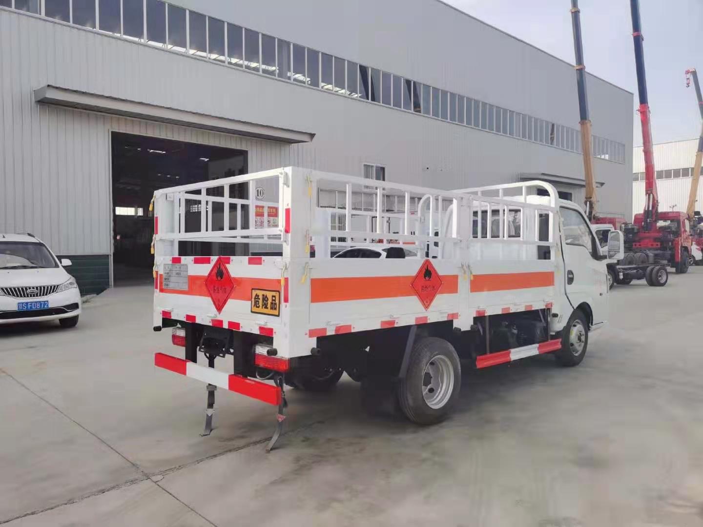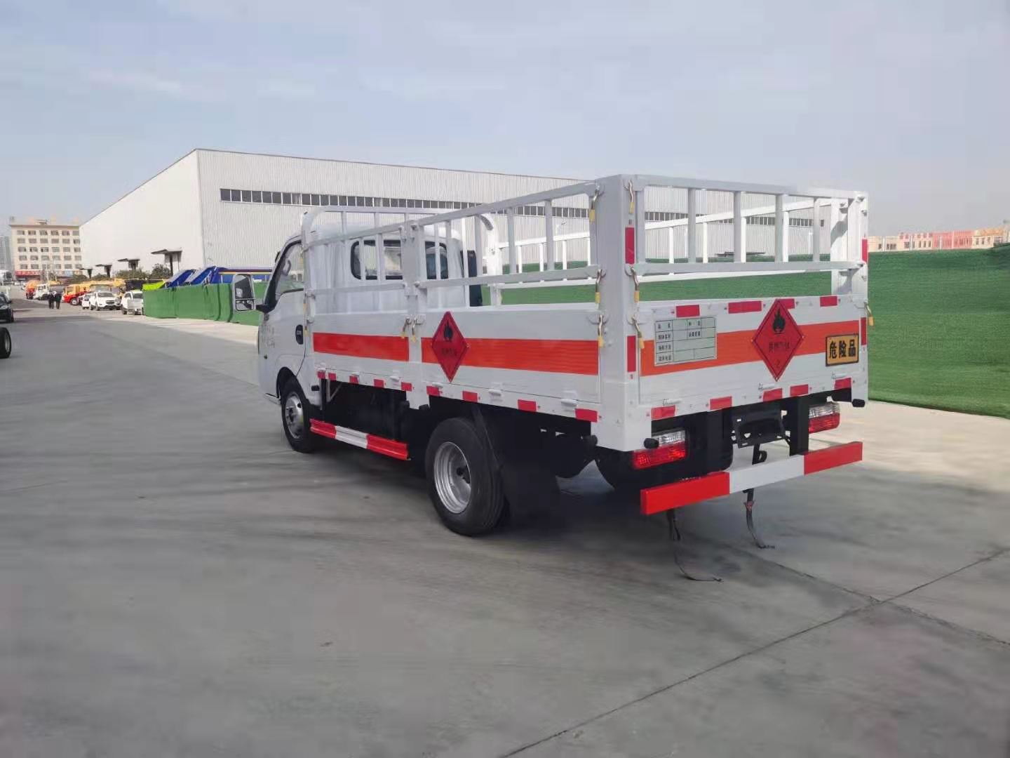國六東風途逸柴油氣瓶車箱體采用廂式欄板車結構,外厚度為1.1毫米厚度武鋼冷軋鋼板(或沖壓成瓦楞板,以公告為準),內加強“幾”字型加強梁,車體底板加強處理并做防靜電處理。車體的左側、右側,和后欄板栓鉤結構,可向下打開,方便上下貨物,車體為空曠式車型,大大減少了運輸物品因為狹窄空和強烈碰撞產生氣瓶爆炸的危險性,箱體外觀涂裝白色油漆,在欄板的中間位置粘貼橙色的危化車標帶,并在車體的左、右、后部粘貼“易燃氣體”或“不燃氣體”標識。駕駛室內部配備兩只滅火器,后保險杠處安裝防追尾事故的緩沖固定塊。此款車輛屬于國家規定的危險品二類倉欄式運輸車。廂體內部有固定貨物的臥環,車輛外部有靜電帶、滅火器、防火罩,車廂內安裝煙霧報警器和門防盜報警器,嚴格按照國家危險品相關法規張貼。