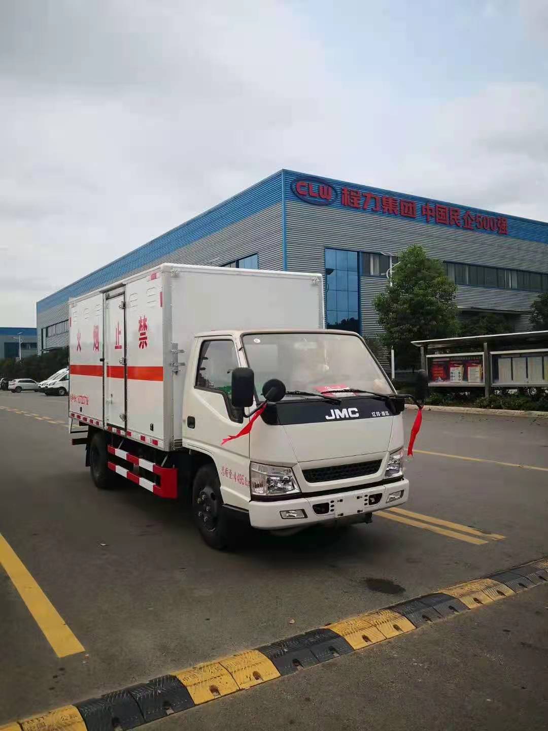江鈴國五危險品車整車型號JHW5040TQPJX,底盤型號;JX1041TG25,發動機型號:JX493ZLQ5,原廠危險品底盤,帶動轉,整車尺寸:5995*2080*2220mm,貨箱內尺寸:4150*1930*1860mm,嚴格按照公告尺寸制作,外板采用 1mm 厚冷軋板有一次性成型的百葉窗,內飾為導電性能良好的鋁板有透氣孔,內襯為矩形管骨架牢靠穩定,內部填充為透氣防潮阻燃的擠塑板,四種材料經現代工藝復合而成,廂體外部上下鋁合金型材包邊,底板和車廂前下部鋪橡膠皮,后門雙開,右側中部兩個雙開門,內部有固定貨物的臥環,車輛外部有靜電帶、滅火器、防火罩,車廂內安裝煙霧報警器和門防盜報警器,嚴格按照國家危險品相關法規張貼。廂體內部安裝便于可固定貨物的卡槽,底板為3mm鋼板上面鋪防靜電膠皮,靜電拖地帶,滅火器兩個,危險品三角頂燈,防火帽,廂體顏色白色,其他嚴格按公告制作。