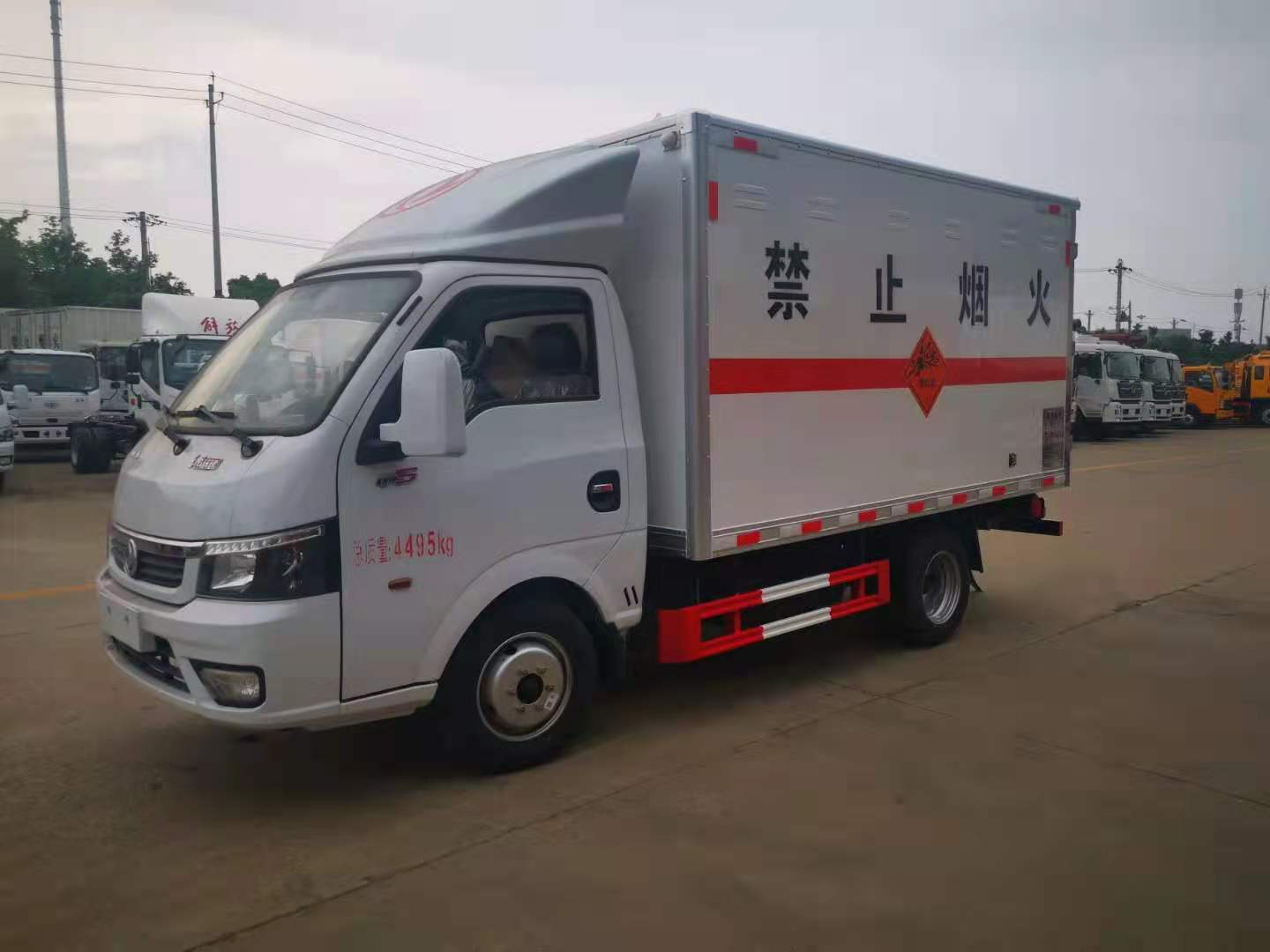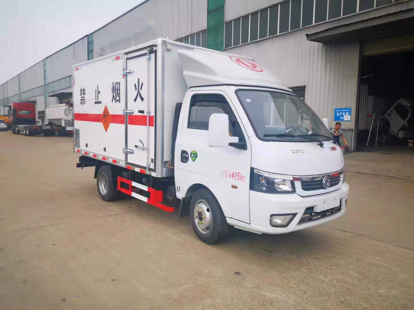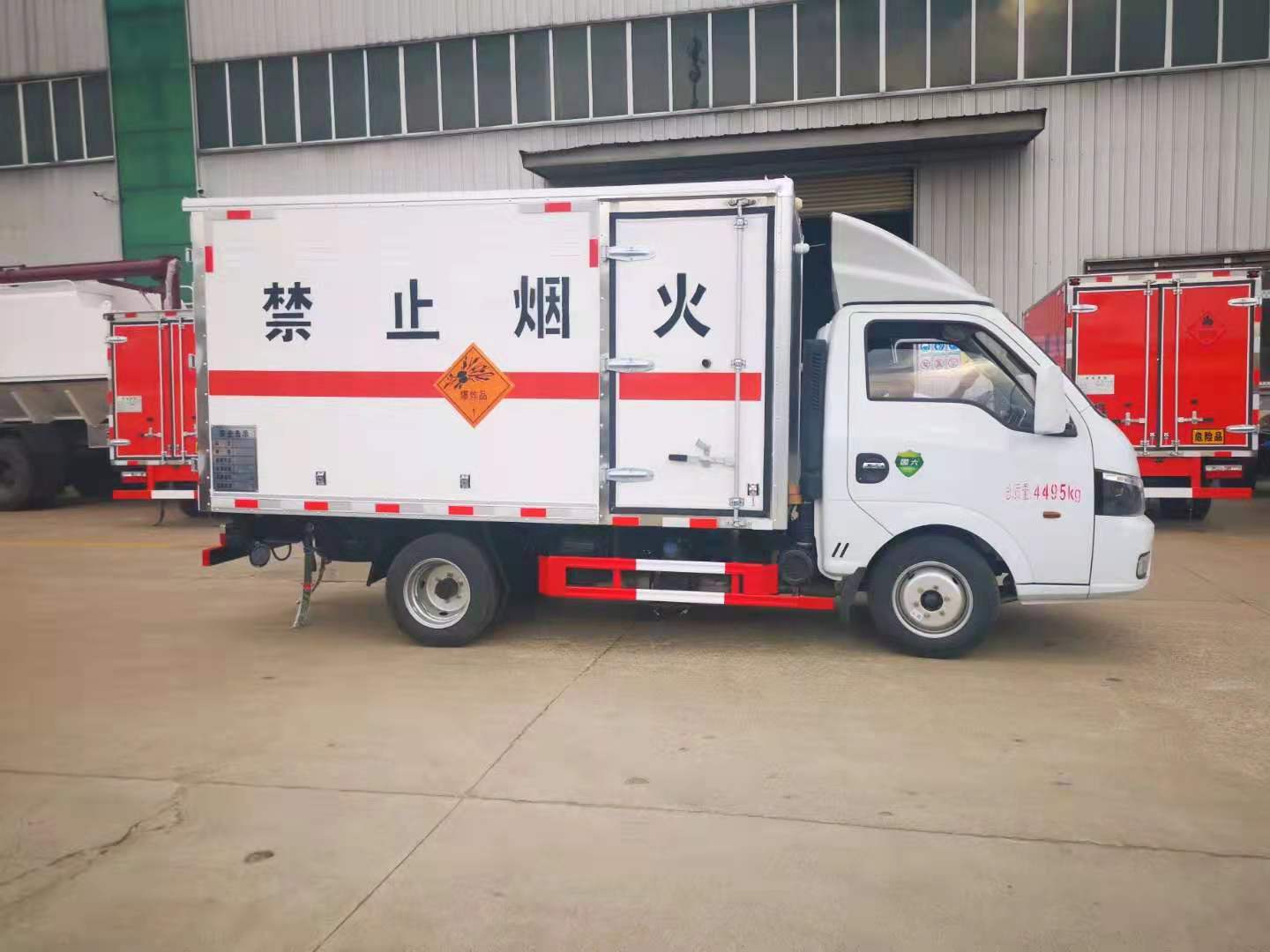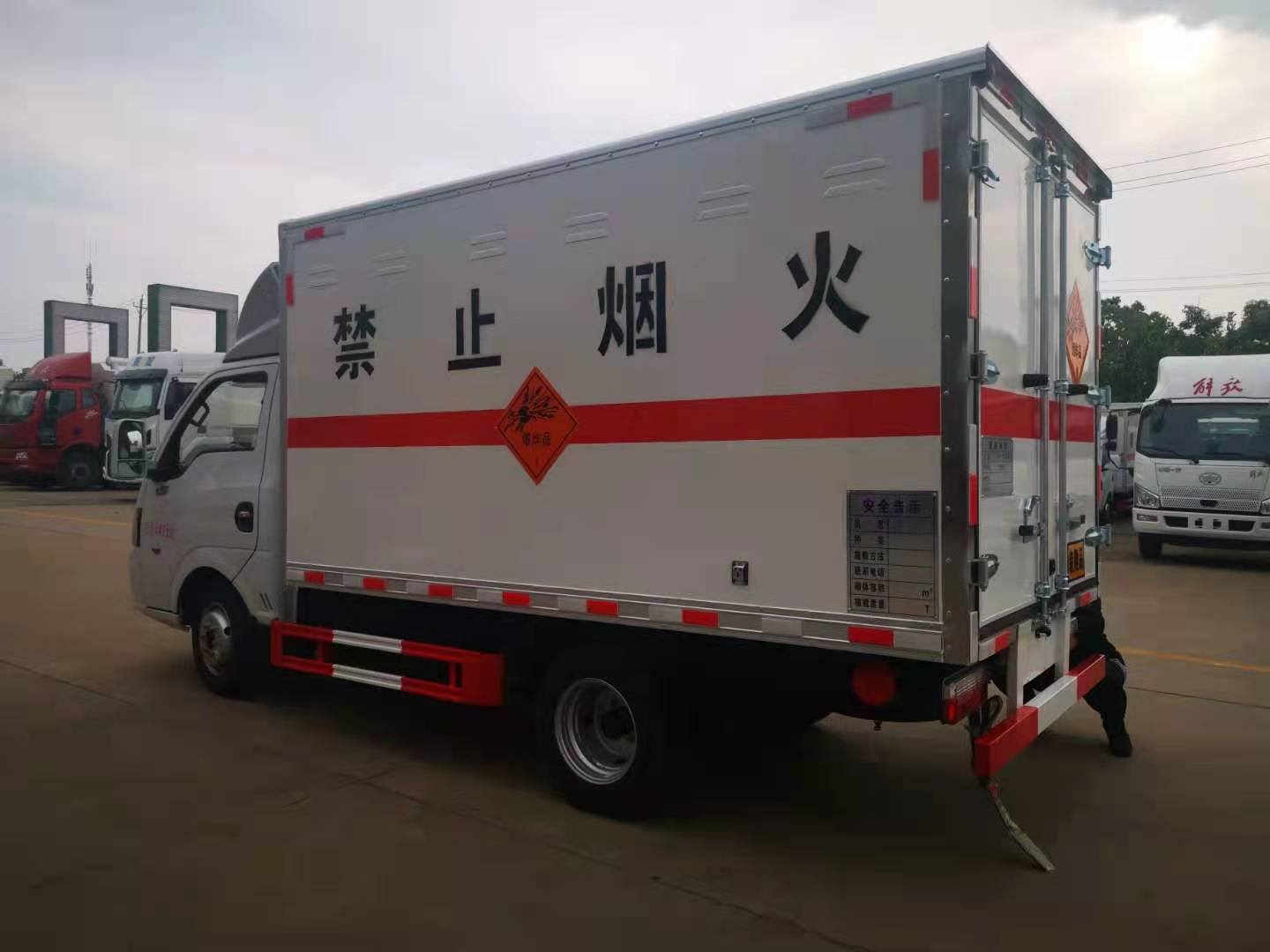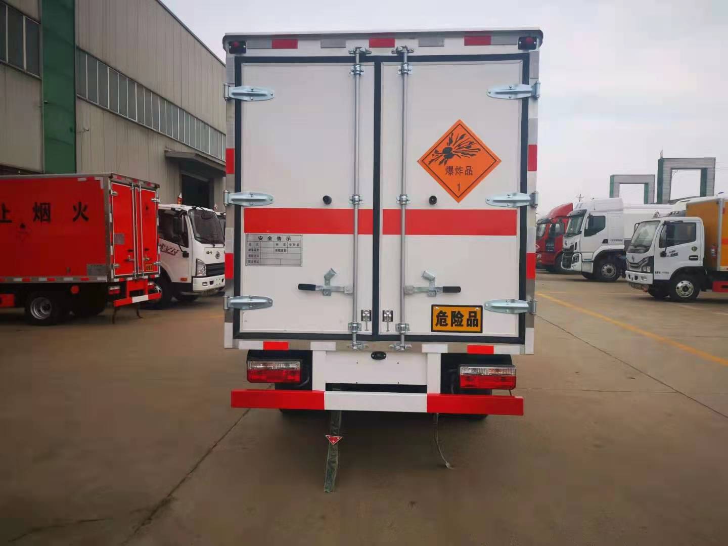 東風途逸柴油帶隔艙防爆車廂體采用外飾冷軋鋼板,內飾鋁合金板,中間填充隔熱阻燃材料,廂體兩側上方設有防雨功能自然通風窗口,底部鋪有阻燃導靜電膠板,廂體側面裝有固定拉環,與捆綁帶使用捆綁貨物以避免移動。在車廂內頂部安裝感煙報警器,在門器框上方安裝有防盜報警器,廂體外側安裝示廓燈及滅火器支架,配置兩個滅火器,并有“嚴禁煙火”和“爆”等字樣,廂體周邊貼反光標識。后門貼有安全告示,危險品標牌。車輛尾部安裝兩條拖地導靜電膠帶,駕駛室頂部裝有安全三角燈。廂體顏色有:黃、白、灰色等可選。
