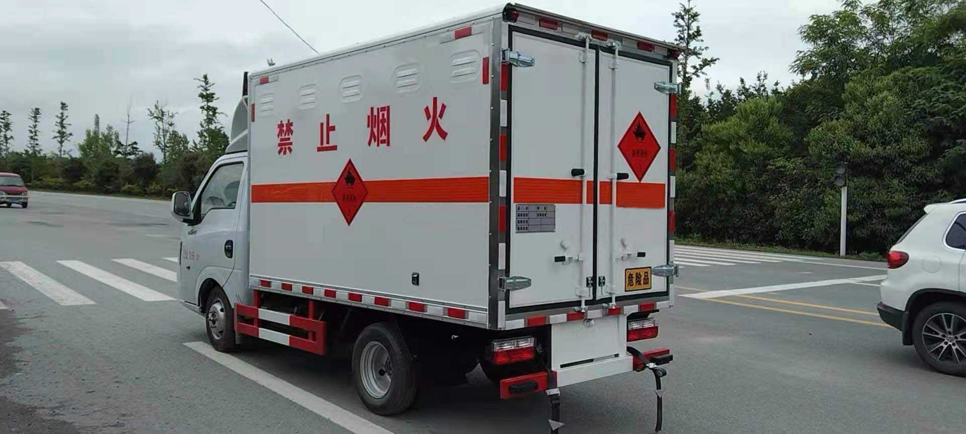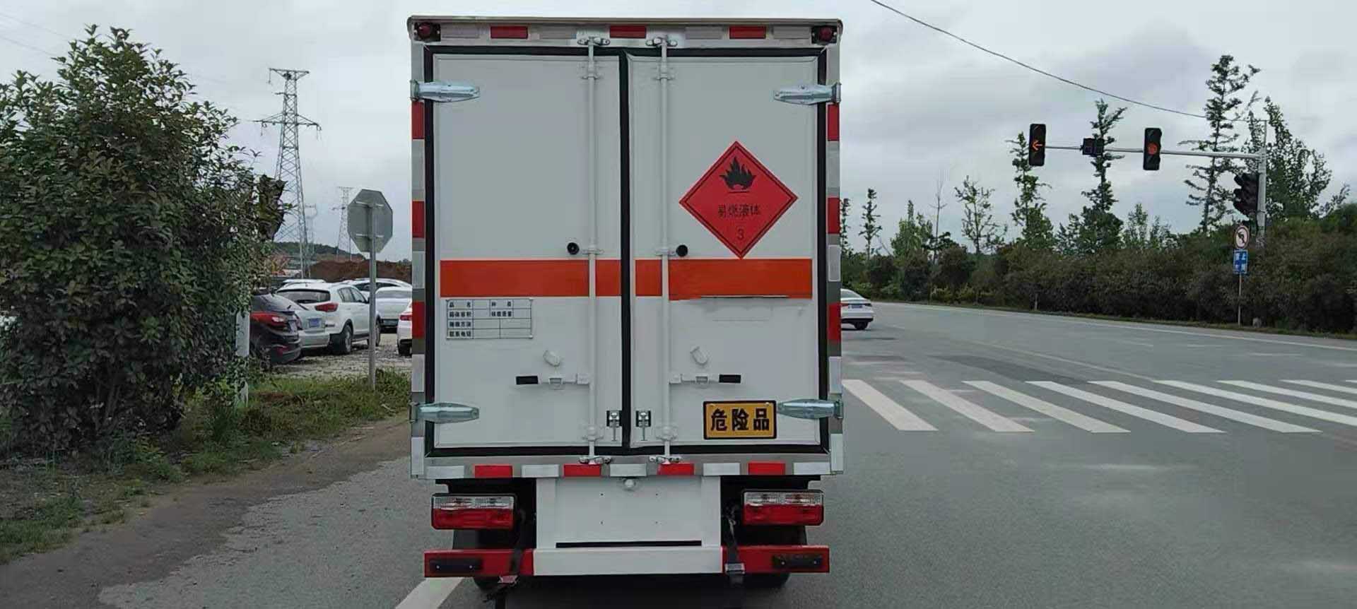 東風途逸國六柴油易燃液體廂式運輸車廂體采用外飾冷軋鋼板,內飾鋁合金板,中間填充隔熱阻燃材料,廂體兩側上方設有防雨功能自然通風窗口,底部鋪有阻燃導靜電膠板,廂體側面裝有固定拉環,與捆綁帶使用捆綁貨物以避免移動。在車廂內頂部安裝感煙報警器,在門器框上方安裝有防盜報警器,廂體外側安裝示廓燈及滅火器支架,配置兩個滅火器,并有“嚴禁煙火”和“爆”等字樣,廂體周邊貼反光標識。后門貼有安全告示,危險品標牌。車輛尾部安裝兩條拖地導靜電膠帶,駕駛室頂部裝有安全三角燈。廂體顏色有:黃、白、灰色等可選。