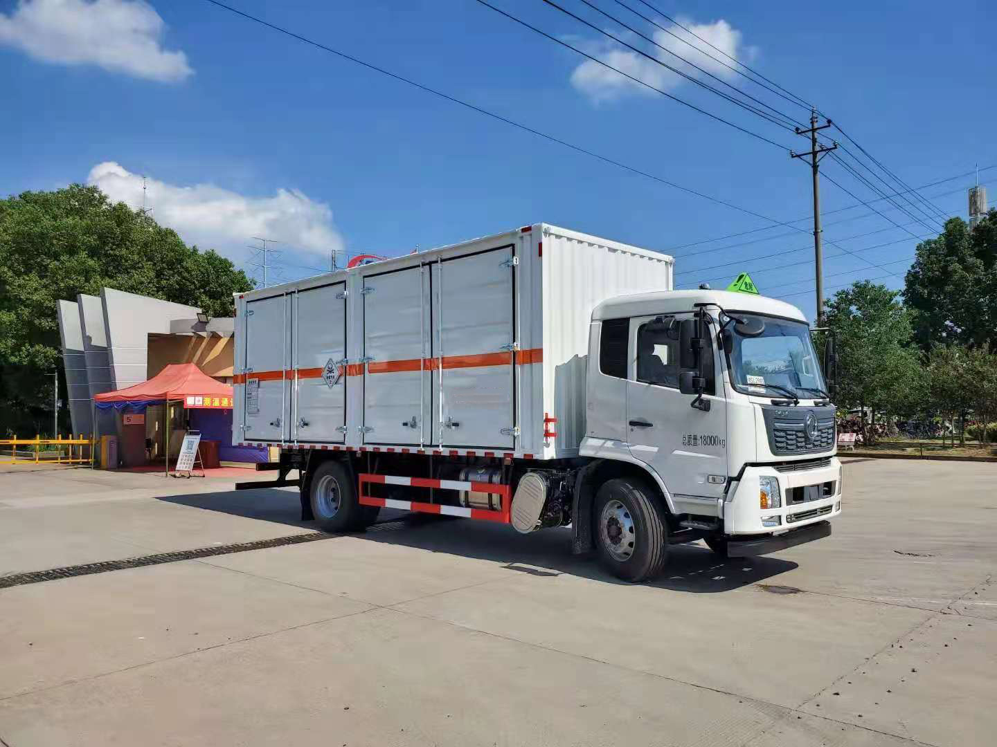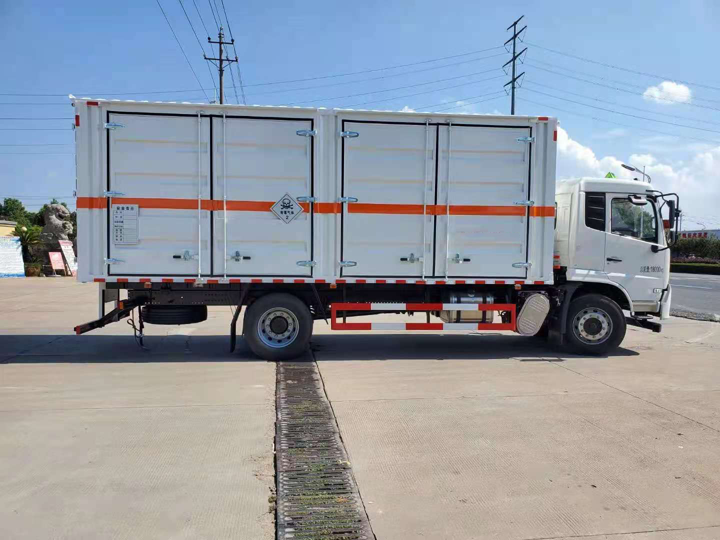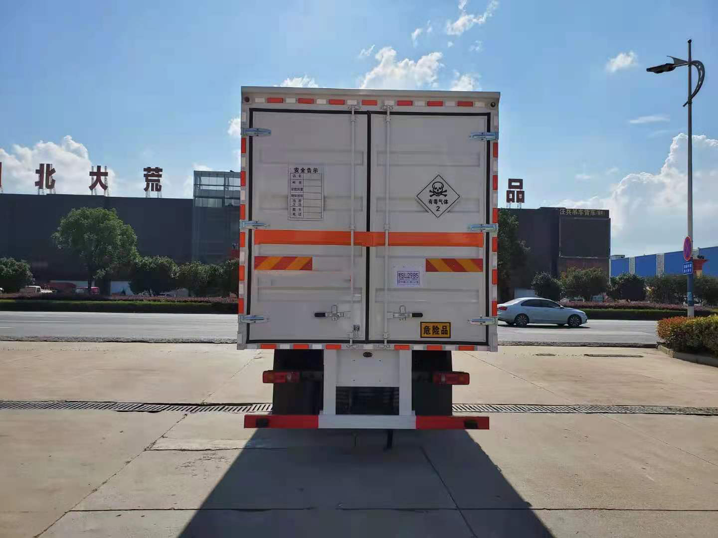 6.8米國六東風(fēng)天錦毒性氣體廂式運(yùn)輸車(2類3)廂體尺寸:6800*2450*2400(mm),廂體采用瓦楞板結(jié)構(gòu),瓦楞板厚度1.2mm,廂體底部鋪設(shè)防靜電膠皮。內(nèi)部有固定貨物的臥環(huán),副駕側(cè)帶兩個(gè)雙開側(cè)門,該車配有車載專用煙霧報(bào)警器及后門防盜器,有靜電帶、滅火器、防火罩。整車國標(biāo)反光標(biāo)示及警告標(biāo)志。