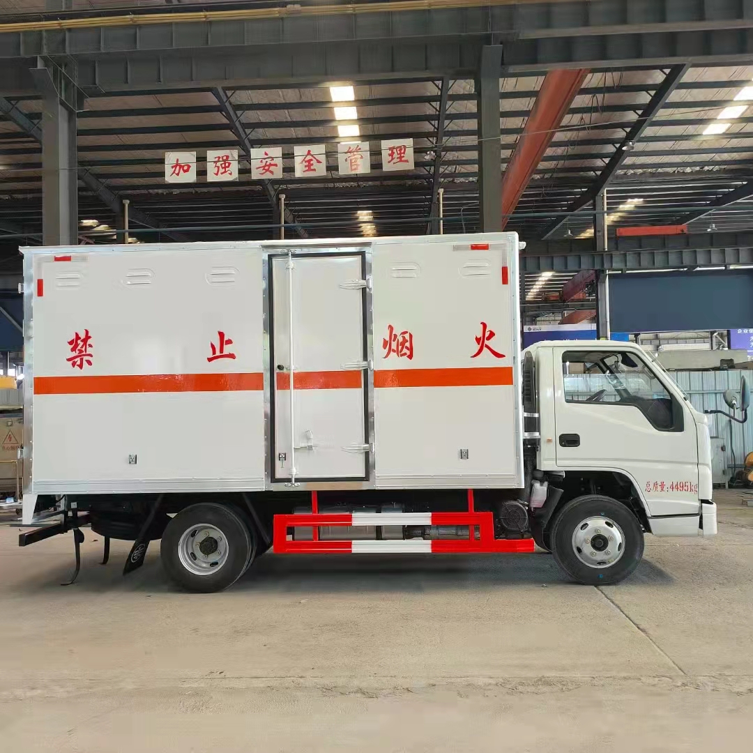 2)上裝定制要求:貨廂尺寸:4150×2050×2000(mm);整車尺寸:5995×2150×3030 (mm);白色;總質量:4495kg。側門:右側居中單開。廂體采用金屬骨架:外板采用冷軋鋼板及一次性成型的百葉窗,夾層為矩形管架焊接固定和阻燃材料填充,內飾為鋁板蒙面,有透氣孔;加裝臥環2排;底板δ3mm,底板上鋪防靜電膠皮;廂體內加裝安全防盜報警器、煙火探測報警器;其他標配:靜電帶、安全告示牌、危險品銘牌、反光標示及警告標志、滅火器、危險品頂燈、防火罩;嚴格按照國家公告尺寸、圖片等要求生產。