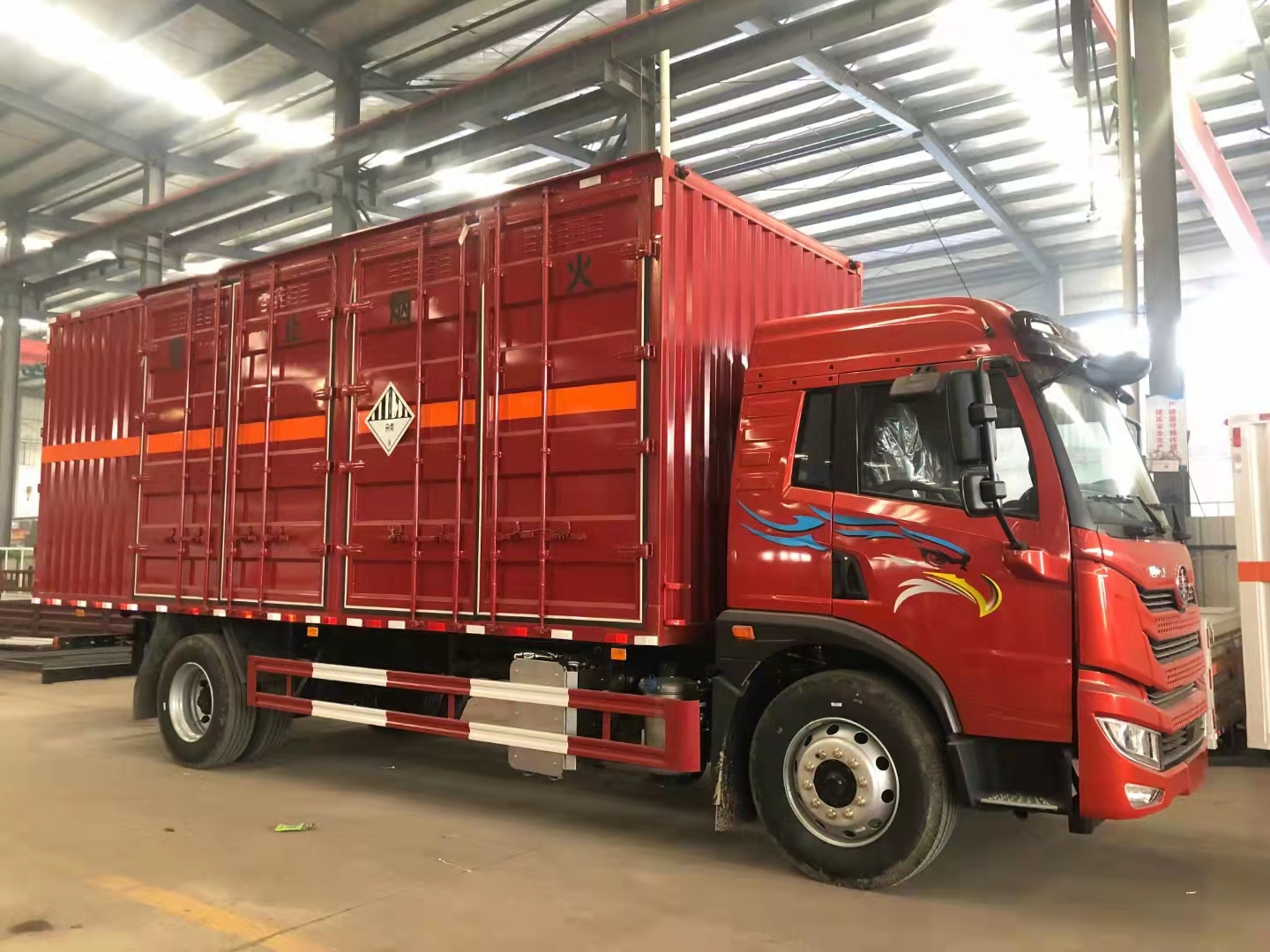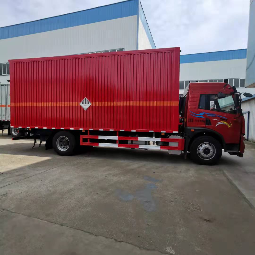 解放龍V翼展危廢車廂體采用瓦楞板,內部有固定貨物的防撞護板,該車配有車載專用煙霧報警器及后門防盜器,有靜電帶、滅火器、防火罩。整車國標反光標示及警告標志。按客戶要求加裝翼展廂體,廂體一側加裝翼展,右側二個對開門。