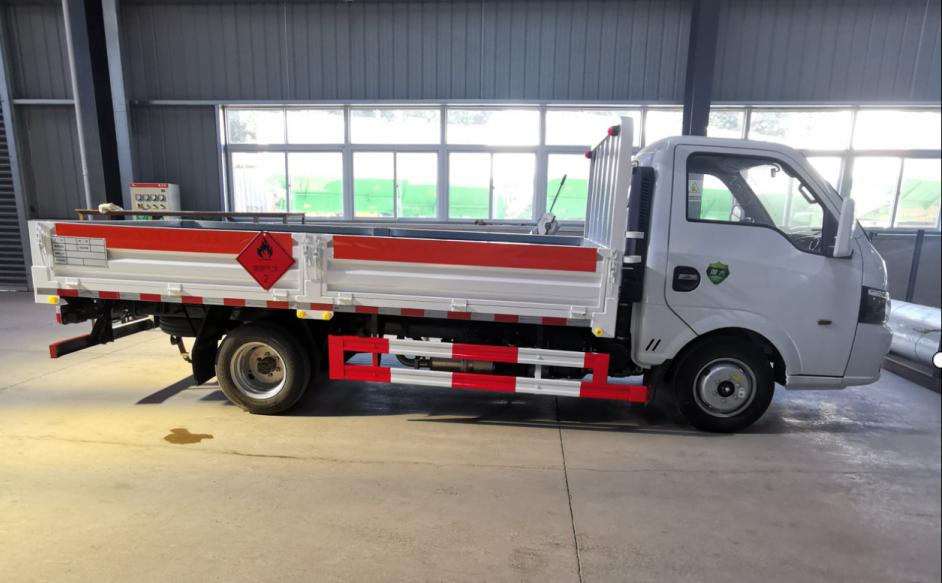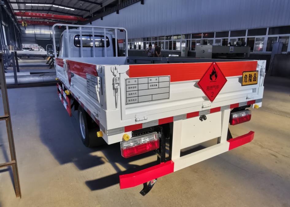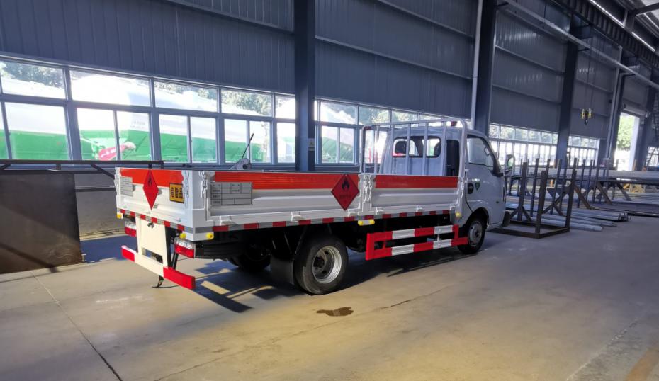 東風途逸邊板五開3米1氣瓶車貨箱采用的是邊2底3材質,鋪防靜電膠皮,可做活動式立柱高欄,按照易燃氣體標識粘貼。廂體外側安裝示廓標記燈以及手提滅火器,車身顏色白色,帶危險品三角頂置燈、“易燃氣體”或“不燃氣體”反光牌及反光標識。車輛顏色可選白色、紅色及藍色多款顏色。