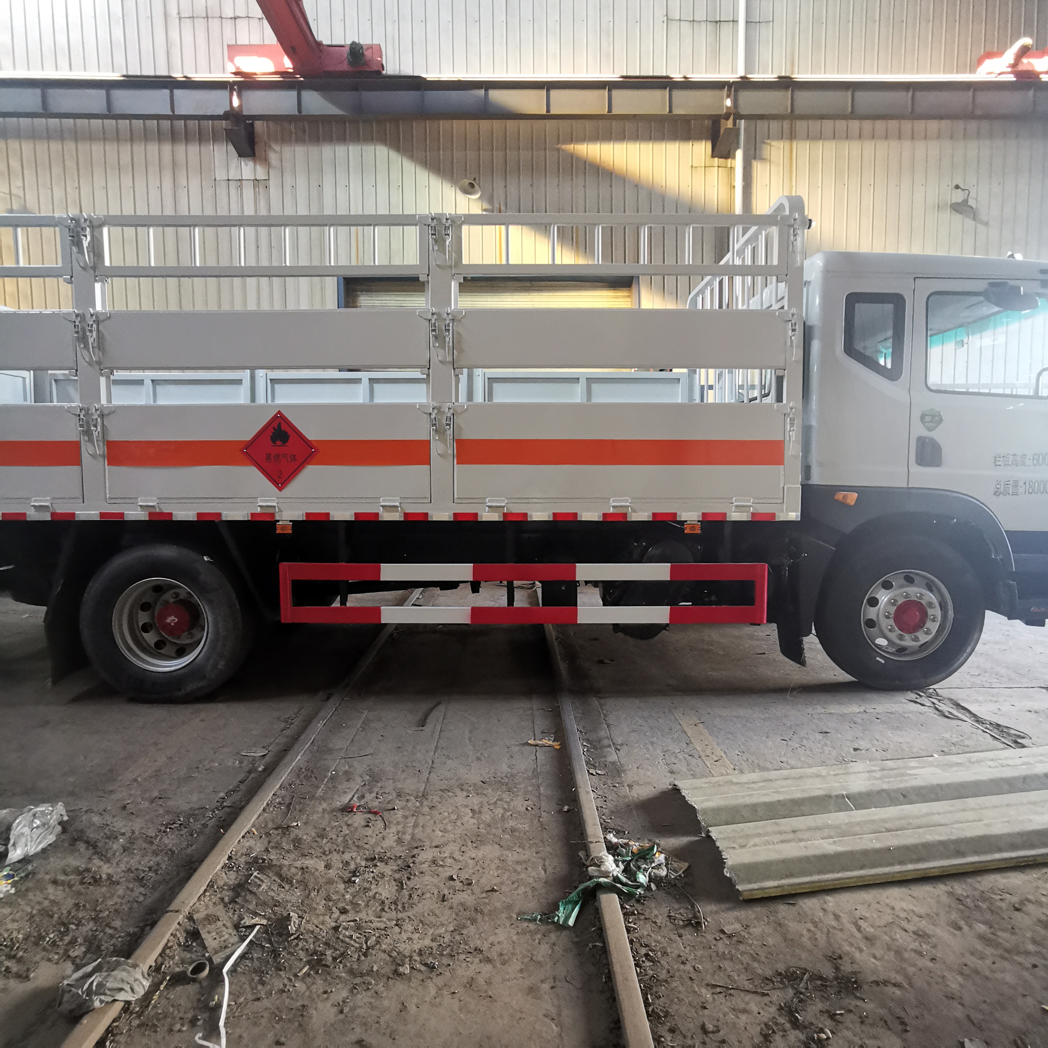 東風D9國六帶三層高欄氣瓶車采用國六東風多利卡D9危貨底盤(型號:EQ1185L9CDFWXP),汽剎&斷氣剎,康機230馬力發動機(B6.2NS6B230 ), 軸距4700mm, 前橋4.5噸,后橋10噸,標配295/80R22.5真空胎,陜齒8檔變速箱,原廠動力轉向、電磁熄火,ABS,原廠前盤碟剎制動,限速裝置,帶增壓,原廠空調,氣囊橋,防爆胎/前碰撞預警/車道偏離提醒/胎壓監測/EBS/ESC/AEBS。