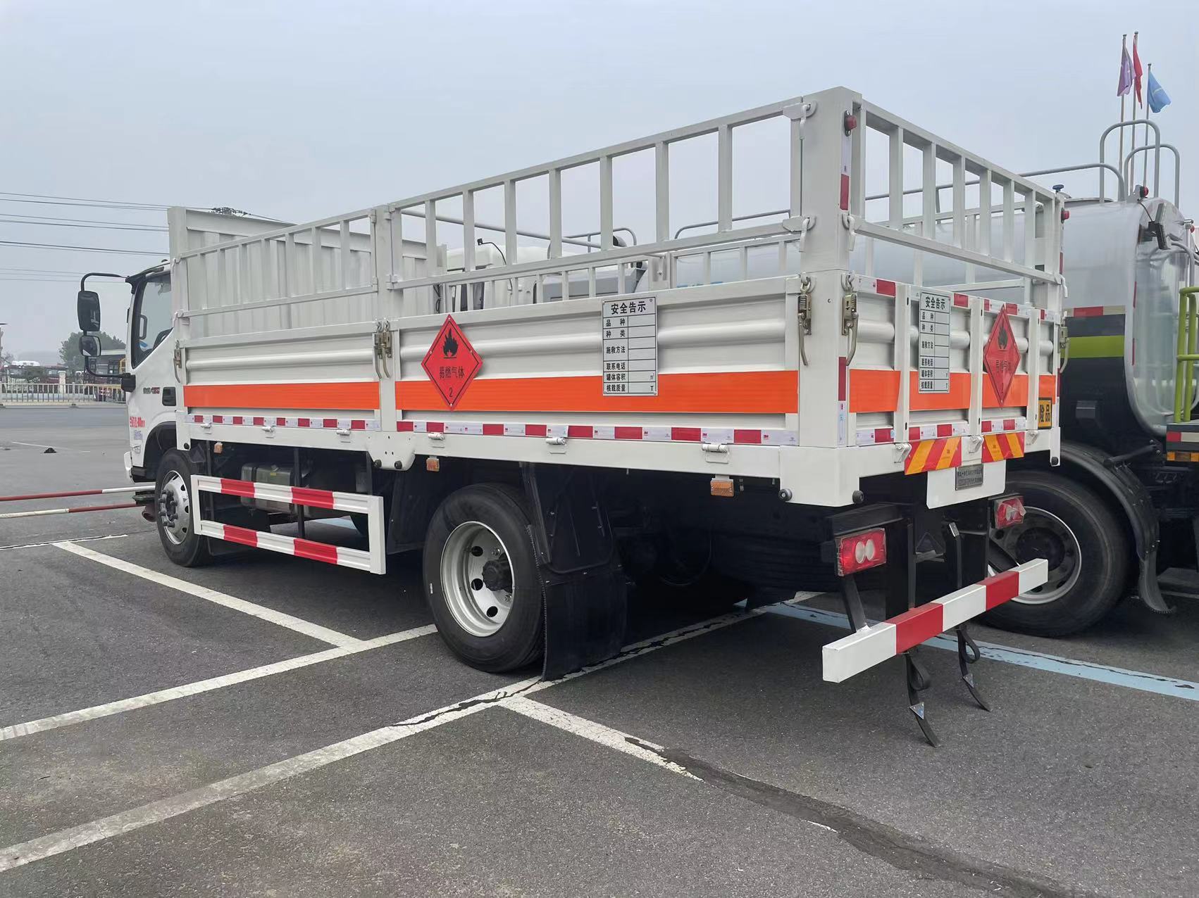 福田奧鈴國六5米1 可拆卸式高欄氣瓶車箱體標(biāo)配3個(gè)厚的花紋板,副梁標(biāo)配120的槽鋼,龍門架為100的槽鋼,墻板厚度為1.2個(gè)厚的冷軋板,廂體內(nèi)部選裝固定貨物的卡槽,橫梁間距為320CM,底板配有靜電膠皮,選裝液壓尾板,底板加厚,橫梁加密,上部高欄中部打斷或底板立柱打斷,選裝瓦倫板結(jié)構(gòu)墻板,平面板結(jié)構(gòu)墻板,(可拆卸),選裝上部花欄上下翻轉(zhuǎn)或左右開啟.整車按照公告要求張貼反光標(biāo)識,危險(xiǎn)品標(biāo)牌,安全告示等,靜電尾帶兩根,防火帽,隨車滅火器(一對),按照公告要求張貼“易燃?xì)怏w”“不燃?xì)怏w”標(biāo)識。