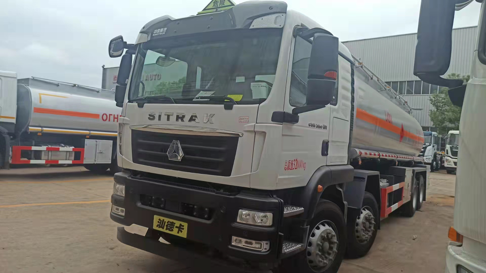 汕德卡國六前四后八甲醇運輸車采用的是平頂駕駛室,350馬力發動機,9檔變速箱,軸距1800+4575+1400mm,轉向輪爆胎應急裝置;選裝倒車蜂鳴器;選裝胎壓監測系統;選裝危險品標志燈。公告有效容積:24.3立方,罐體尺寸:8800×1980mm,正圓形罐體,國標厚度,分雙倉,帶甲醇化工泵,泵進泵出在尾部,兩個甲醇專用罐口、兩個海底閥,帶語音提示報警裝置,帶兩套安全閥及爆破片,帶真空閥,介質:甲醇,乙醇,丙酮,異丙醇。