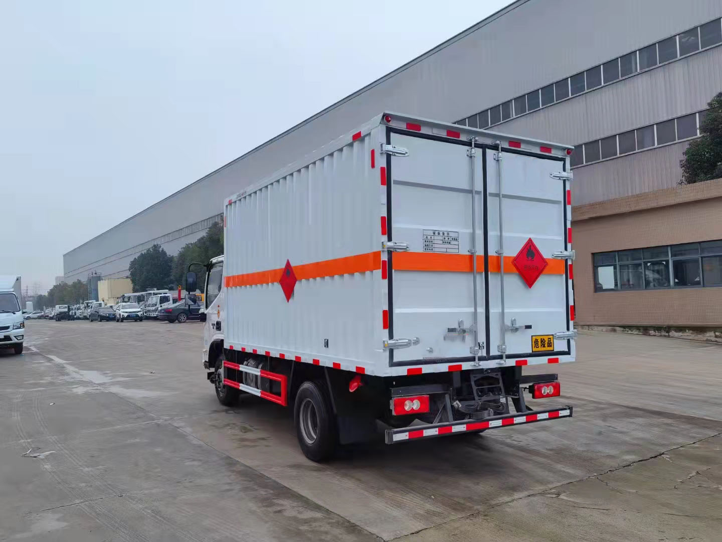 福田歐馬可黃牌4米2帶雙側門危險品車整車型號:CSC5088XRQBK6,貨廂4.08米,核載4.3噸,發動機可選康機3.8排量156馬力或康機2.8排量156馬力。 福田歐馬可黃牌危險品廂式車采用福田歐馬可專用危險品車底盤,3800mm軸距,福田歐馬可寬體駕駛室,康明斯156馬力發動機,6檔變速箱,6.5噸后橋,9R22.5 14PR輪胎,斷氣剎,中控鎖,電動門窗,多功能方向盤,定速巡航,空調,前碰撞預警,軌道偏移預警。整車尺寸:7180×2350×3400mm,廂體尺寸:5150×2200×2080mm,廂體嚴格按照公告尺寸制作,外板采用1mm厚冷軋板有一次性成型的百葉窗,內飾為導電性能良好的鋁板有透氣孔,內襯為矩形管骨架牢靠穩定,內部填充為透氣防潮阻燃的擠塑板,四種材料經現代工藝復合而成,廂體外部上下鋁合金型材包邊,底板和車廂前下部鋪橡膠皮,后門雙開,右側前部單開門,內部有固定貨物的臥環,車輛外部有靜電帶、滅火器、防火罩,車廂內安裝煙霧提示器和門防盜提示器,嚴格按照國家危險品相關法規張貼。