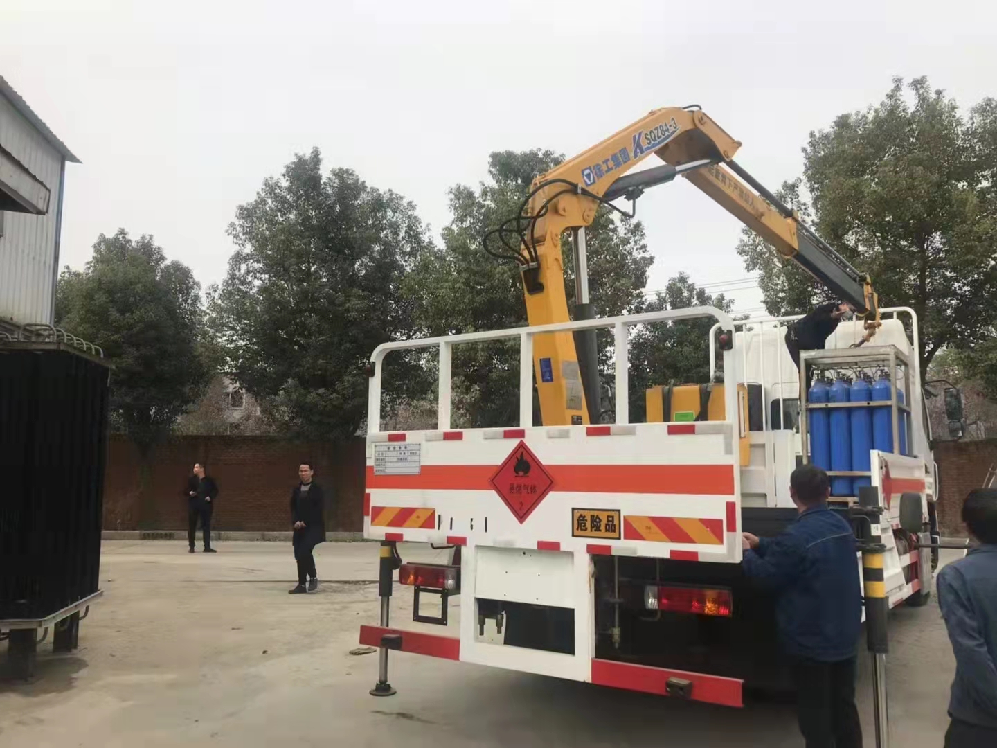 柳汽帶吊氣瓶車整車尺寸:9000×2550×2980mm,廂體尺寸:5600×2420×600mm。嚴格按照公告尺寸制作,底板采用5MM花紋板制作,底板上鋪靜電膠皮,低欄瓦楞式,配備滅火器,三角頂燈,靜電拖帶等,嚴格按照國家危險品法規(guī)進行“易燃氣體”標識粘貼等,帶徐工吊(4噸3節(jié)折臂)。